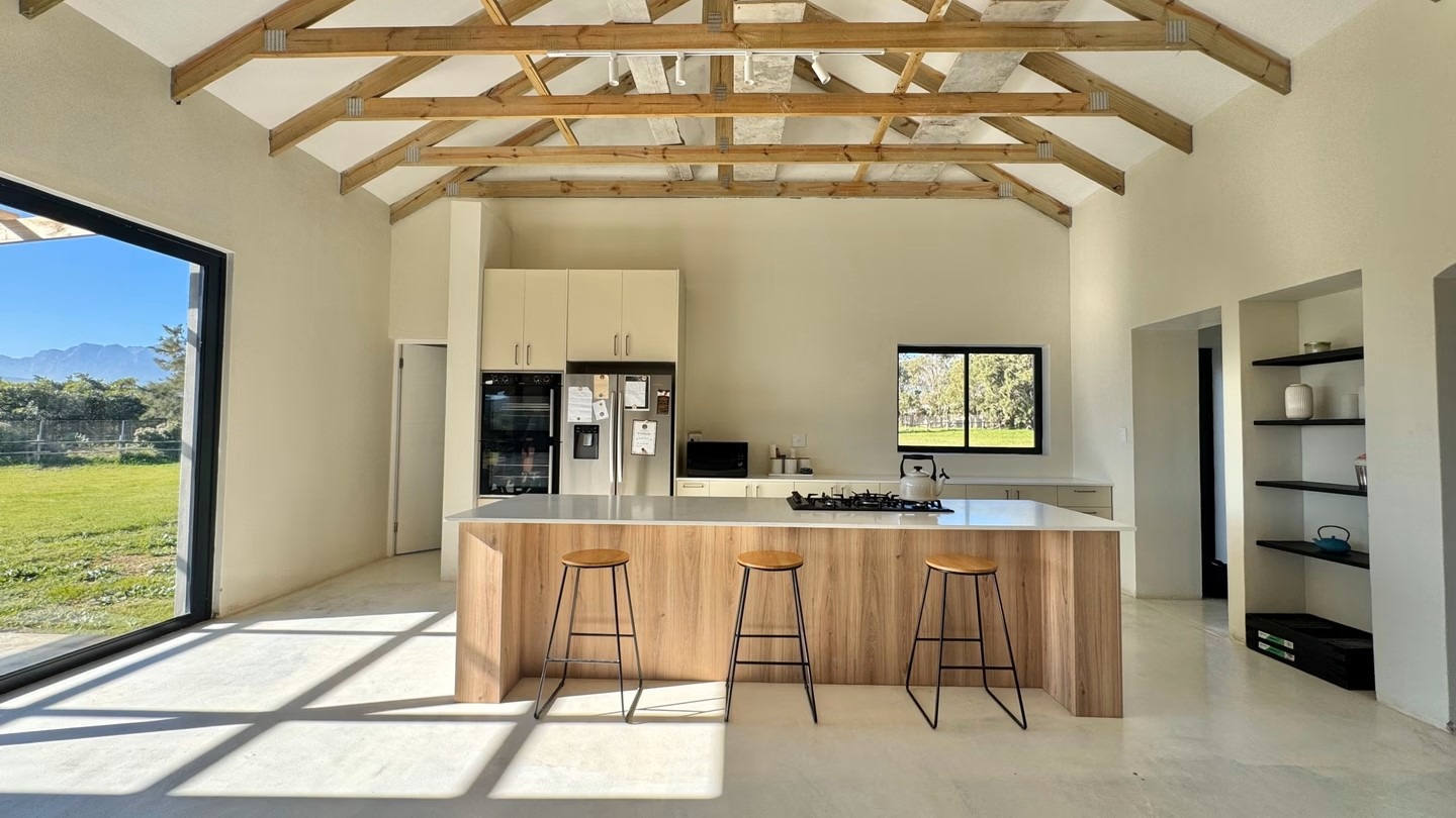 Set against the dramatic backdrop of the Hottentots Holland Mountains, this newly completed residence offers an exceptional balance of modern refinement, natural beauty, and complete self-sufficiency. Positioned on a generous smallholding in the heart of the Cape Winelands, the property enjoys far-reaching views across countryside, majestic mountains and to the ocean — a setting that delivers both visual impact and everyday tranquillity.