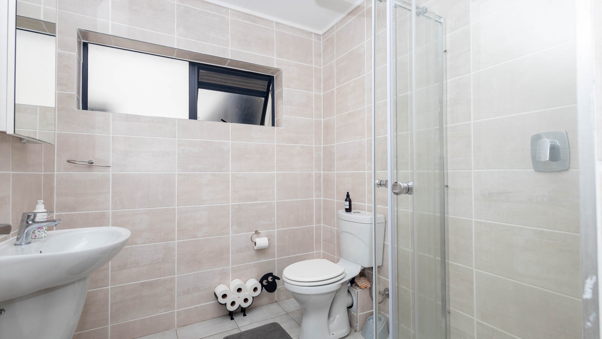 The compact yet highly functional kitchen is equipped with modern cabinetry, integrated appliances including a stove and oven, and a tiled backsplash, providing an efficient space for daily meal preparation. Built-in storage solutions are thoughtfully incorporated, ensuring a clutter-free environment. The bathroom is equally modern, boasting tiled walls and floor, a sleek pedestal sink, and a glass-enclosed shower, complemented by natural light and ventilation from a window.