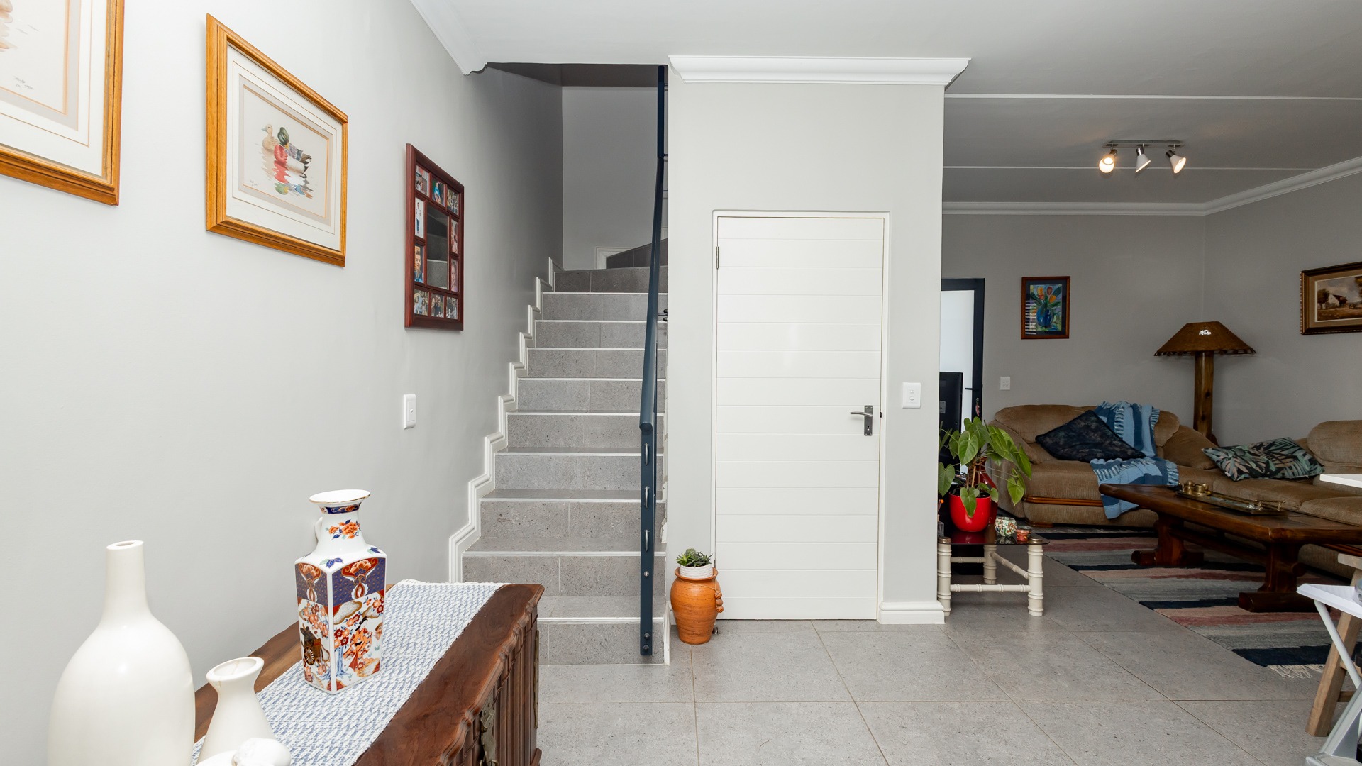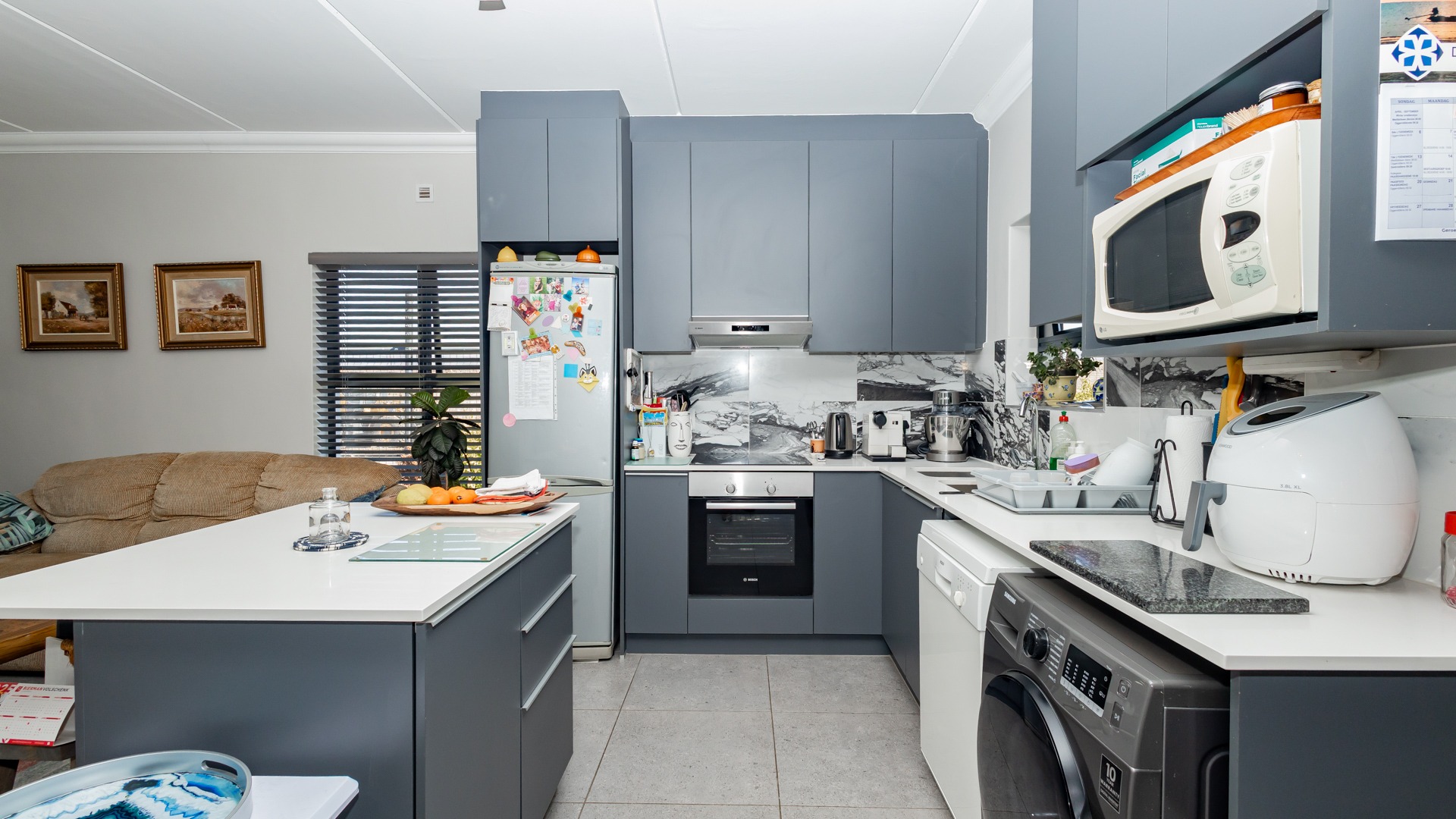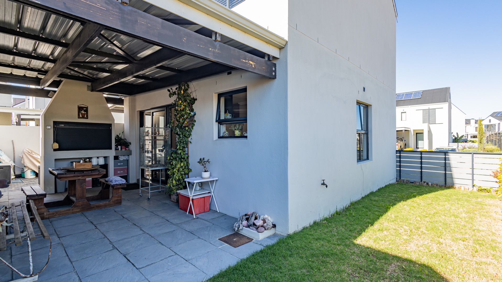 Designed with modern convenience in mind, this stylish home features an open-plan living and dining area on the ground floor, flowing effortlessly into a sleek kitchen equipped with quality finishes and ample storage. Guest toilet and basin for convenience. Sliding doors leading into an covered patio are with build in braai.