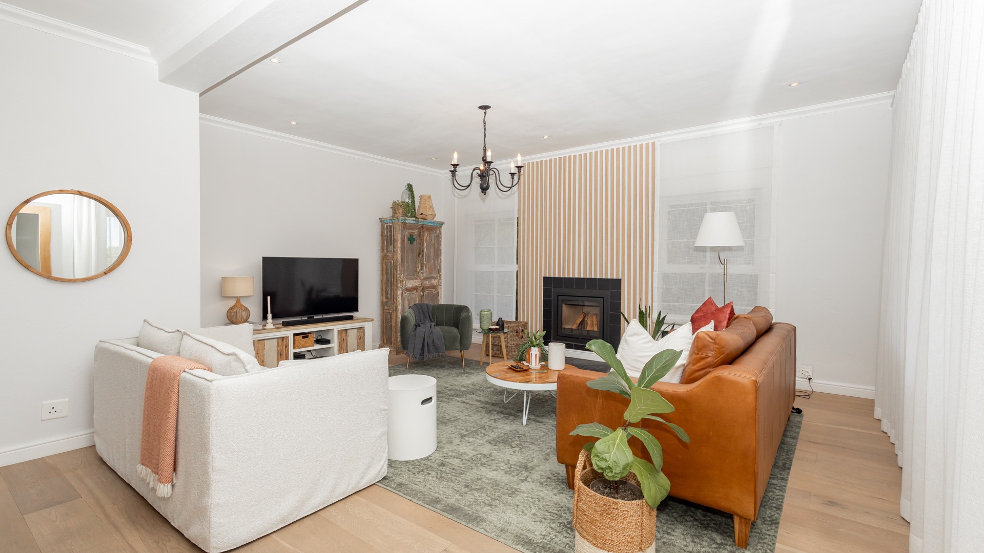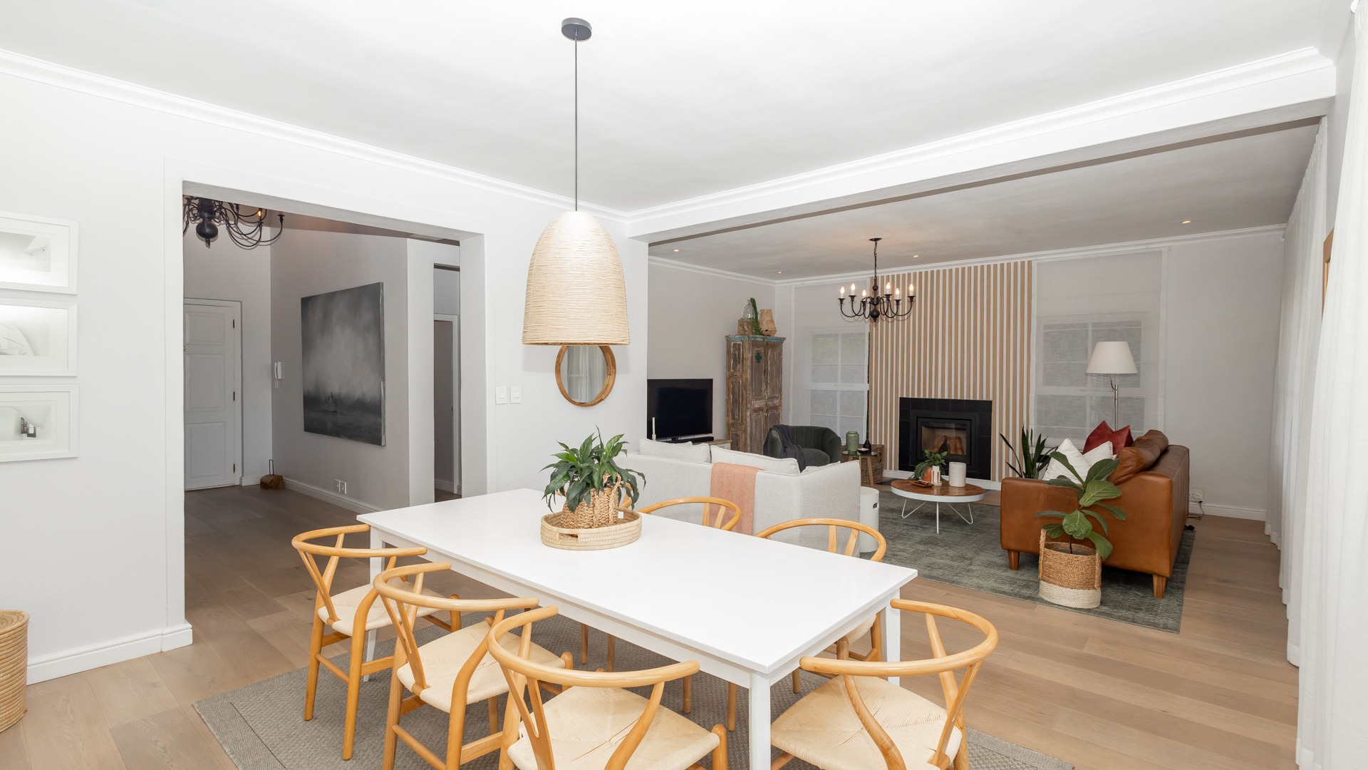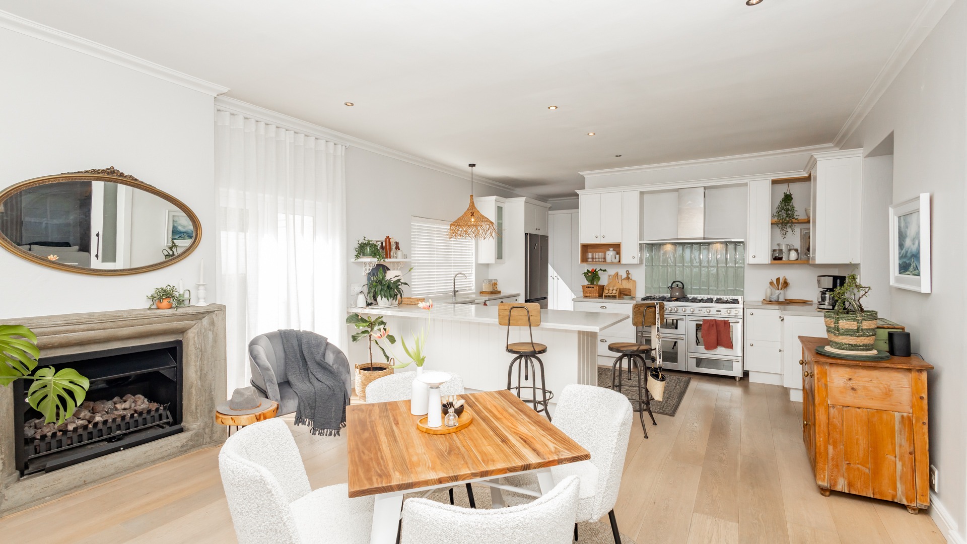 The home features air conditioning in all bedrooms and some living areas, and downstairs has beautiful engineered wooden flooring throughout. A soft white colour scheme on the walls and curtains makes the space feel bright and airy all day. There are also two fireplaces (one gas and one wood combustion) in the kitchen and lounge area.