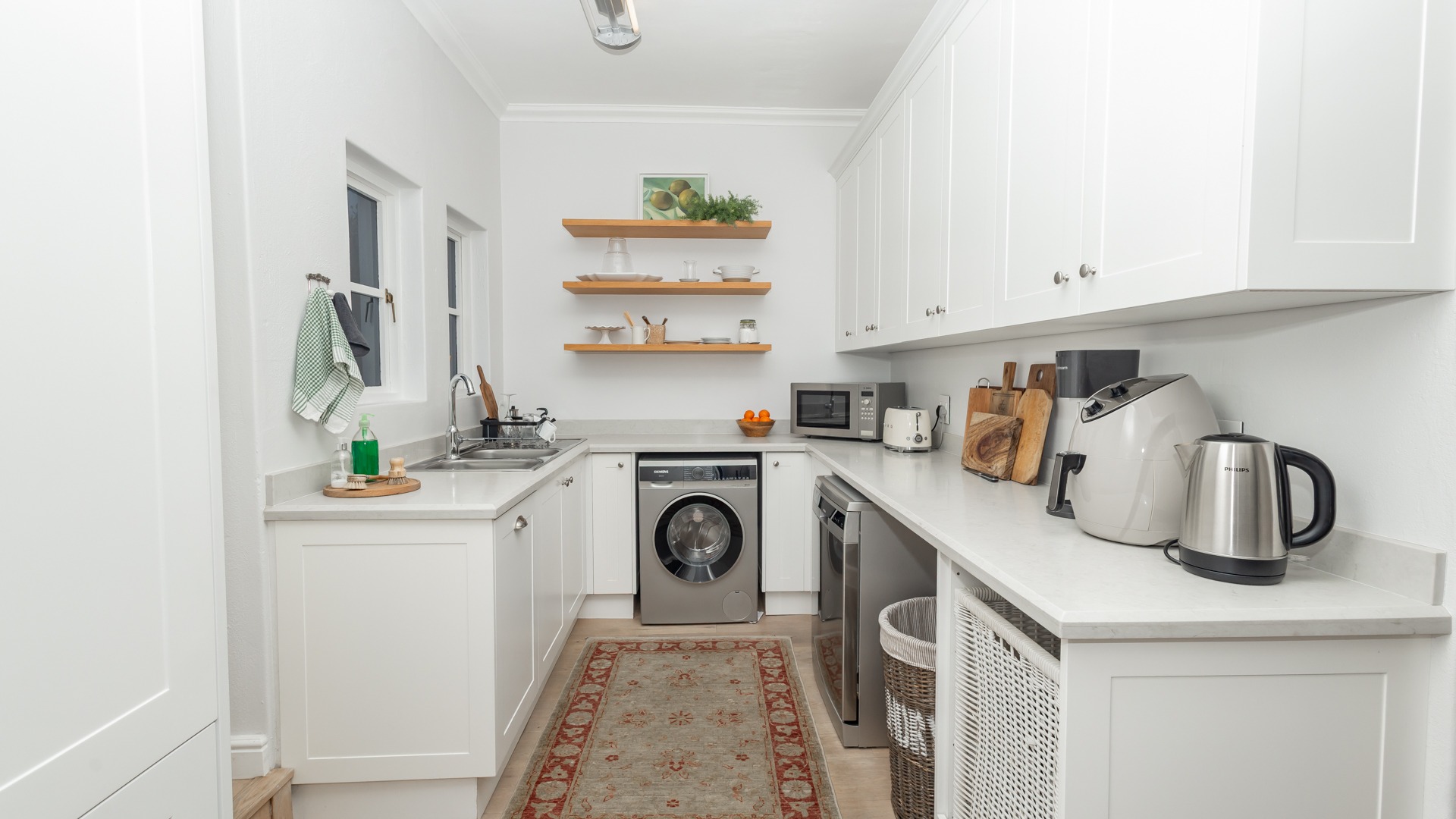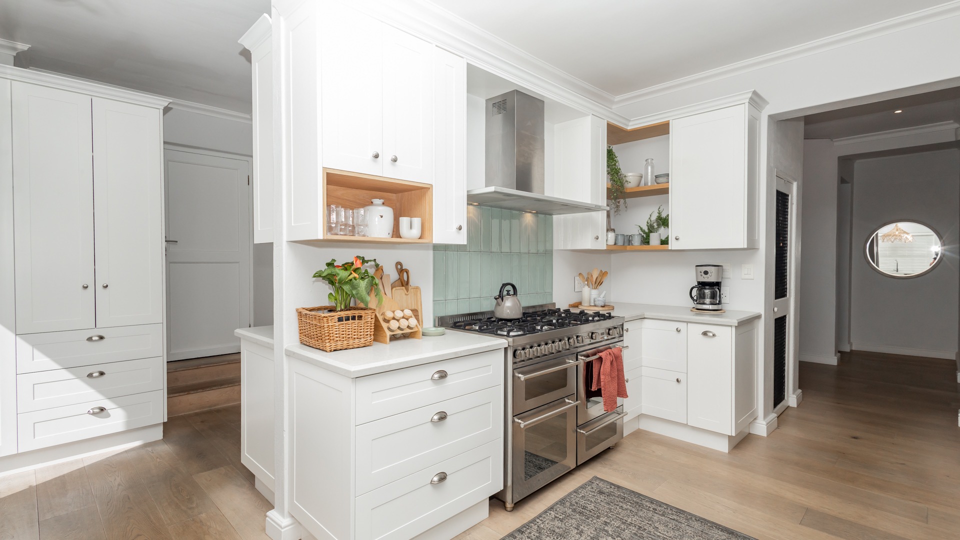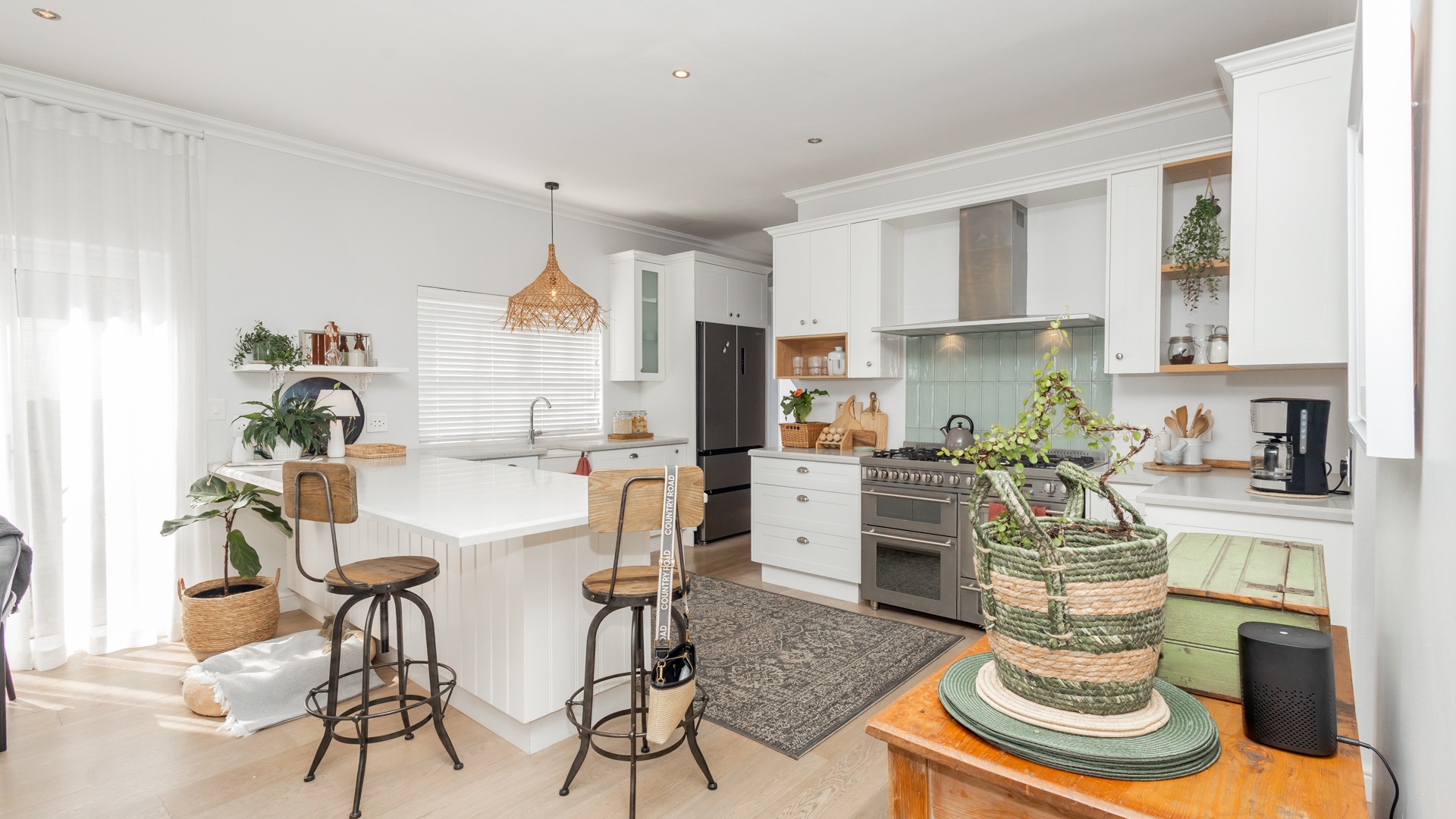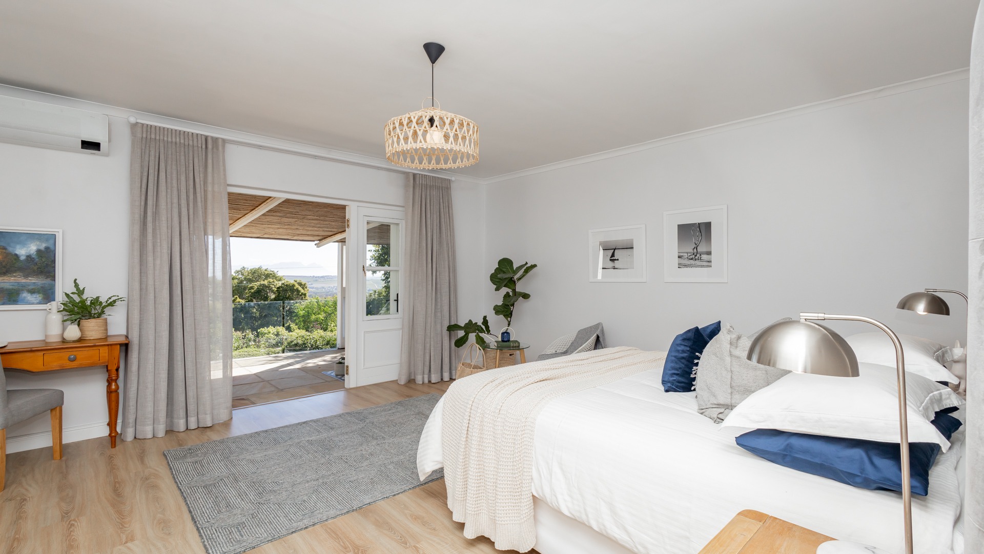 The home features air conditioning in all bedrooms and some living areas, and downstairs has beautiful engineered wooden flooring throughout. A soft white colour scheme on the walls and curtains makes the space feel bright and airy all day. There are also two fireplaces (one gas and one wood combustion) in the kitchen and lounge area.