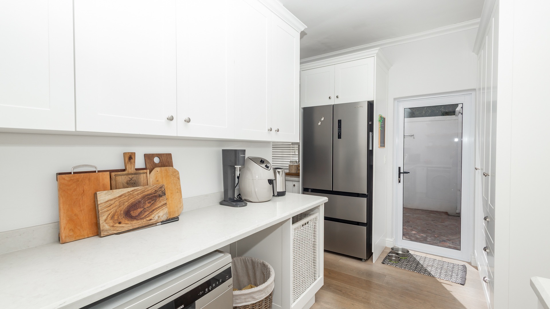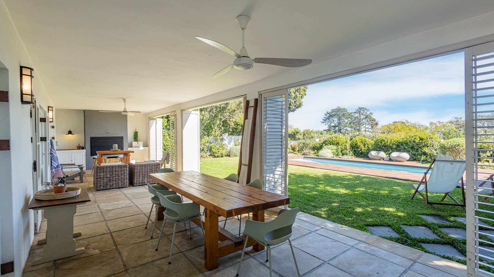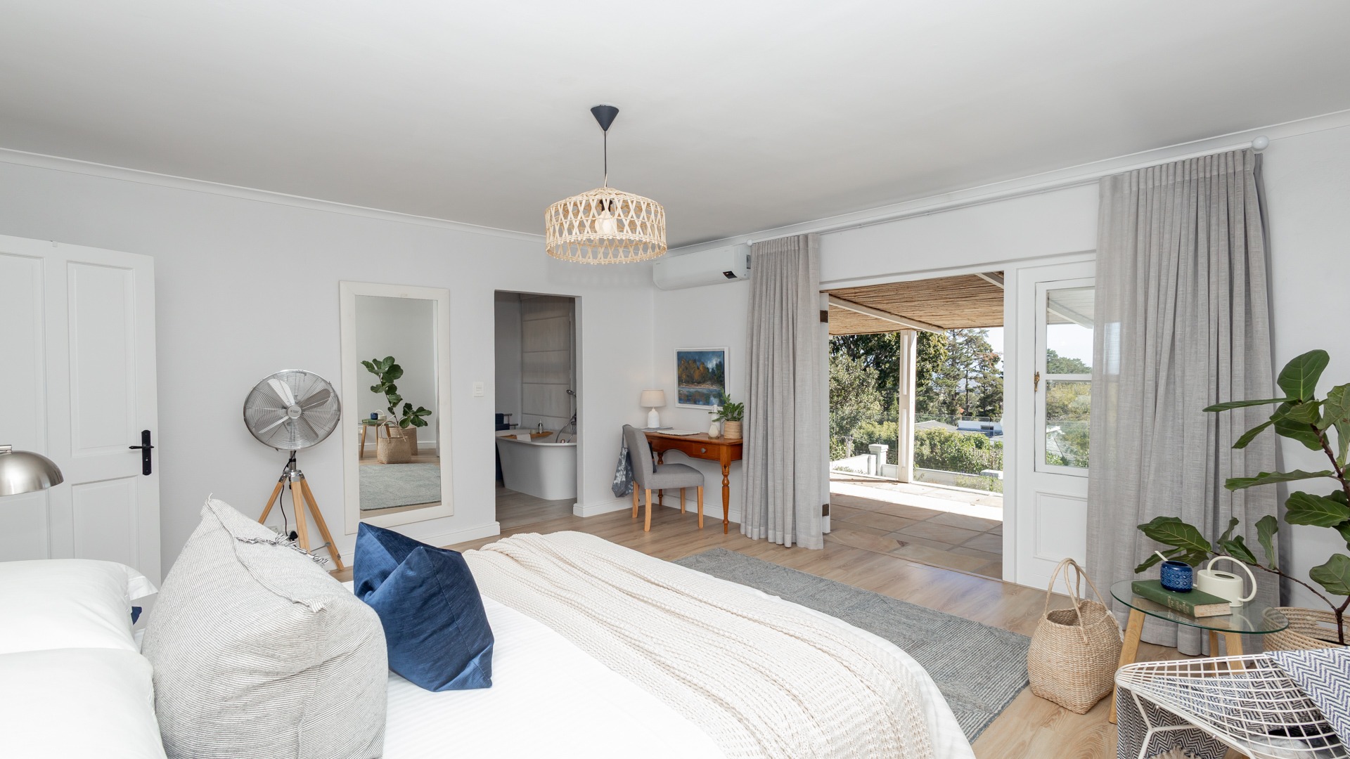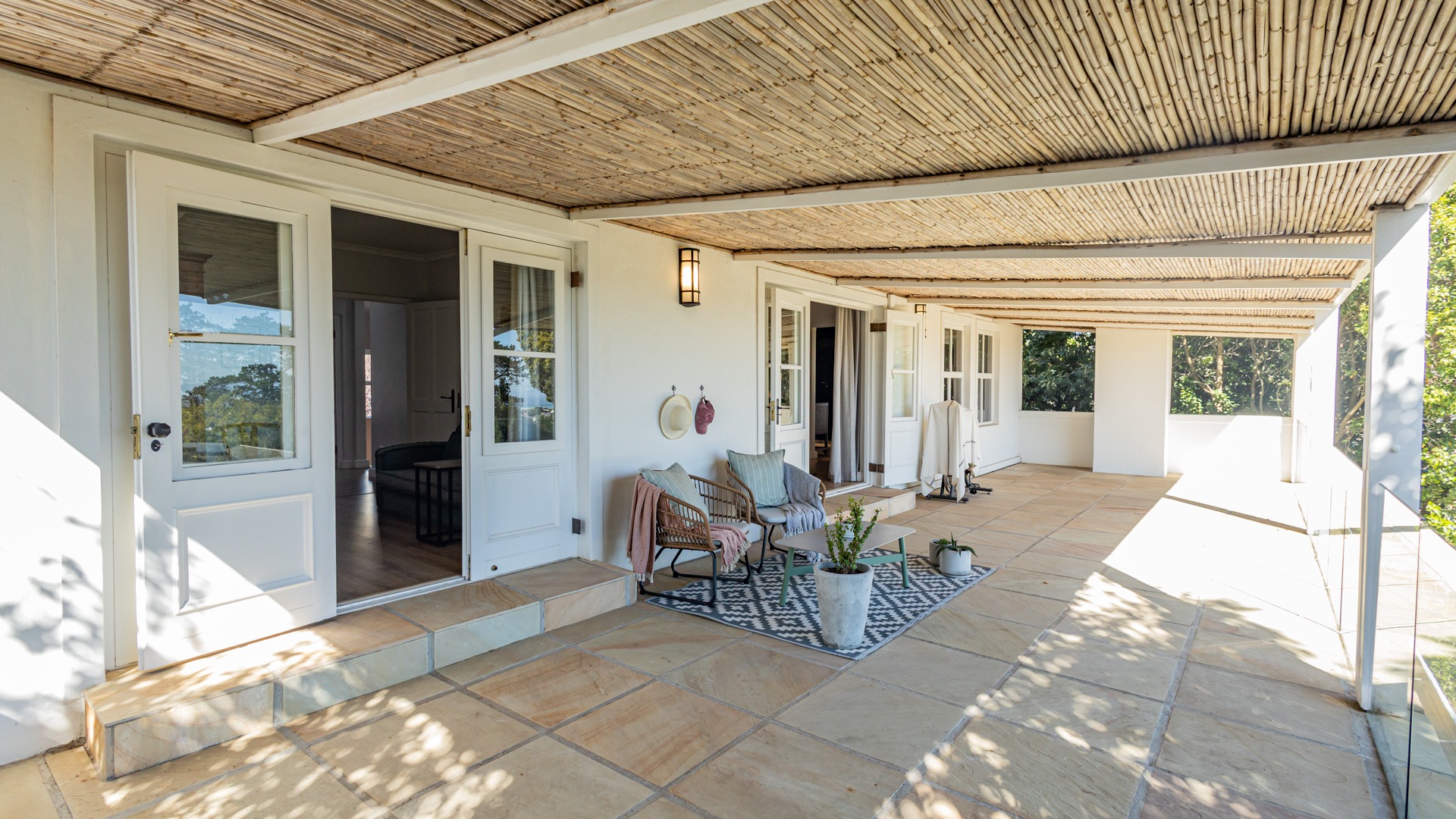 The upstairs rooms and home office enjoy lovely views of the ocean and Table Mountain, with stunning sunsets in the evenings. There’s also a second, separate outside room that’s currently used as another office.