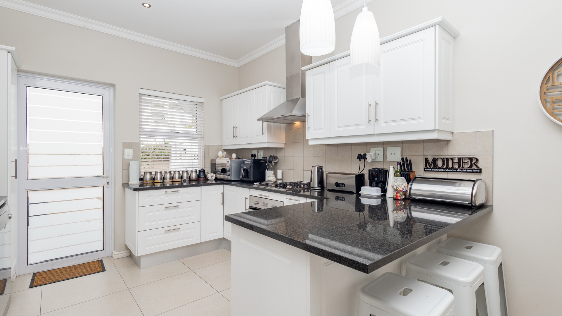 granite countertops, while the breakfast counter comfortably seats three,