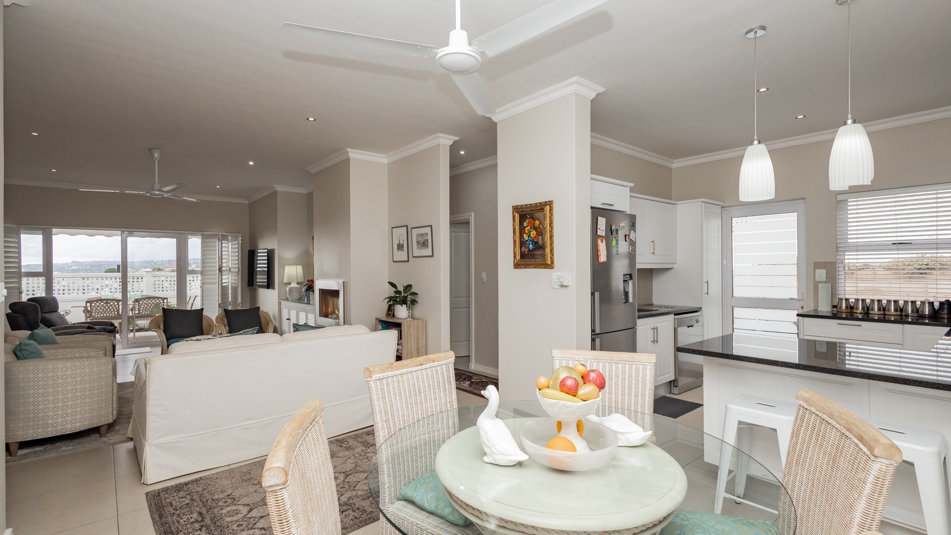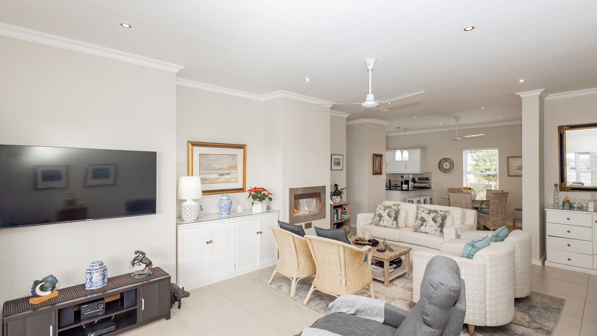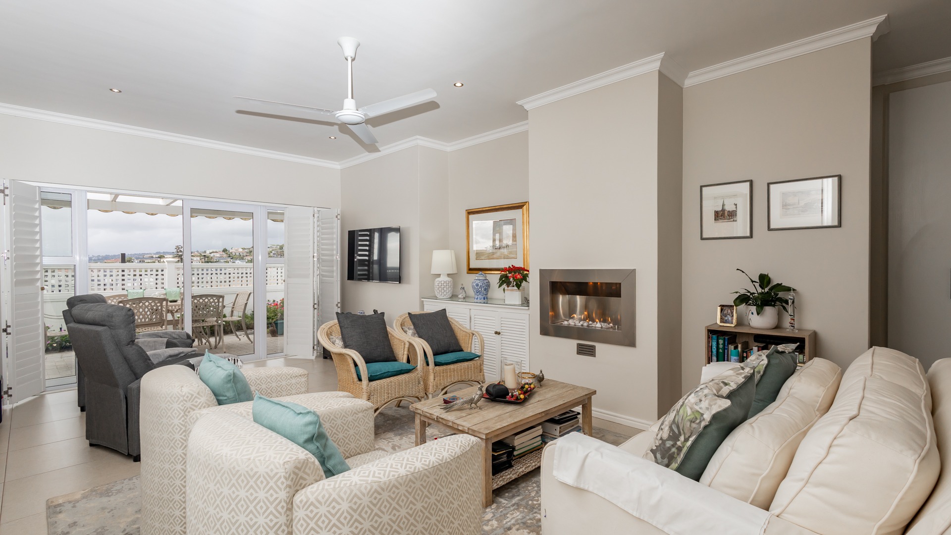 The spacious living area features a gas fireplace and flows seamlessly onto