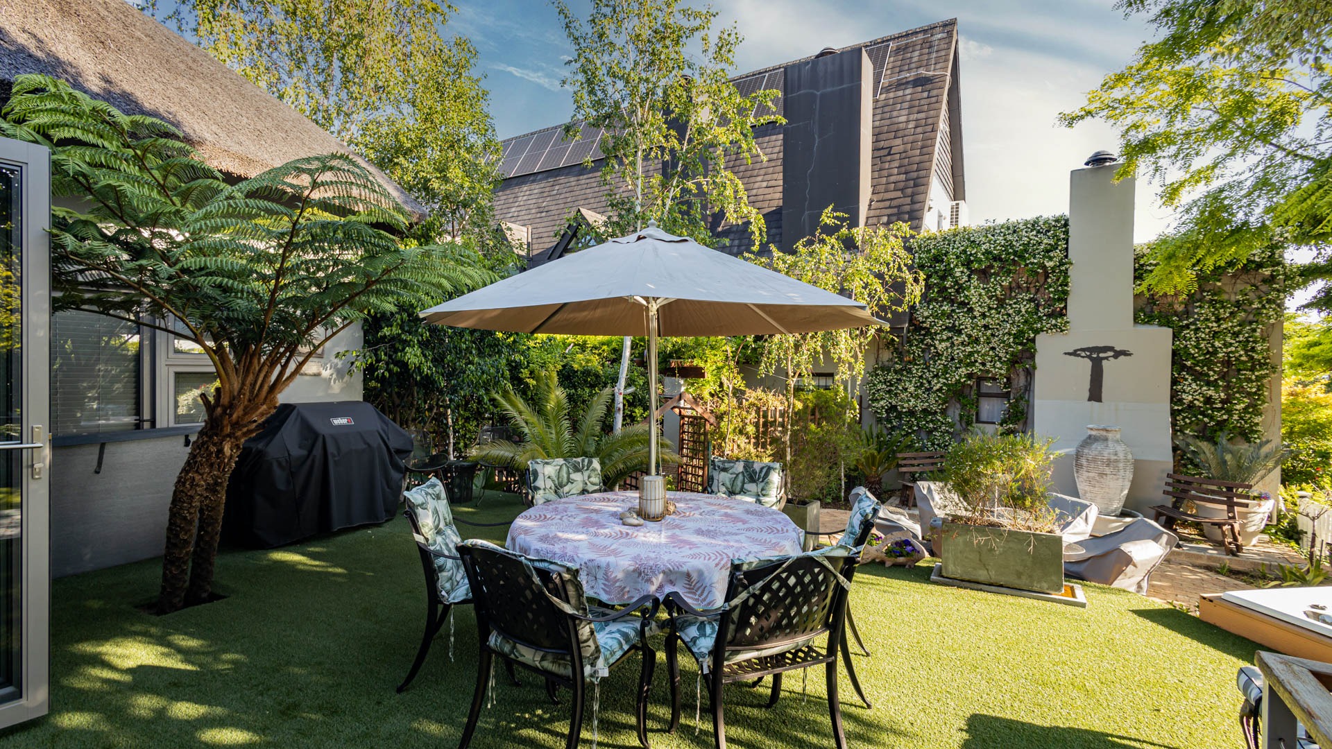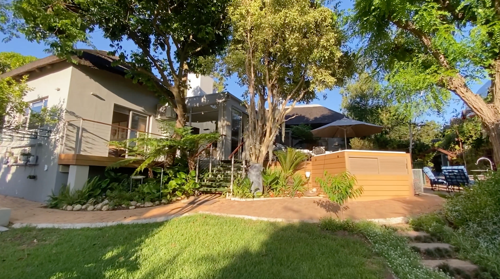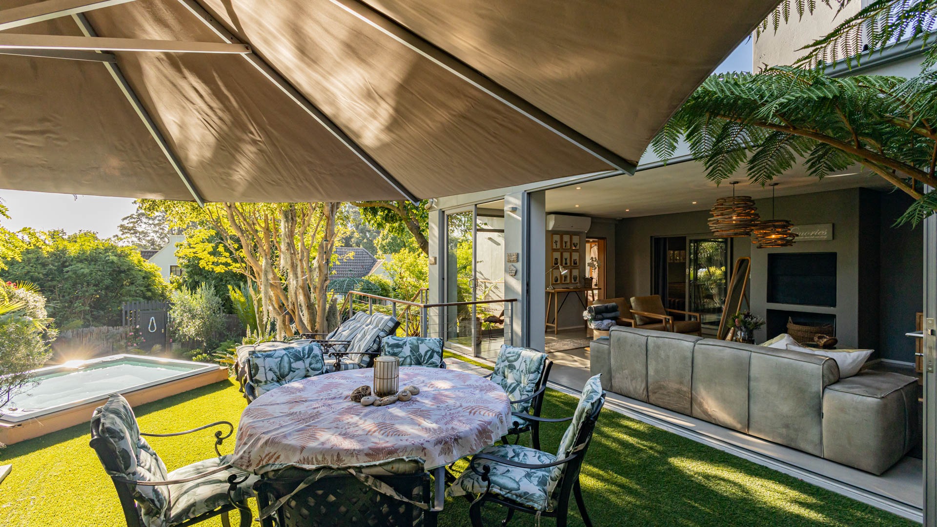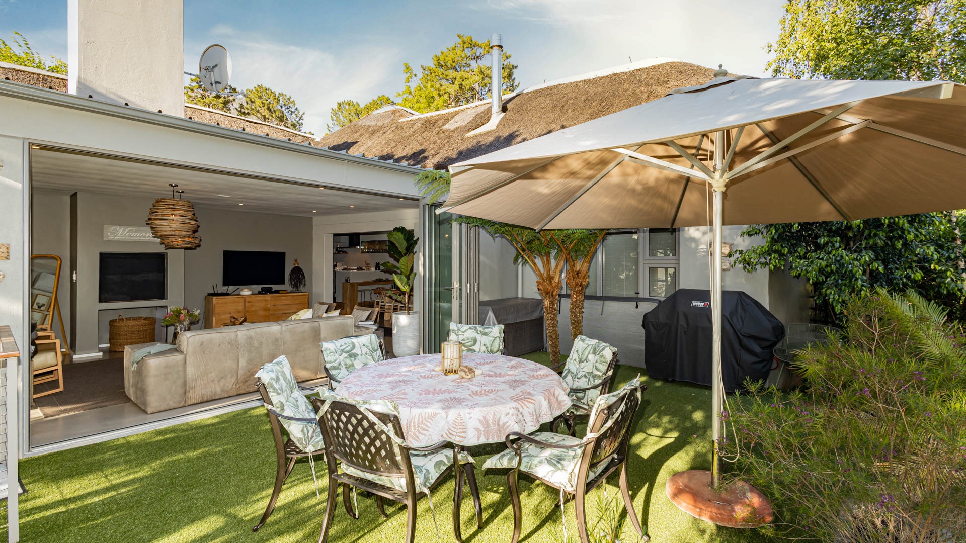 The home includes three en-suite bedrooms, a guest toilet, an open plan living and dining area, an indoor fireplace, an entertainment bar, as well as a separate laundry and scullery. Additional features include an air conditioner, alarm system, sprinkler system, Jacuzzi and its own inverter and battery. This home also has a successful history of high season short term rental income and can be sold fully furnished as shown, making it an easy turnkey investment or ready to move in residence.