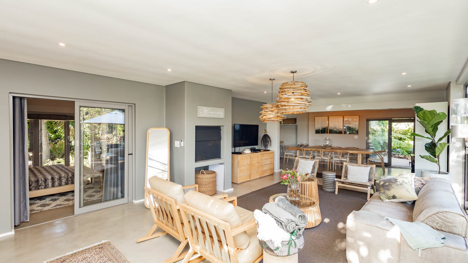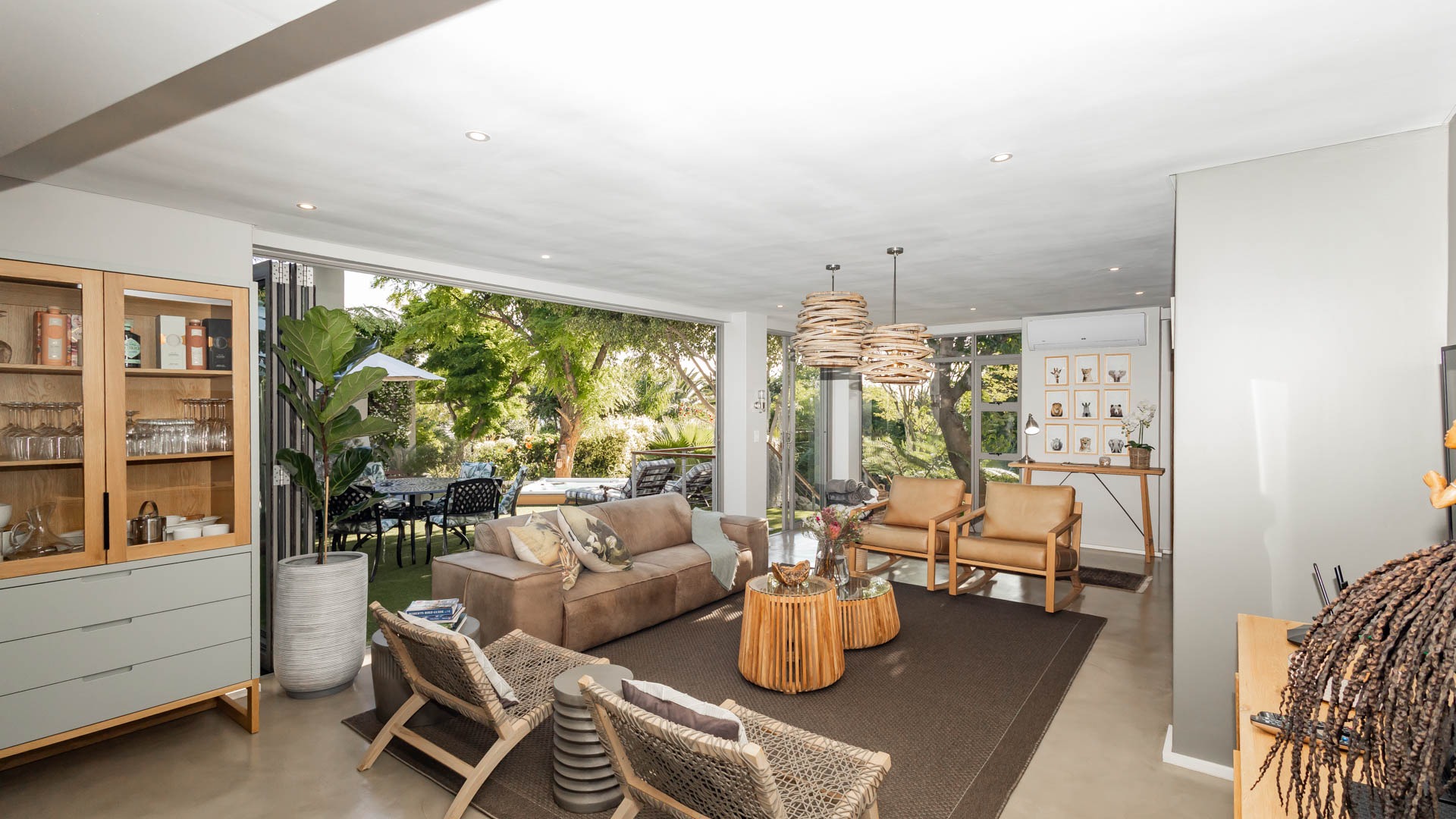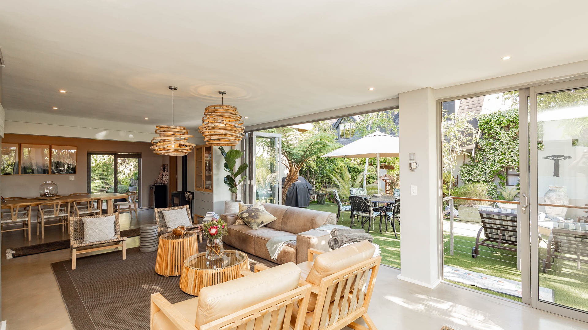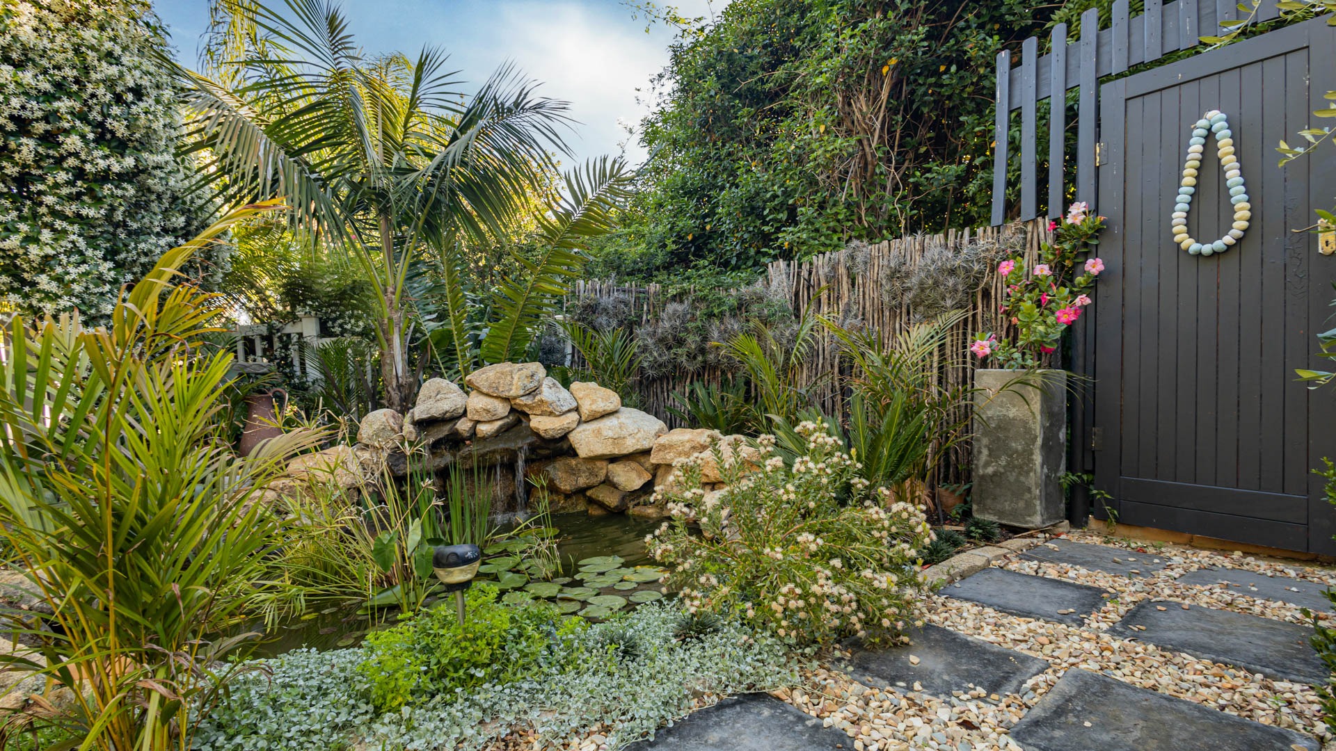 This home offers modern, light filled living spaces with beautifully curated interiors that flow to a tranquil deck and garden. Large windows and sliding doors open to lush greenery, outdoor seating spaces, landscaped walkways, water features and shaded areas that create a peaceful and private environment.