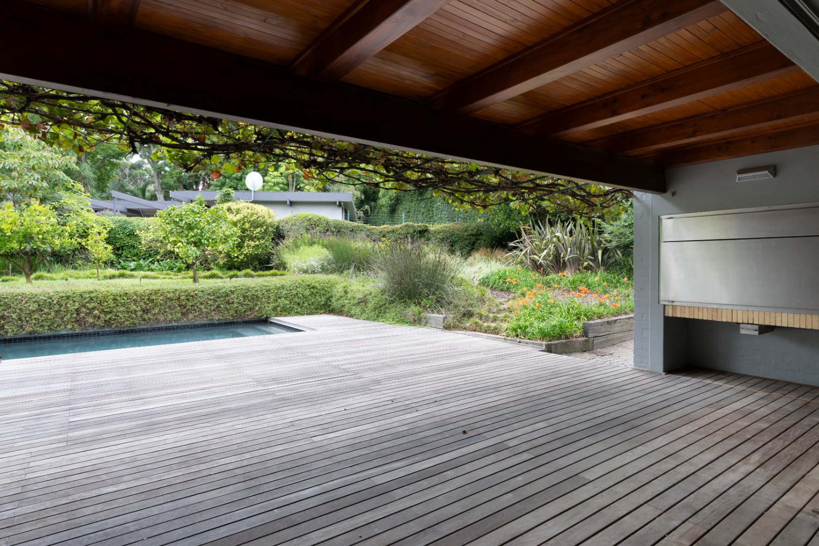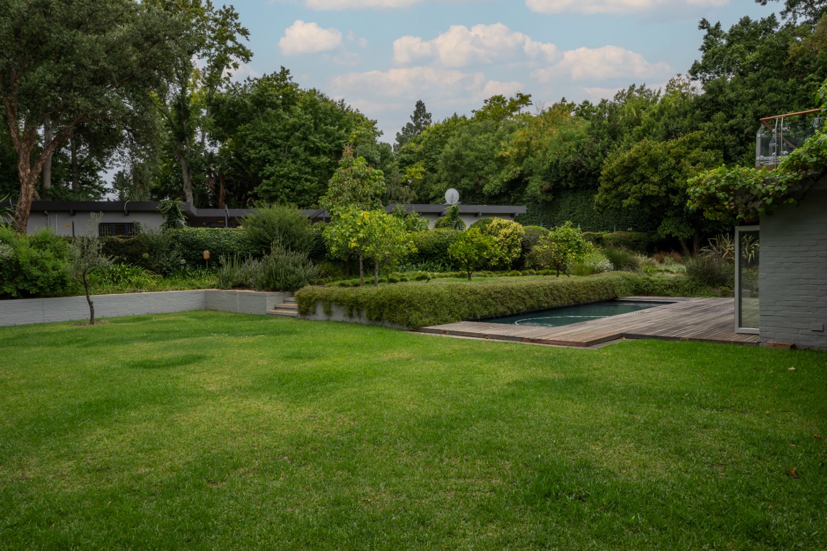 Outdoors, the property continues to impress with a striking 10x3 m charcoal gunite saltwater swimming pool wrapped by a 75 m2 wooden deck, perfectly positioned within the beautifully established and illuminated garden.