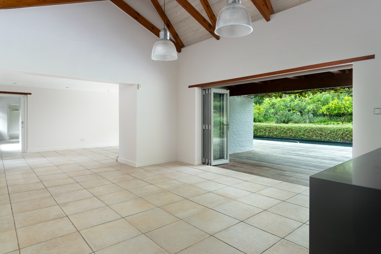 The covered patio overlooks the magnificent garden and swimming pool with a built-in stainless-steel braai equipped with an automatic rotisserie, making it ideal for effortless entertaining.