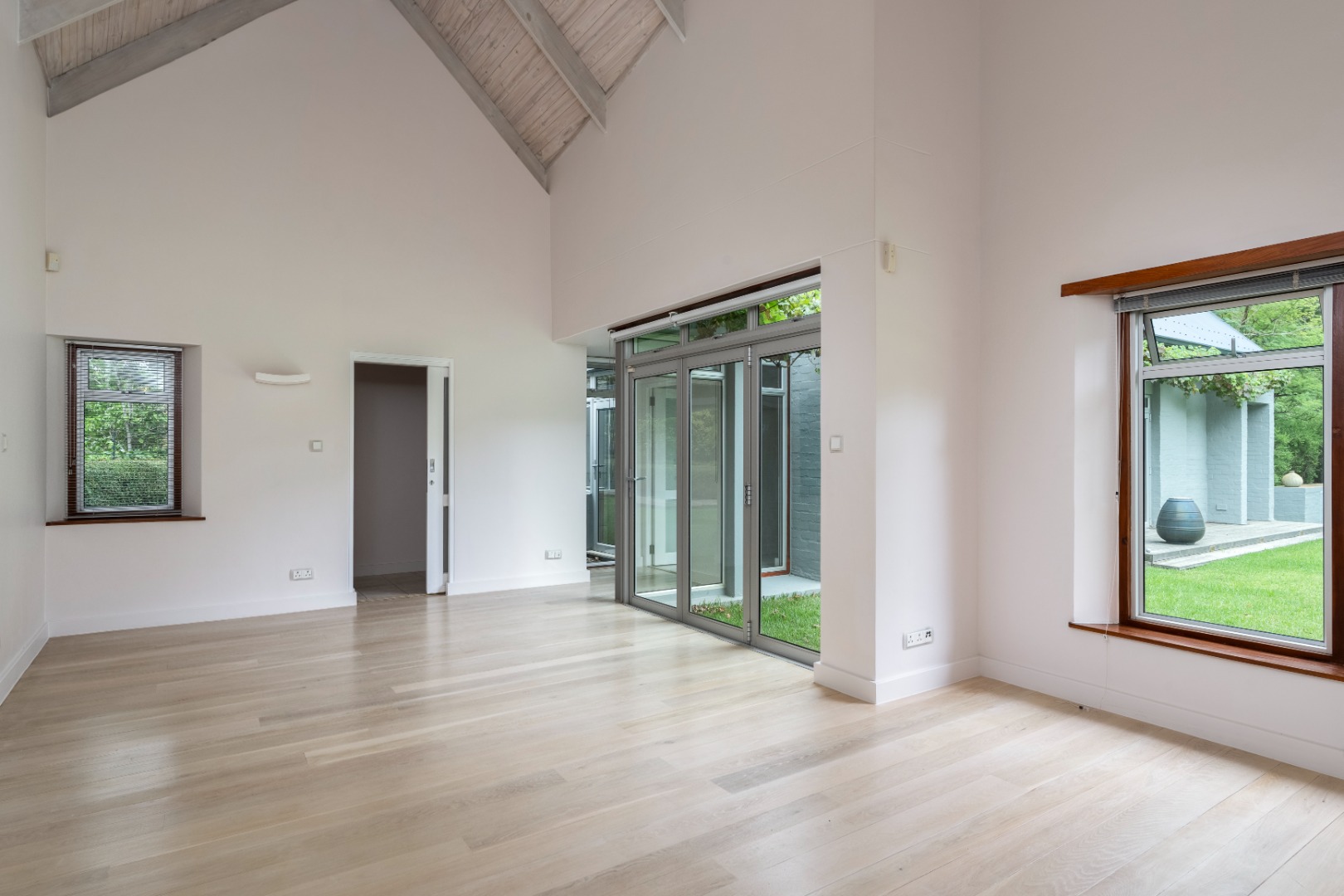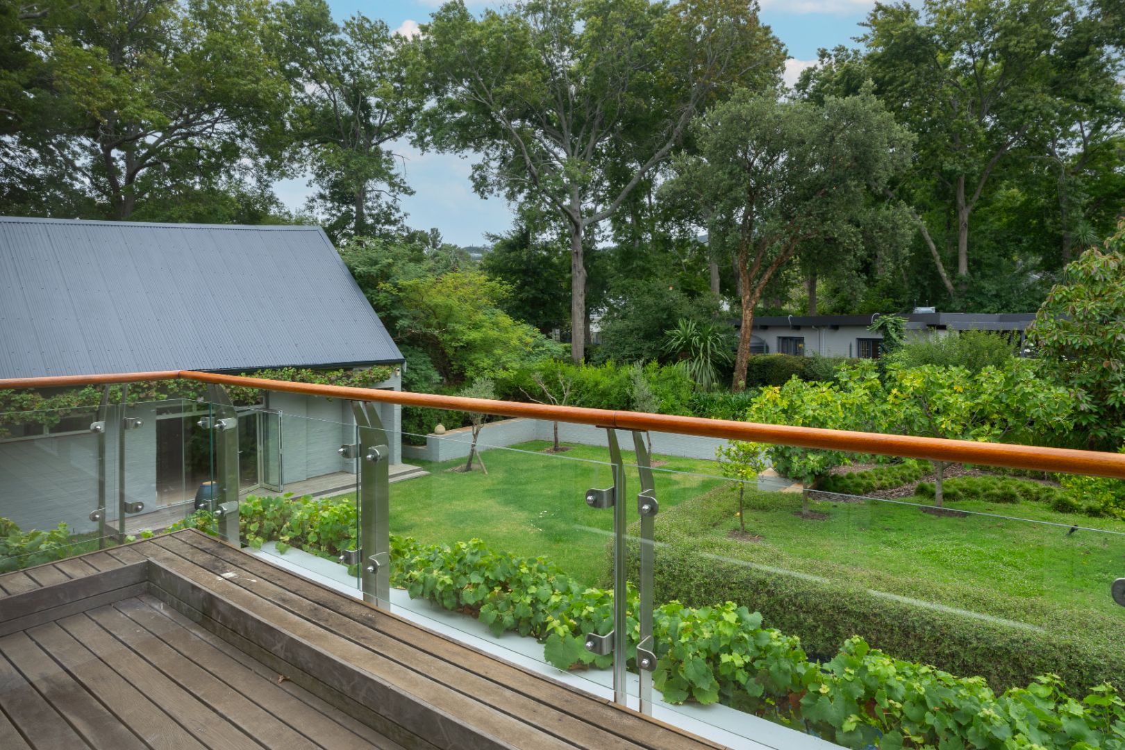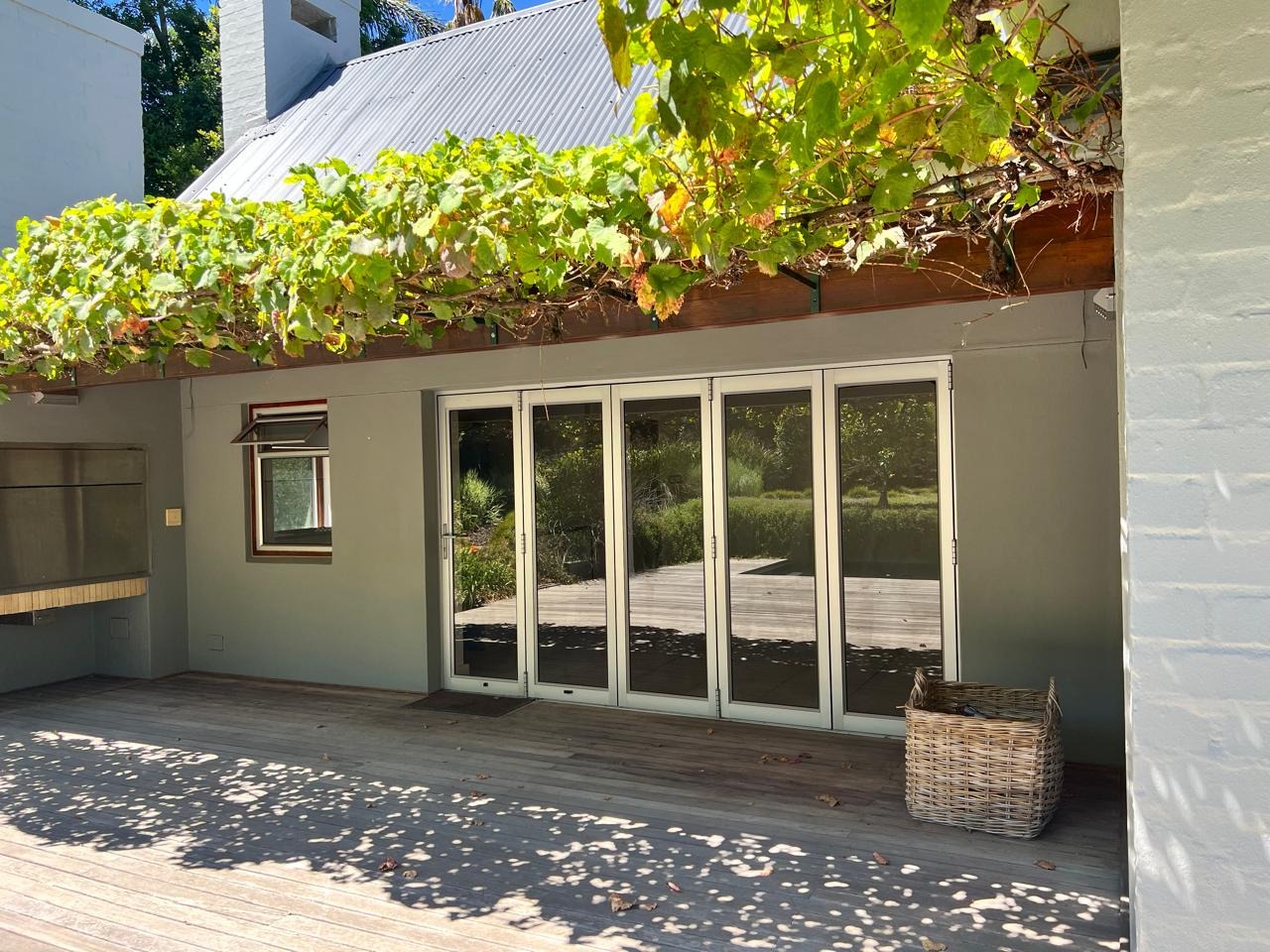 There are three bedrooms located downstairs, all opening directly onto the garden to create seamless indoor-outdoor living. All the wooden floors in the ground floor bedrooms are natural solid European oak and is equipped with underfloor heating. The main bedroom is generously proportioned, complete with a spacious en-suite bathroom. Upstairs, a double loft bedroom with a private balcony provides additional accommodation or an ideal work-from-home or guest suite option equipped with two air-conditioning units. The home offers a total of 3.5 bathrooms, all en-suite, as well as a guest toilet. All the wardrobes, kitchen and scullery cupboards are imported from Italy and there are blinds and Oregon pine shutters throughout the house.