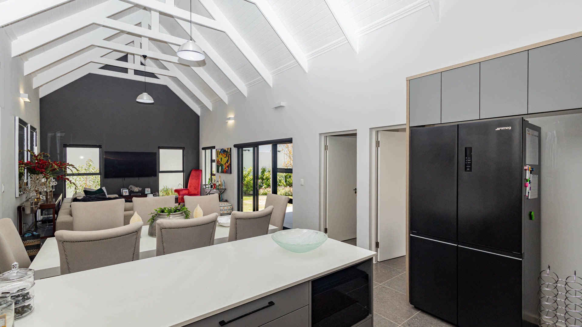The home features an open plan layout that flows effortlessly between the kitchen, dining, and living areas, all enhanced by high ceilings and abundant natural light. The modern kitchen is equipped with premium finishes, sleek cabinetry, and quality appliances, perfect for both family living and entertaining.