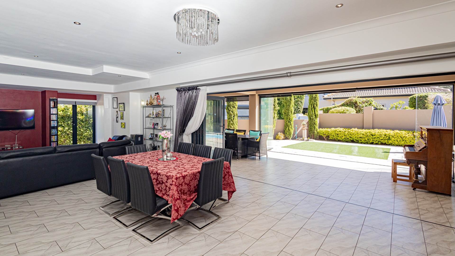 This home is designed for entertainment, open plan lounge, dining room and kitchen that leads on to an enclosed entertainment room, with a built-in braai, through stack doors and in turn leads on to the pool through frameless glass stacker doors, once all doors are open you have one large entertainment space.