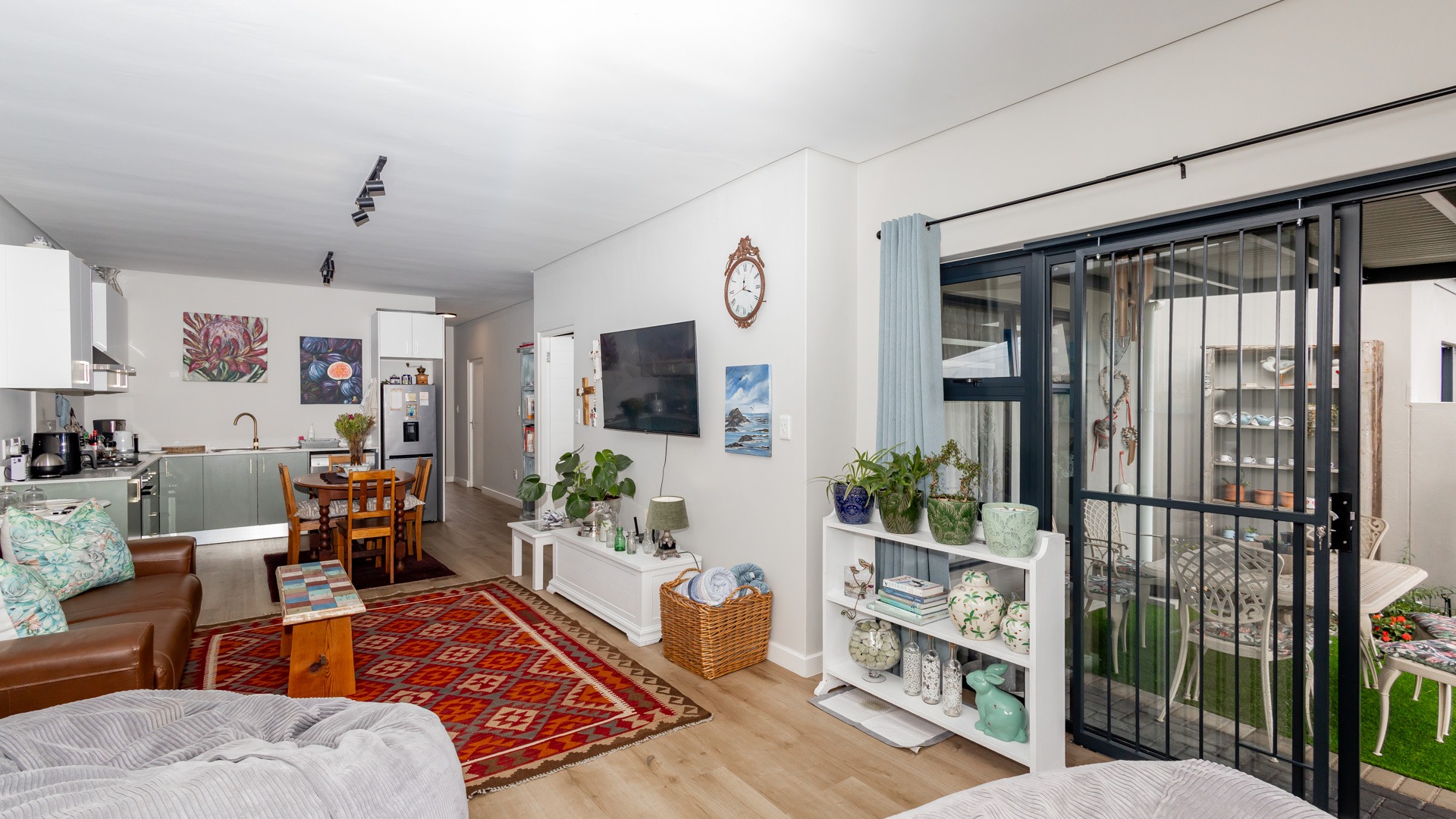 The home features a single garage and a stylish open-plan kitchen flowing into the dining and living areas. Extras include air conditioning, ClearVu security bars on the windows, a covered patio perfect for outdoor entertaining, and low-maintenance synthetic grass.