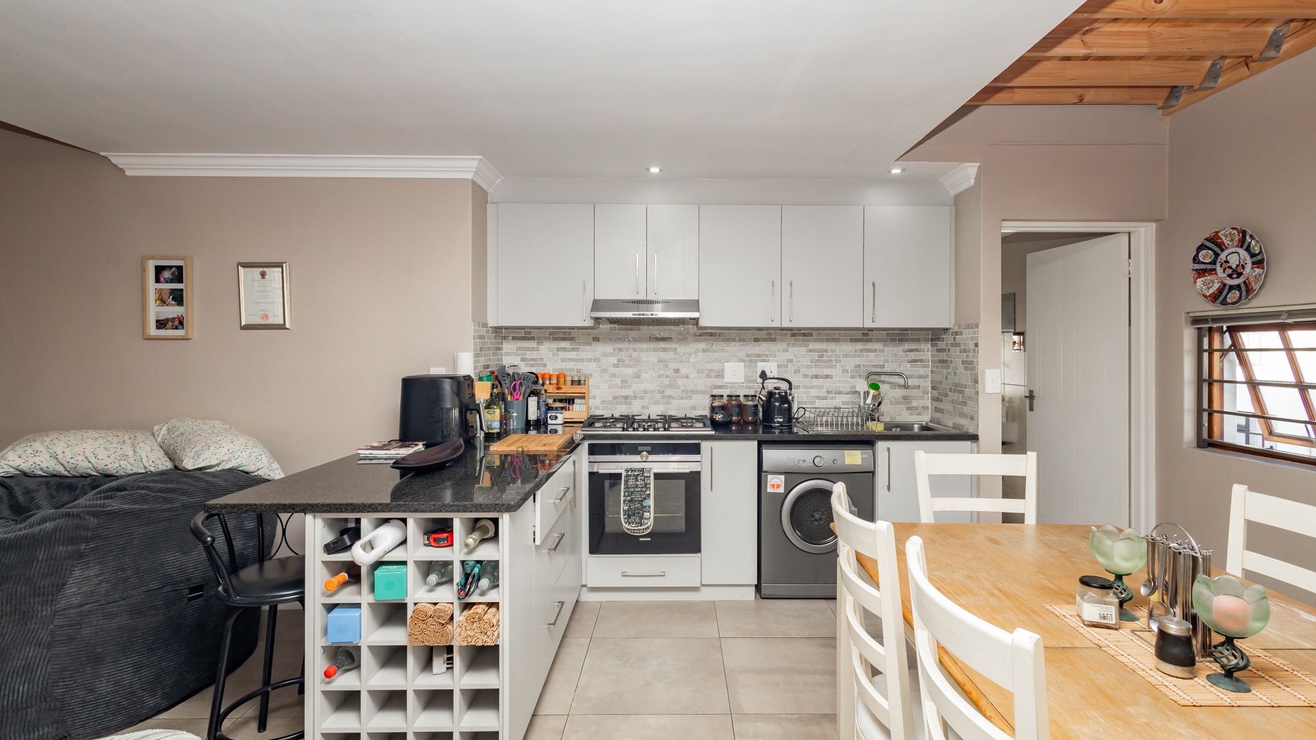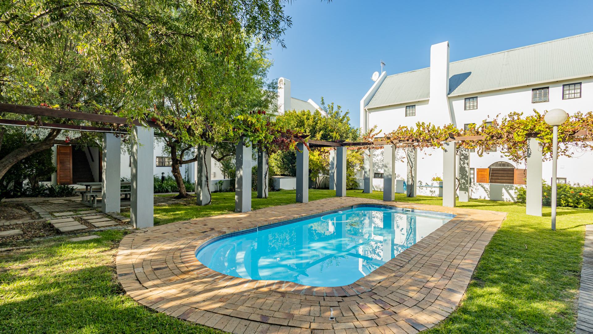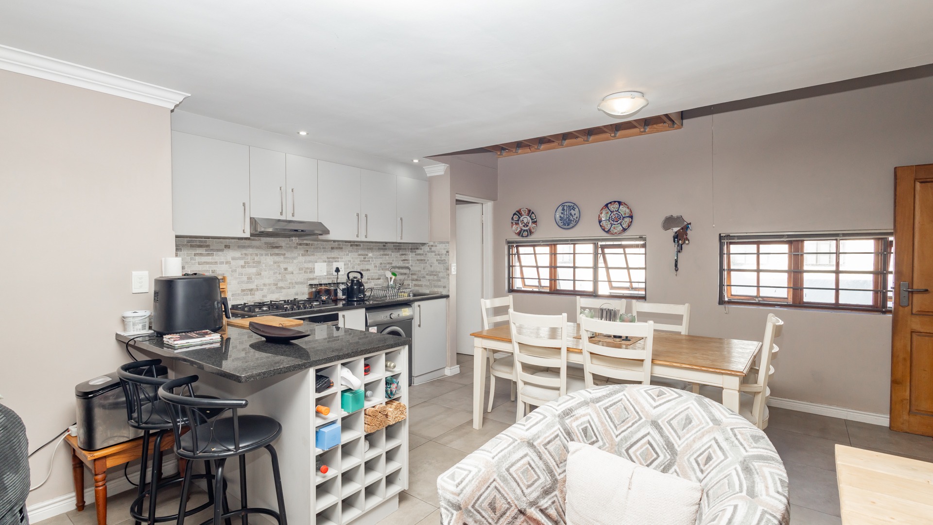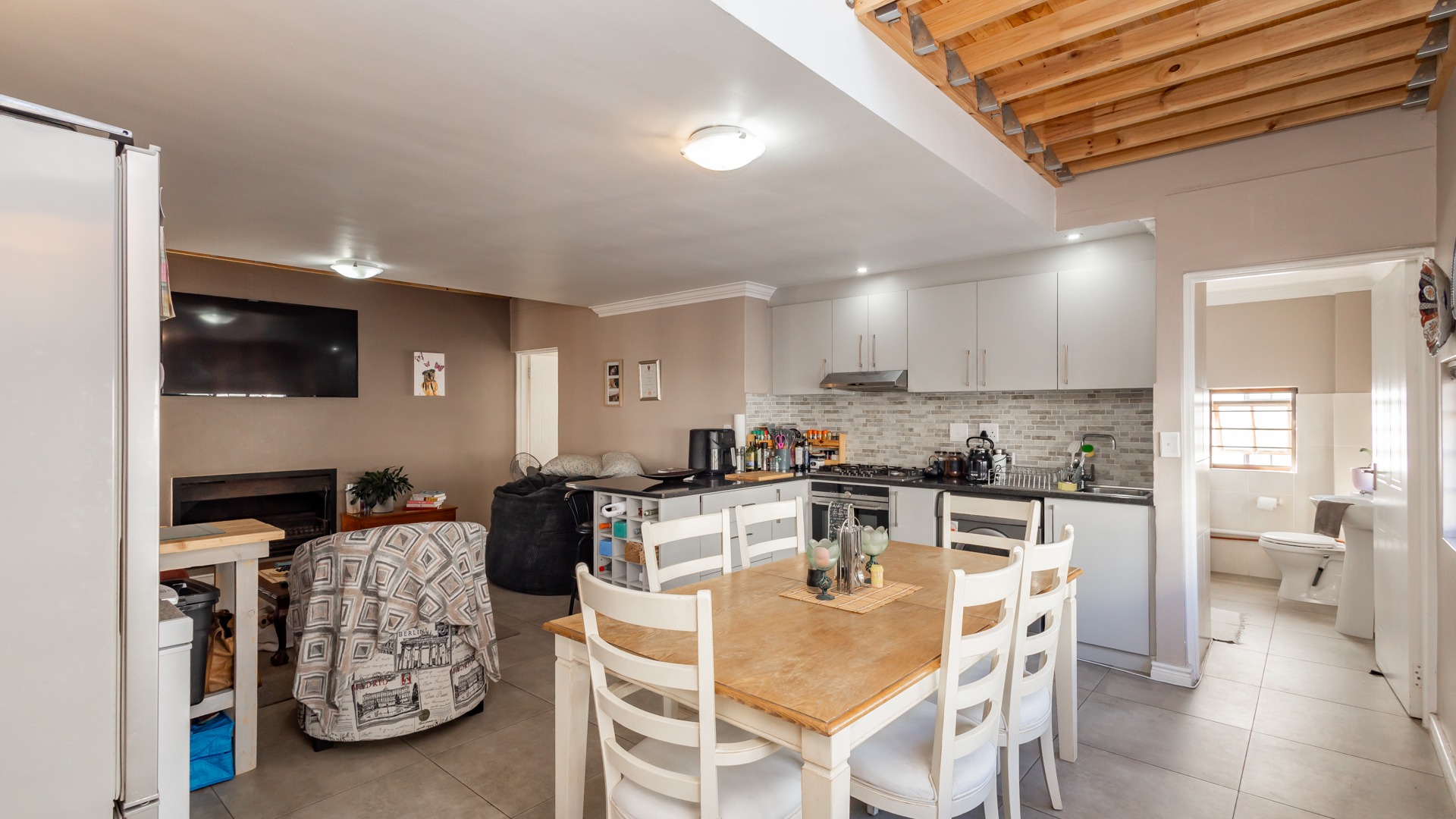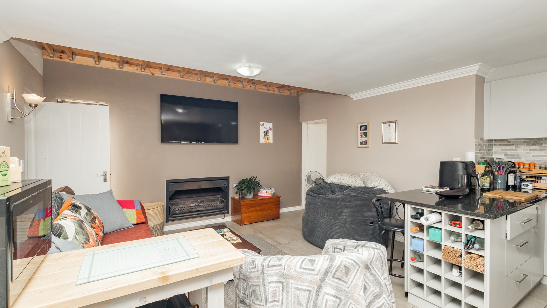Discover contemporary living within the secure De Wijnlanden Residential Estate, nestled in the picturesque Stellenbosch Winelands. This inviting 120 sqm home offers a seamless open-plan design, integrating a modern kitchen, dining area, and comfortable lounge. The kitchen boasts sleek white cabinetry, a tiled backsplash, an island with bar seating, an integrated wine rack, and a gas stove, perfect for culinary enthusiasts. The living area features a cozy fireplace and unique exposed wooden beam ceilings, creating an appealing ambiance, complemented by durable tiled flooring throughout. The residence comprises two well-appointed bedrooms and two bathrooms, including a convenient en-suite. A highlight is the spacious, open-plan loft area, offering versatile space for a bedroom, home office, or personal gym, complete with its own en-suite bathroom. This adaptable layout caters to various lifestyle needs, providing both comfort and functionality. Step outside to enjoy the established garden and a clean rectangular swimming pool, ideal for relaxation. A vine-covered pergola provides shaded outdoor space, alongside a dedicated communal braai and picnic area, perfect for entertaining. The property is pet-friendly and offers scenic views, enhancing the outdoor living experience. Security is paramount within this gated community and security complex, featuring an access gate, electric fencing, security gate, and burglar bars for peace of mind. Modern conveniences include a battery inverter for uninterrupted power supply and fibre connectivity, ensuring a connected and efficient lifestyle. Located in the renowned Stellenbosch Winelands, De Wijnlanden Residential Estate offers a desirable lifestyle. Its proximity also makes it suitable for student accommodation, combining estate living with accessibility. Key Features: * Open-plan living with modern kitchen * 2 Bedrooms, 2 Bathrooms (1 en-suite) * Spacious loft area * Private swimming pool and garden * Communal braai and picnic area * Battery inverter and fibre connectivity * Secure gated community * Pet-friendly with scenic views * Fireplace