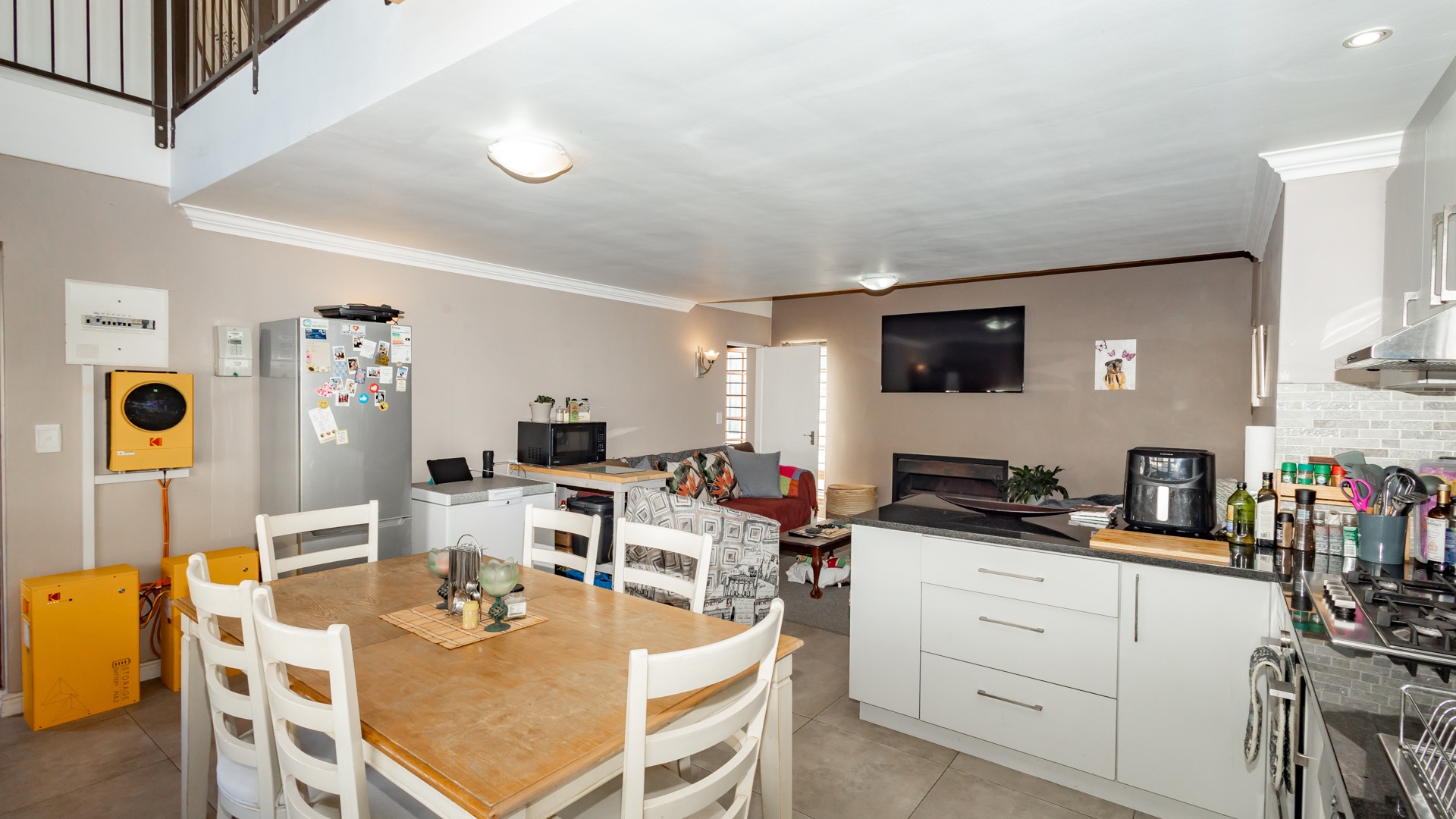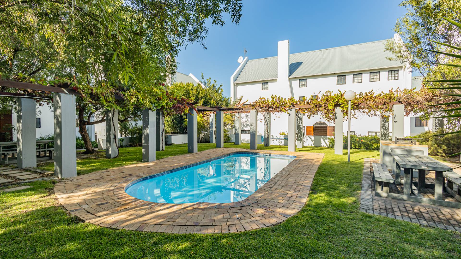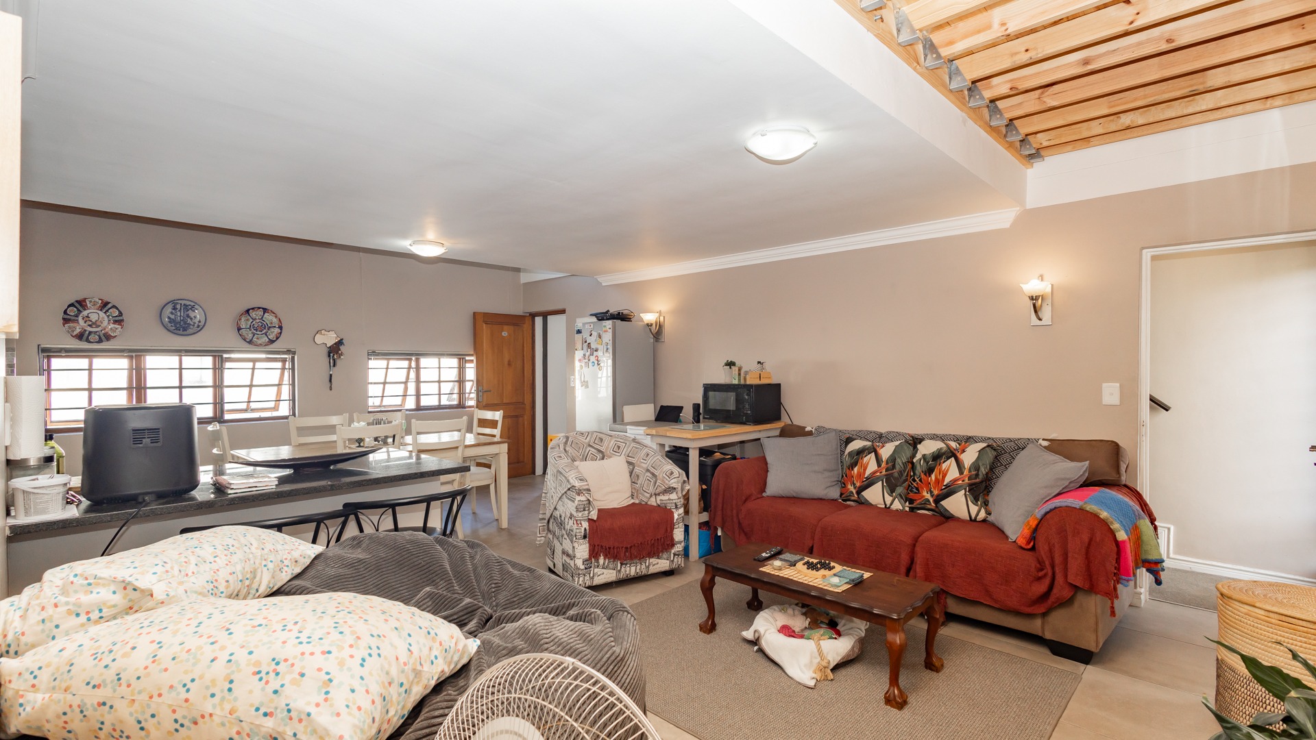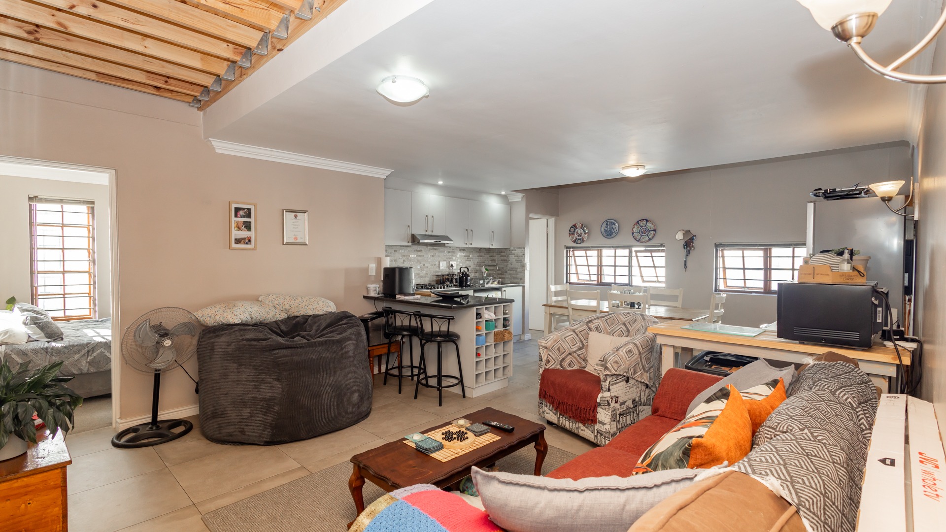 Discover contemporary living within the secure De Wijnlanden Residential Estate, nestled in the picturesque Stellenbosch Winelands. This inviting 120 sqm home offers a seamless open-plan design, integrating a modern kitchen, dining area, and comfortable lounge. The kitchen boasts sleek white cabinetry, a tiled backsplash, an island with bar seating, an integrated wine rack, and a gas stove, perfect for culinary enthusiasts. The living area features a cozy fireplace and unique exposed wooden beam ceilings, creating an appealing ambiance, complemented by durable tiled flooring throughout. The residence comprises two well-appointed bedrooms and two bathrooms, including a convenient en-suite. A highlight is the spacious, open-plan loft area, offering versatile space for a bedroom, home office, or personal gym, complete with its own en-suite bathroom. This adaptable layout caters to various lifestyle needs, providing both comfort and functionality. Step outside to enjoy the established garden and a clean rectangular swimming pool, ideal for relaxation. A vine-covered pergola provides shaded outdoor space, alongside a dedicated communal braai and picnic area, perfect for entertaining. The property is pet-friendly and offers scenic views, enhancing the outdoor living experience. Security is paramount within this gated community and security complex, featuring an access gate, electric fencing, security gate, and burglar bars for peace of mind. Modern conveniences include a battery inverter for uninterrupted power supply and fibre connectivity, ensuring a connected and efficient lifestyle. Located in the renowned Stellenbosch Winelands, De Wijnlanden Residential Estate offers a desirable lifestyle. Its proximity also makes it suitable for student accommodation, combining estate living with accessibility. Key Features: * Open-plan living with modern kitchen * 2 Bedrooms, 2 Bathrooms (1 en-suite) * Spacious loft area * Private swimming pool and garden * Communal braai and picnic area * Battery inverter and fibre connectivity * Secure gated community * Pet-friendly with scenic views * Fireplace