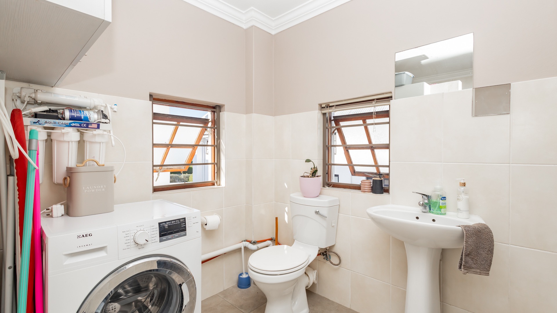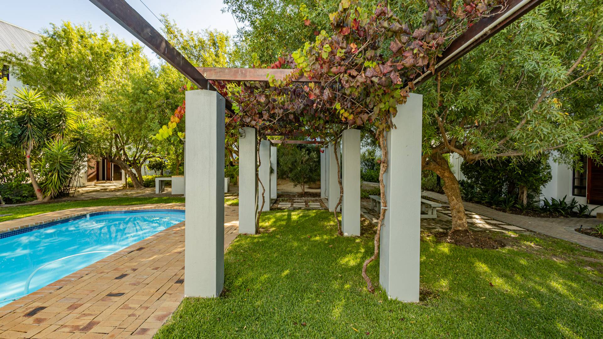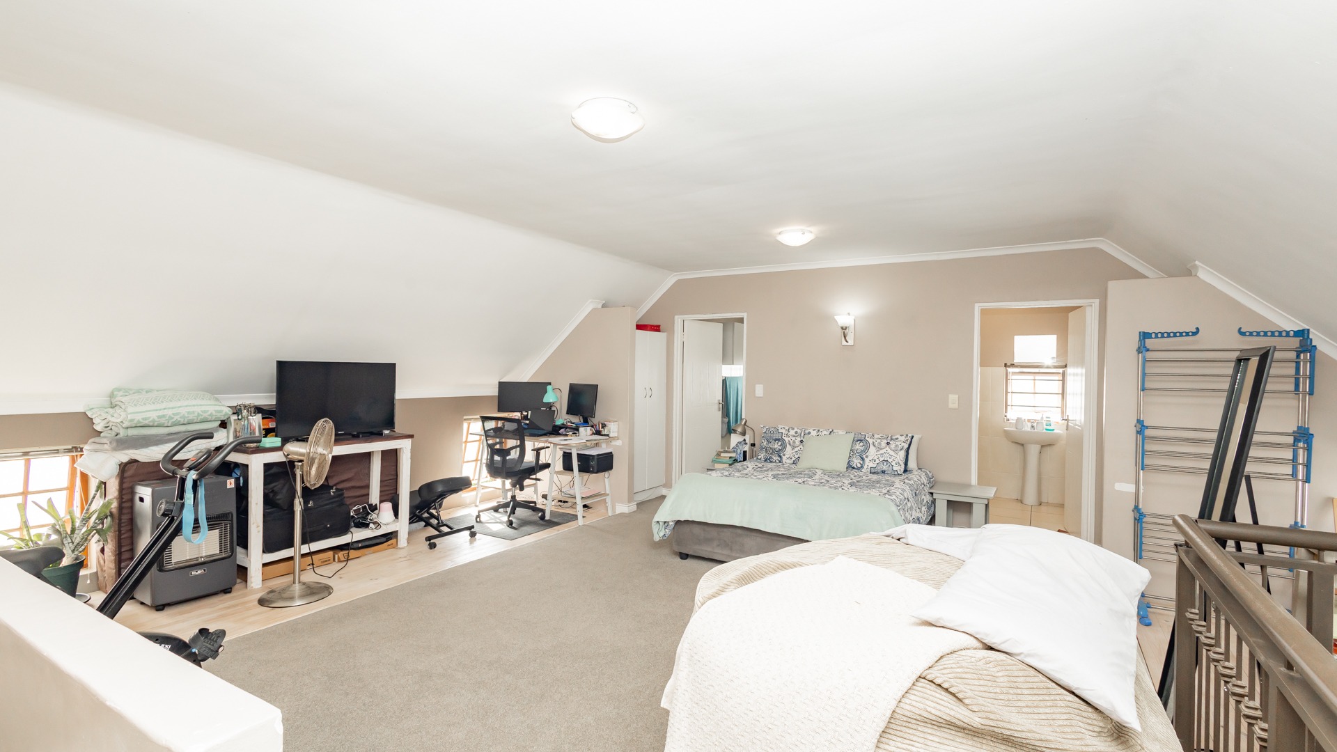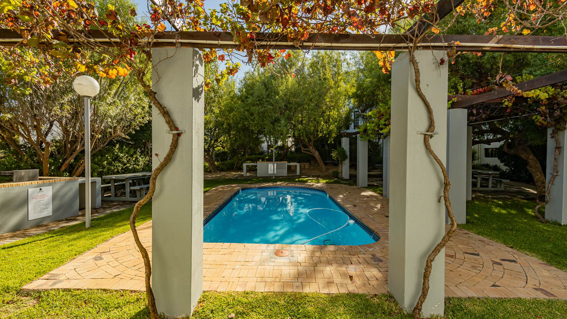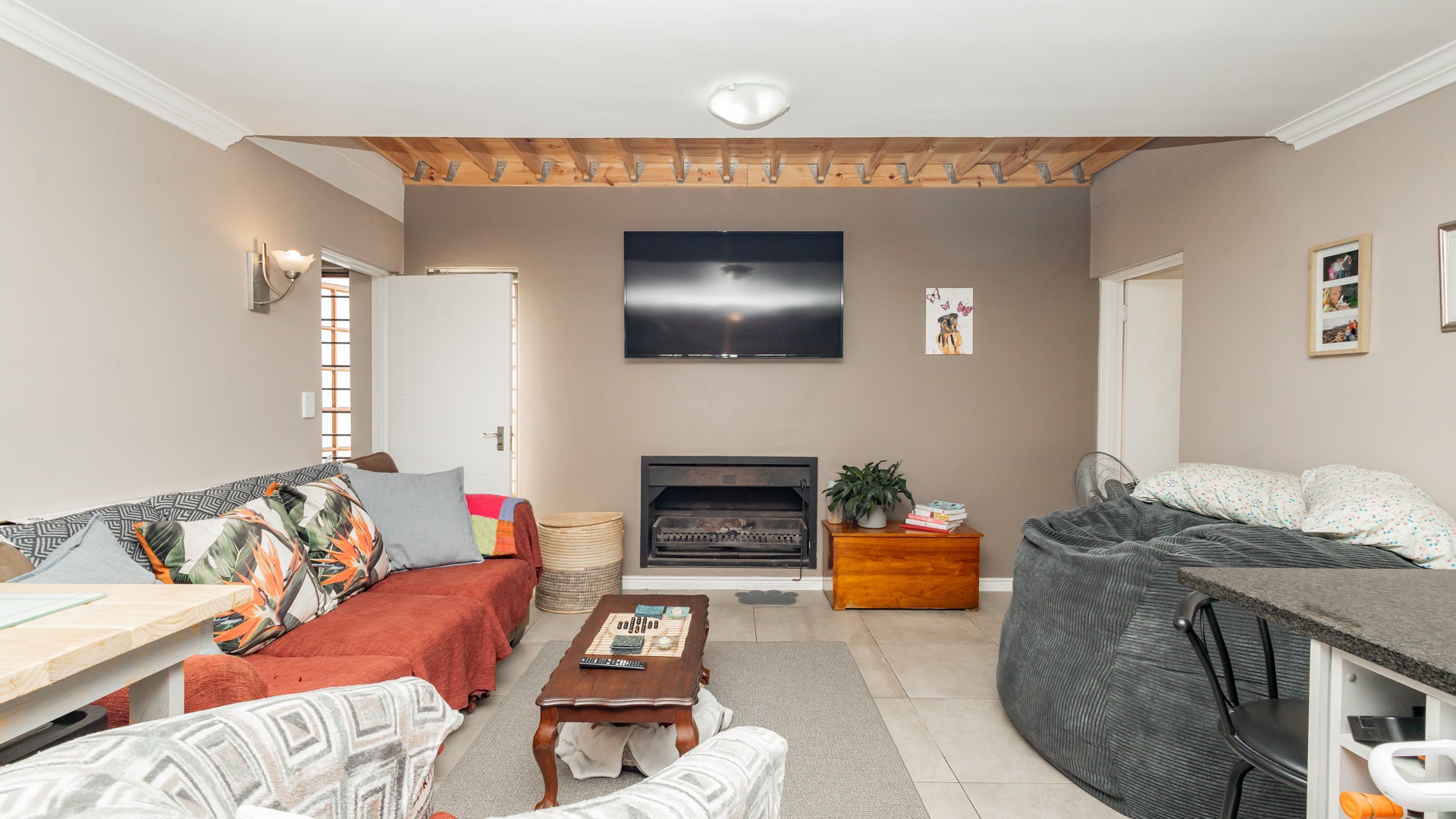 Discover contemporary living within the secure De Wijnlanden Residential Estate, nestled in the picturesque Stellenbosch Winelands. This inviting 120 sqm home offers a seamless open-plan design, integrating a modern kitchen, dining area, and comfortable lounge. The kitchen boasts sleek white cabinetry, a tiled backsplash, an island with bar seating, an integrated wine rack, and a gas stove, perfect for culinary enthusiasts. The living area features a cozy fireplace and unique exposed wooden beam ceilings, creating an appealing ambiance, complemented by durable tiled flooring throughout. The residence comprises two well-appointed bedrooms and two bathrooms, including a convenient en-suite. A highlight is the spacious, open-plan loft area, offering versatile space for a bedroom, home office, or personal gym, complete with its own en-suite bathroom. This adaptable layout caters to various lifestyle needs, providing both comfort and functionality. Step outside to enjoy the established garden and a clean rectangular swimming pool, ideal for relaxation. A vine-covered pergola provides shaded outdoor space, alongside a dedicated communal braai and picnic area, perfect for entertaining. The property is pet-friendly and offers scenic views, enhancing the outdoor living experience. Security is paramount within this gated community and security complex, featuring an access gate, electric fencing, security gate, and burglar bars for peace of mind. Modern conveniences include a battery inverter for uninterrupted power supply and fibre connectivity, ensuring a connected and efficient lifestyle. Located in the renowned Stellenbosch Winelands, De Wijnlanden Residential Estate offers a desirable lifestyle. Its proximity also makes it suitable for student accommodation, combining estate living with accessibility. Key Features: * Open-plan living with modern kitchen * 2 Bedrooms, 2 Bathrooms (1 en-suite) * Spacious loft area * Private swimming pool and garden * Communal braai and picnic area * Battery inverter and fibre connectivity * Secure gated community * Pet-friendly with scenic views * Fireplace