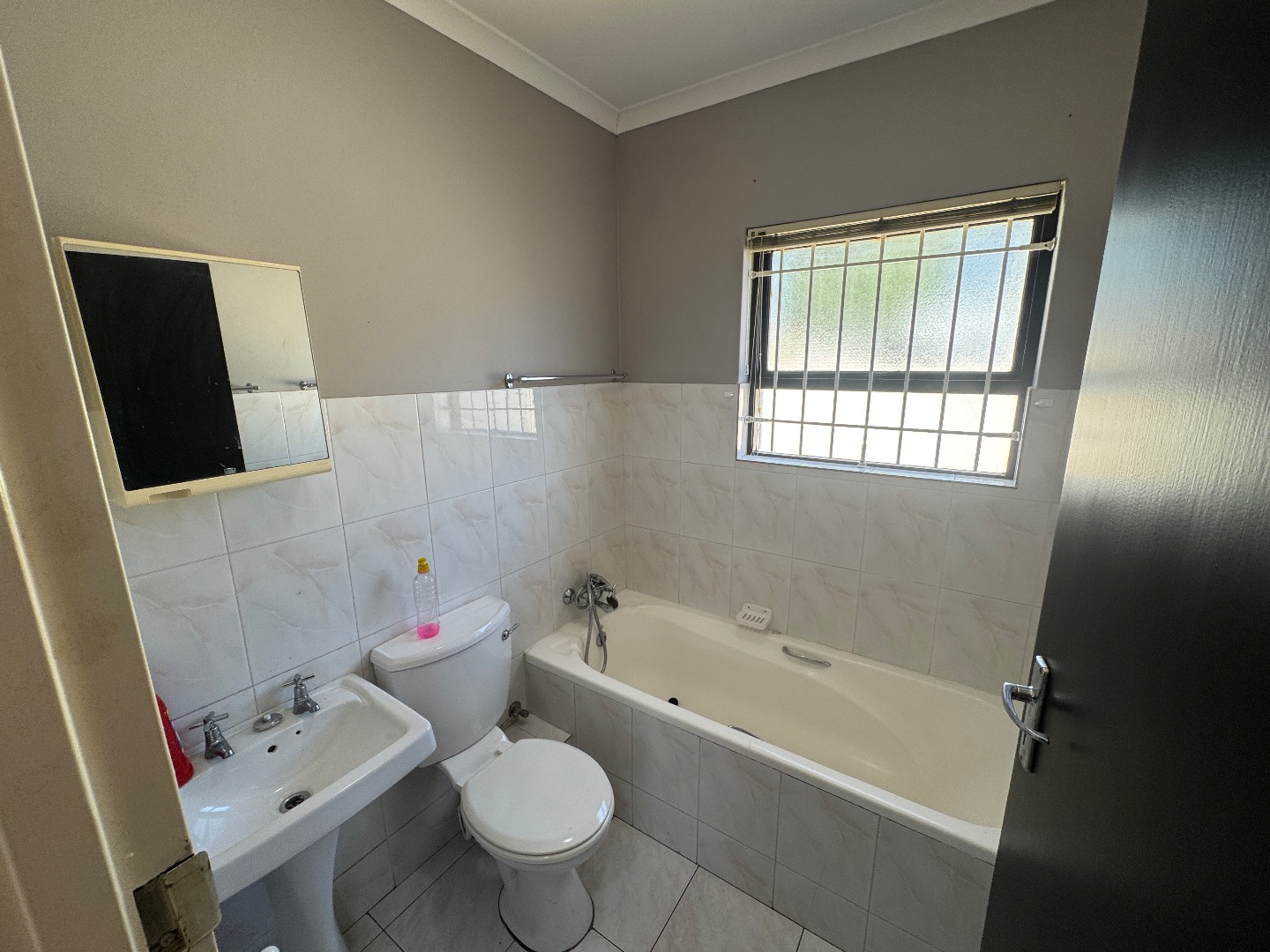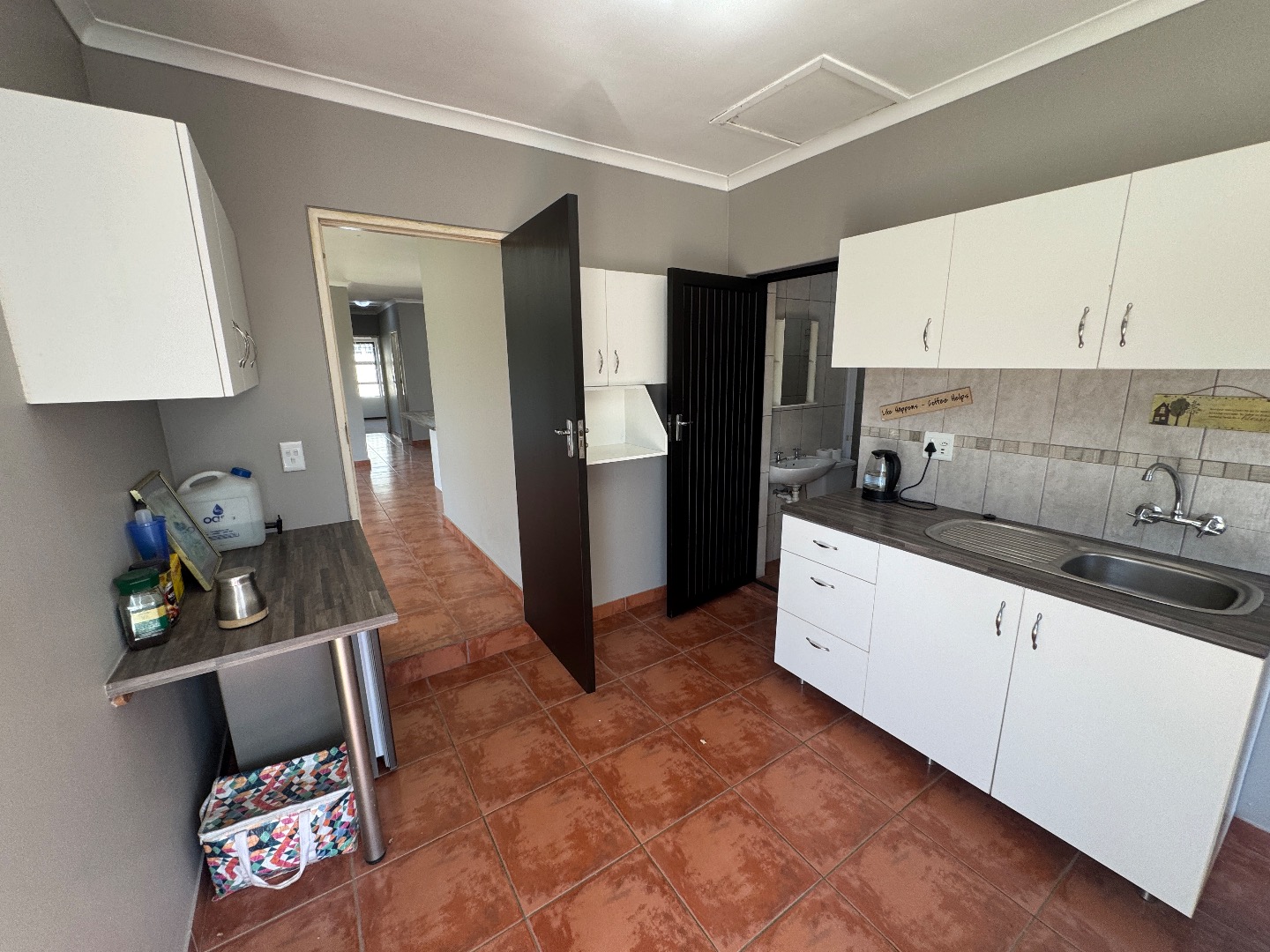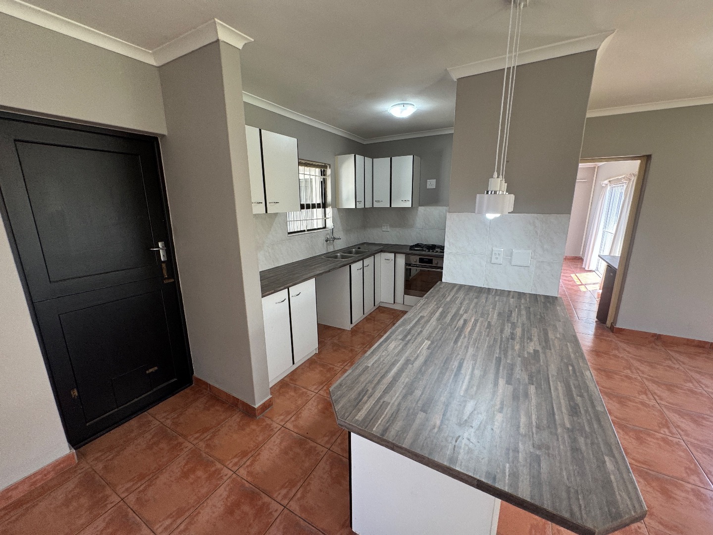The home features three bedrooms, two bathrooms, a welcoming living and dining area, and an open-plan kitchen that flows seamlessly onto a covered patio with a built-in braai—perfect for entertaining family and friends. The main bedroom includes an en-suite bathroom with a shower, toilet, and basin, while the remaining bedrooms share a second bathroom.