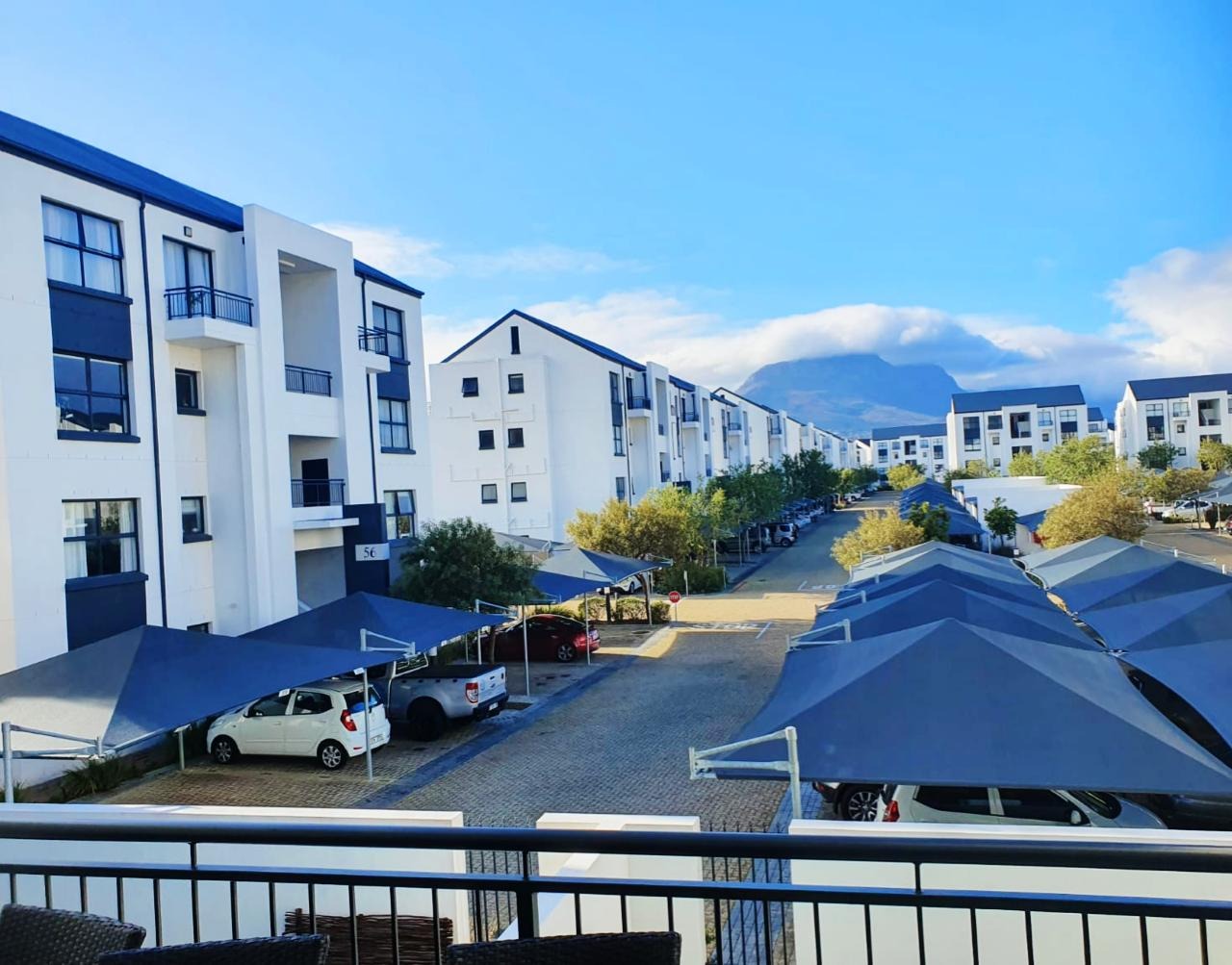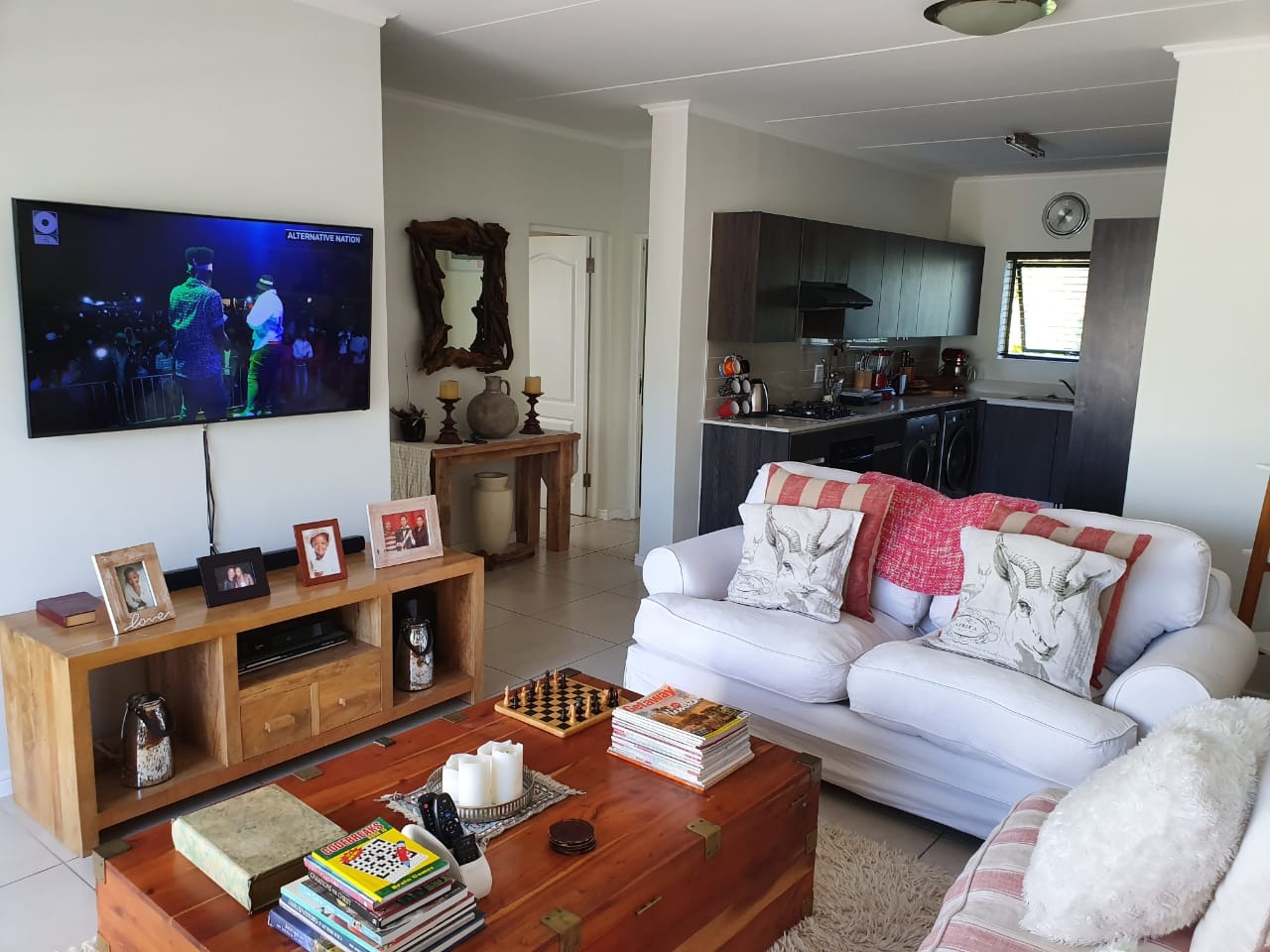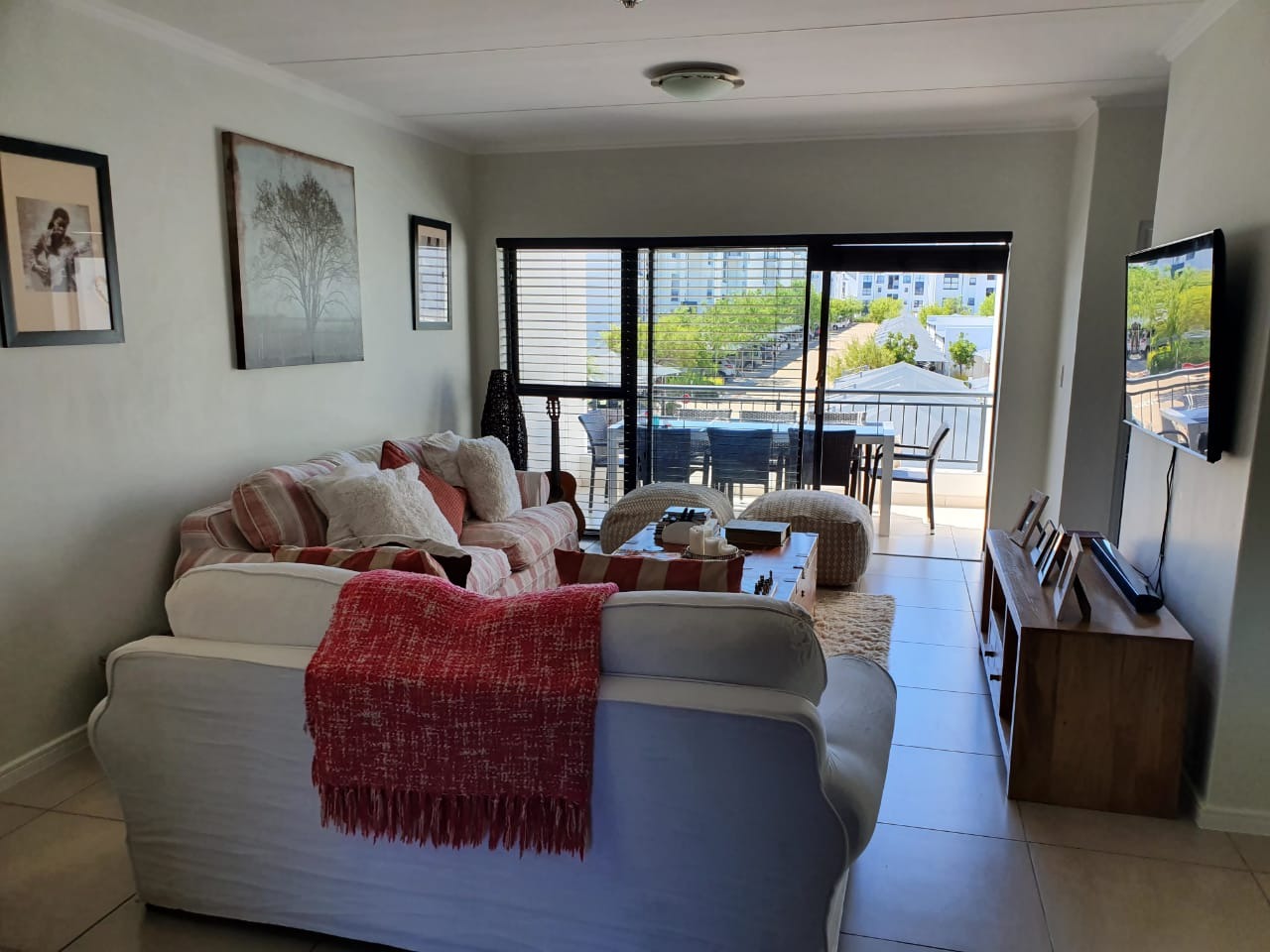 There is sufficient space for a 6 seater table, 2 x two-seater couches and coffee tables. The lounge opens onto a spacious covered patio which is ideal to entertain guests while viewing stunning views of the mountains. The bedrooms all have built-in cupboards and the master bedroom has a shower en-suite. The two additional bedrooms share a full bathroom.