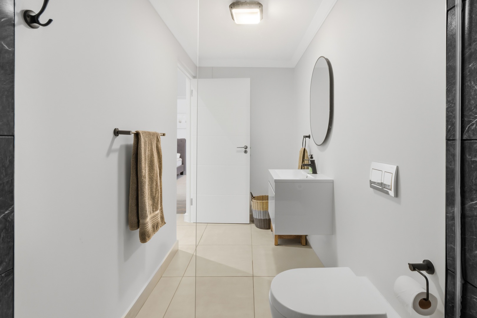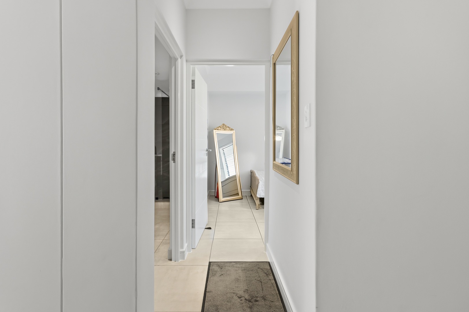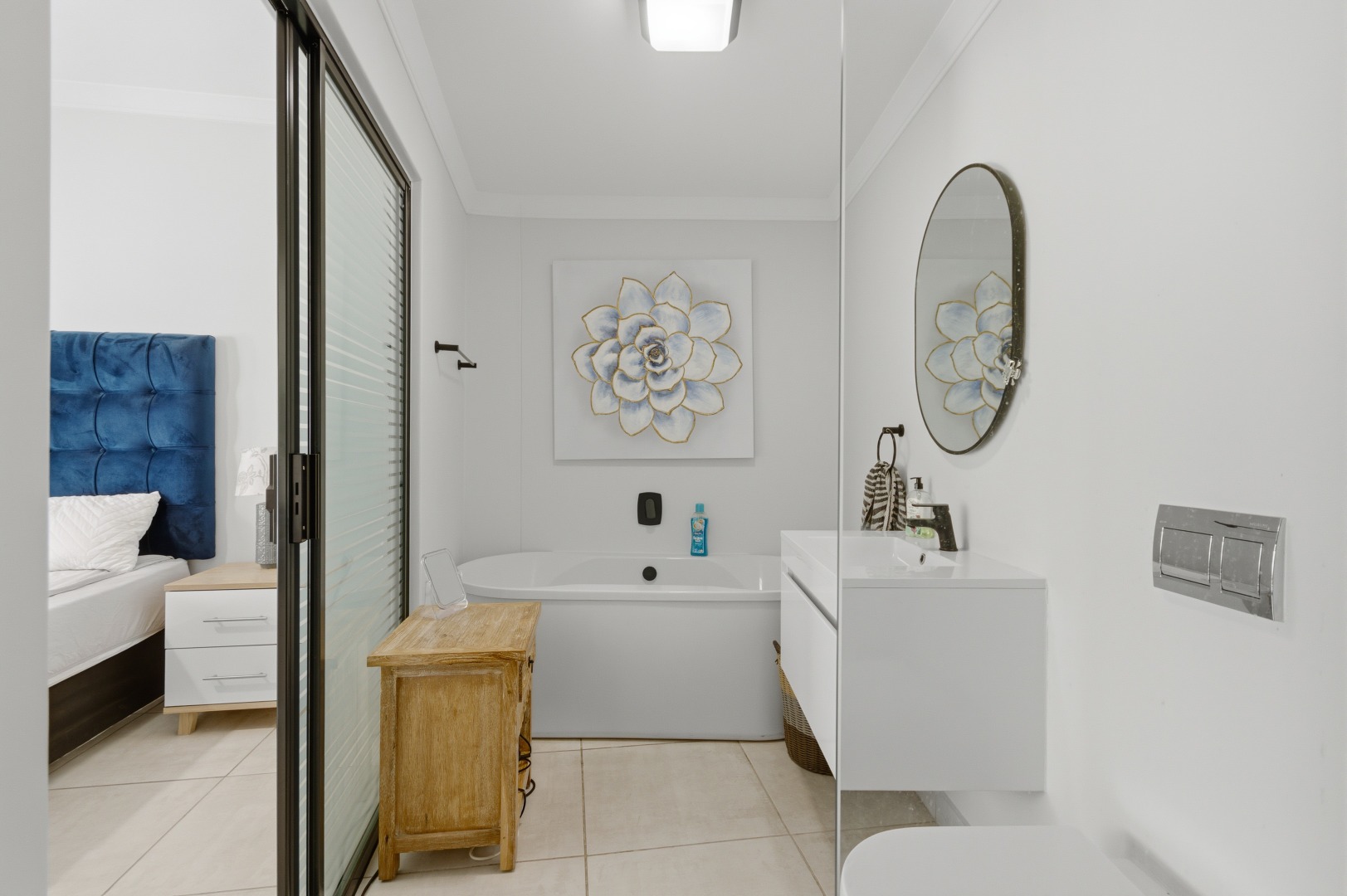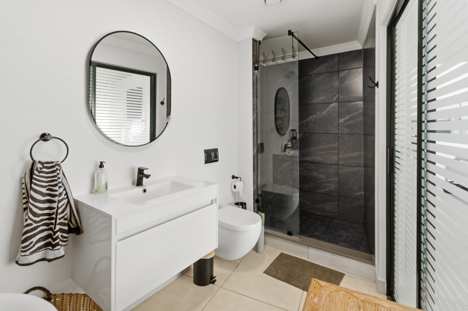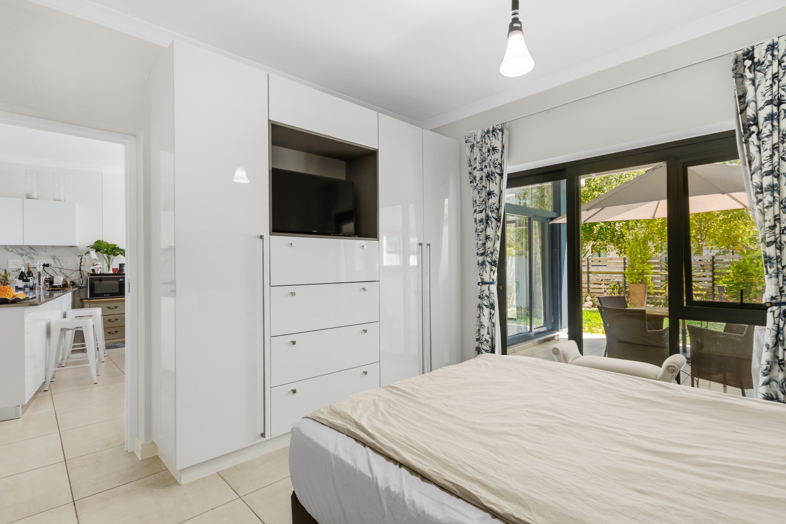 The interior comprises three well-appointed bedrooms and two contemporary bathrooms, including a luxurious en-suite. The bedrooms are equipped with sleek, white built-in wardrobes, some featuring integrated television units, providing ample storage and a streamlined appearance. Large glass sliding doors in select bedrooms offer direct access to private outdoor areas, enhancing the indoor-outdoor flow. The bathrooms boast modern fixtures, including floating vanities, stylish mirrors, and a combination of walk-in showers with dark marbled tiles and a sleek bathtub, catering to both convenience and relaxation.