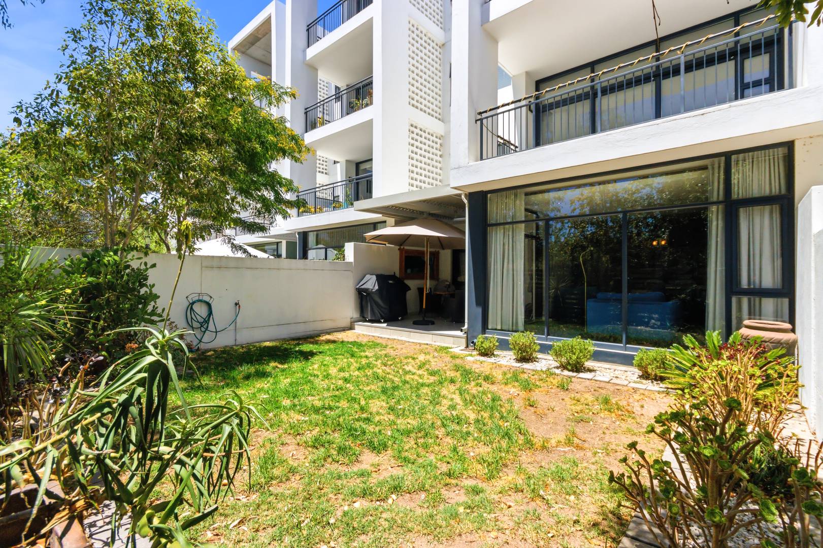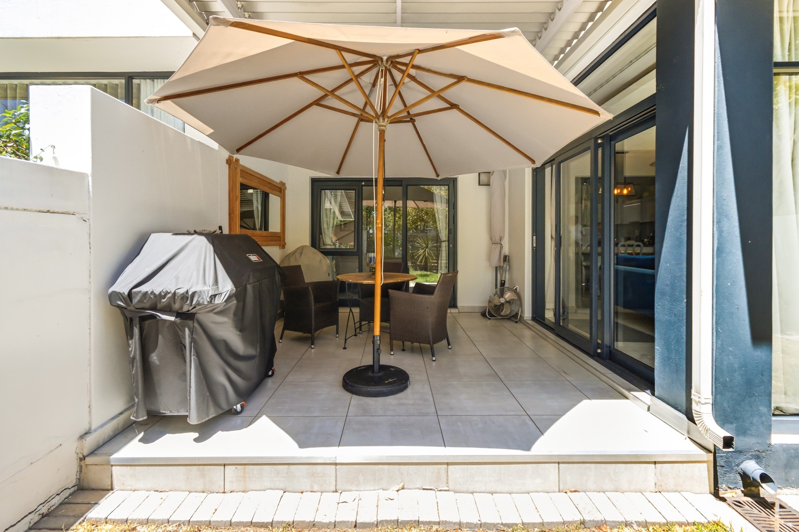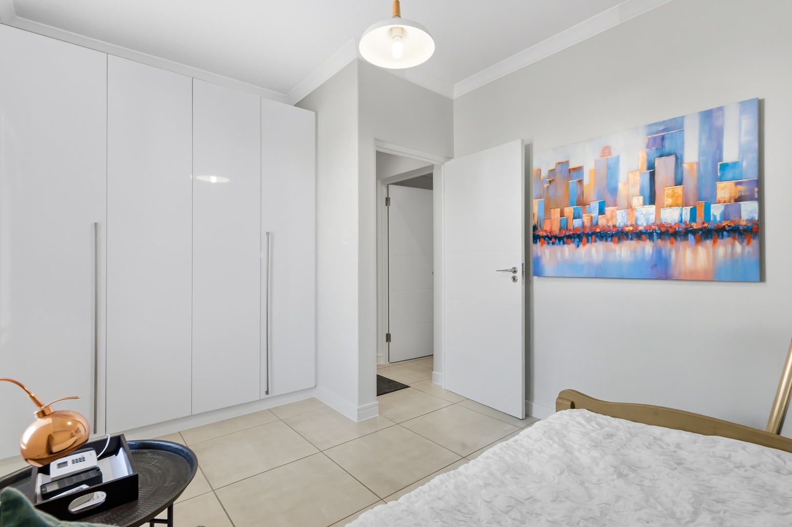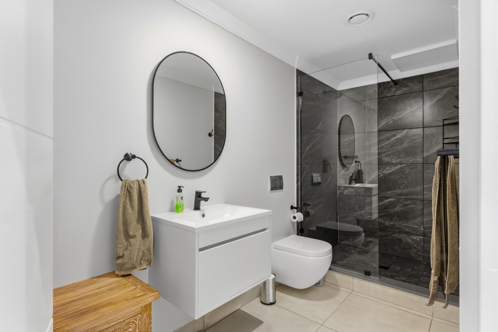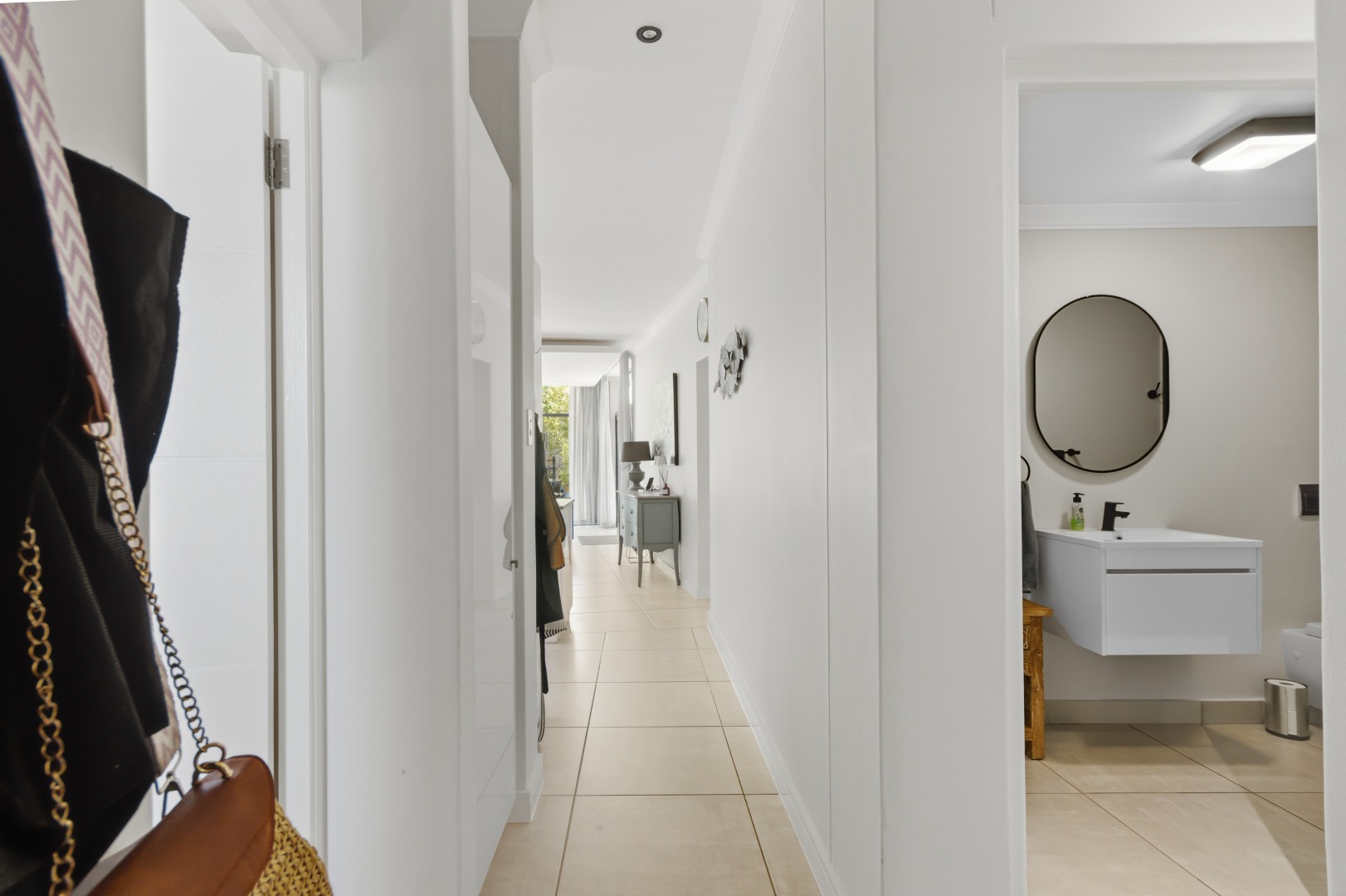 The interior comprises three well-appointed bedrooms and two contemporary bathrooms, including a luxurious en-suite. The bedrooms are equipped with sleek, white built-in wardrobes, some featuring integrated television units, providing ample storage and a streamlined appearance. Large glass sliding doors in select bedrooms offer direct access to private outdoor areas, enhancing the indoor-outdoor flow. The bathrooms boast modern fixtures, including floating vanities, stylish mirrors, and a combination of walk-in showers with dark marbled tiles and a sleek bathtub, catering to both convenience and relaxation.