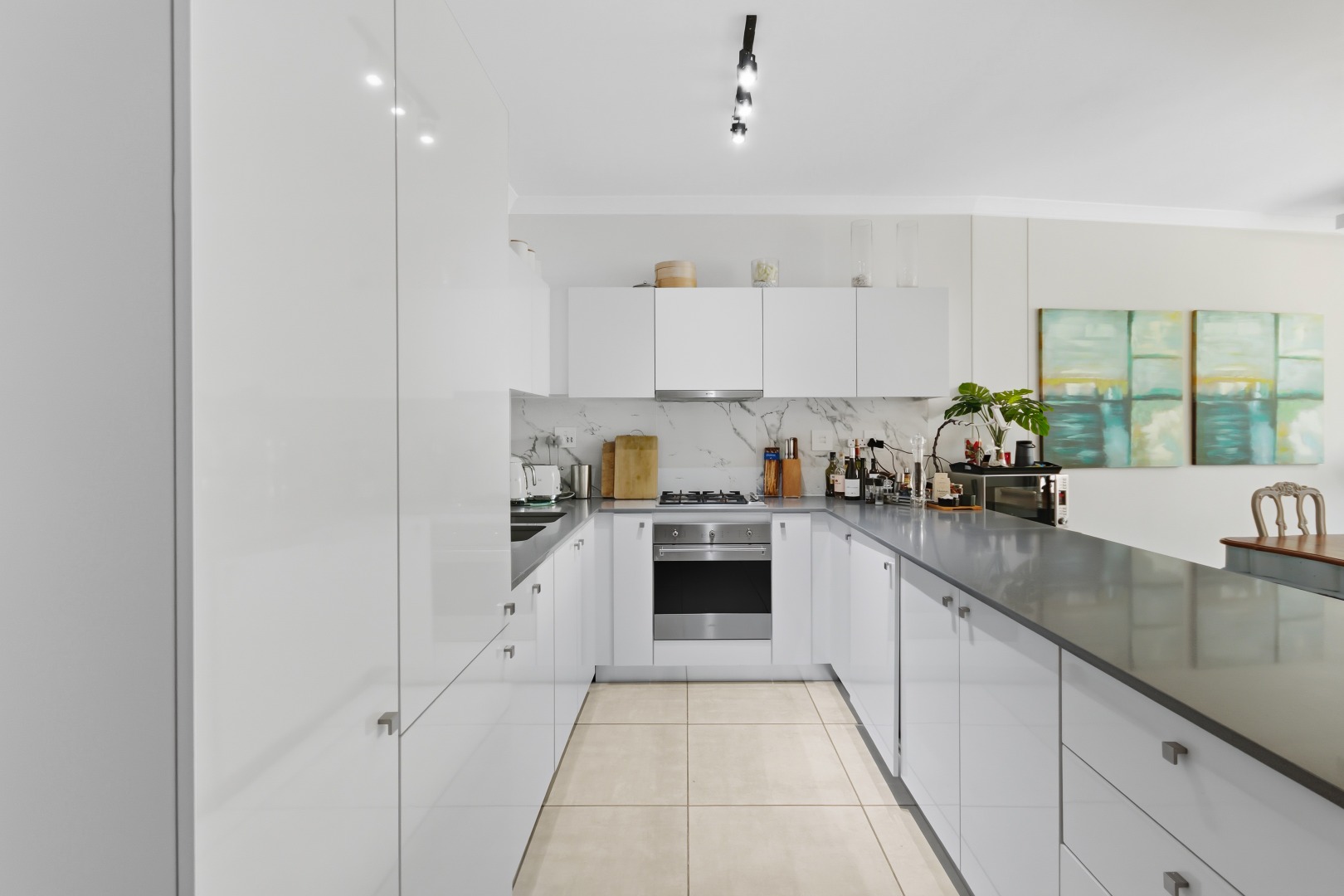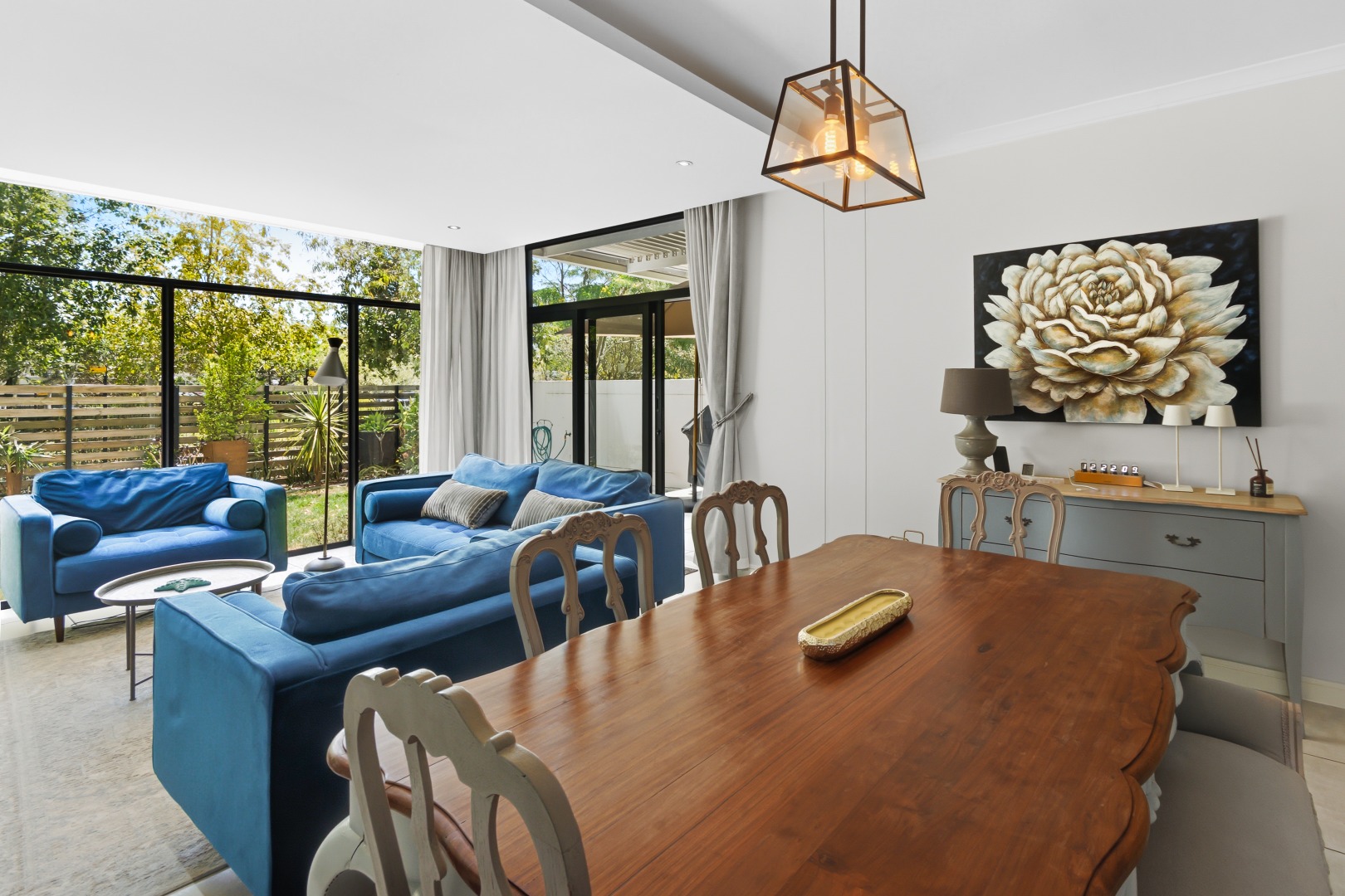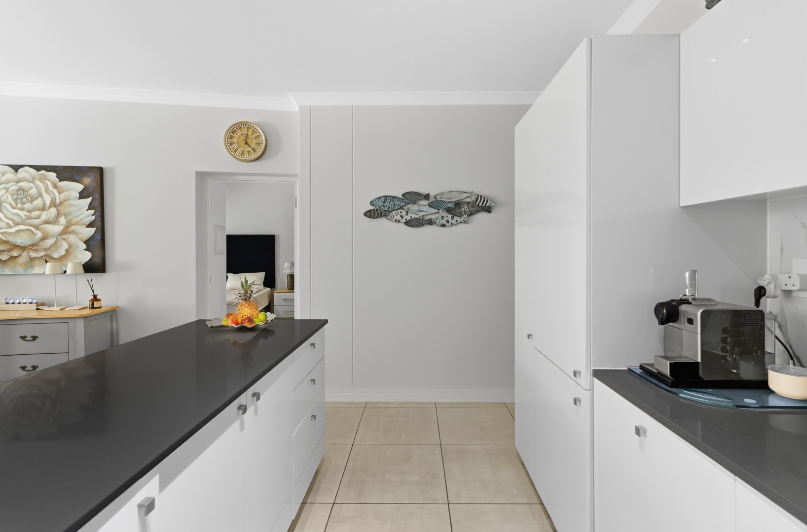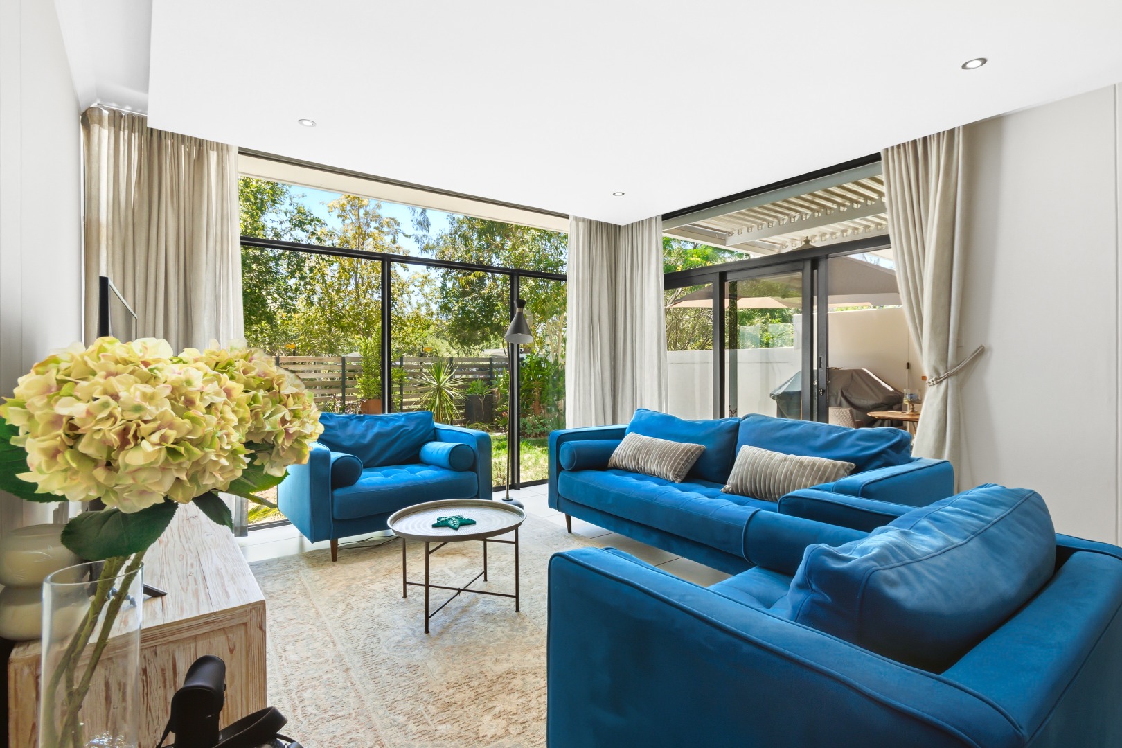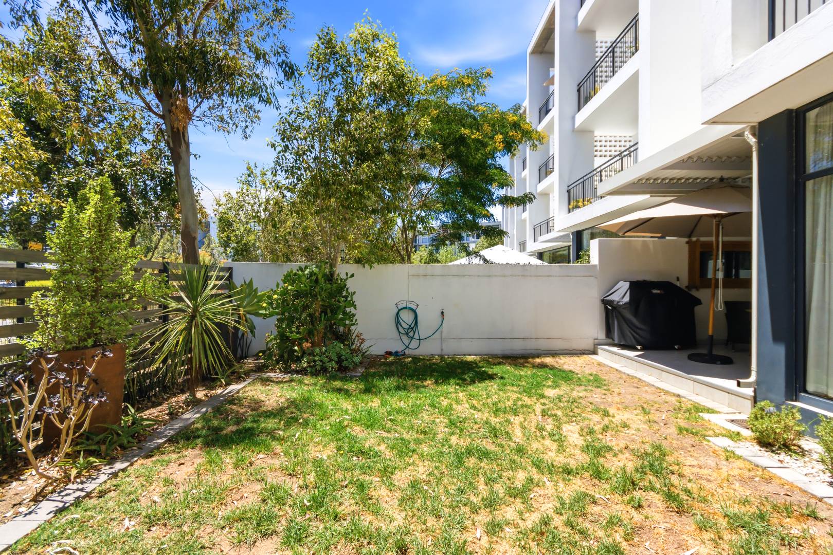 The interior comprises three well-appointed bedrooms and two contemporary bathrooms, including a luxurious en-suite. The bedrooms are equipped with sleek, white built-in wardrobes, some featuring integrated television units, providing ample storage and a streamlined appearance. Large glass sliding doors in select bedrooms offer direct access to private outdoor areas, enhancing the indoor-outdoor flow. The bathrooms boast modern fixtures, including floating vanities, stylish mirrors, and a combination of walk-in showers with dark marbled tiles and a sleek bathtub, catering to both convenience and relaxation.