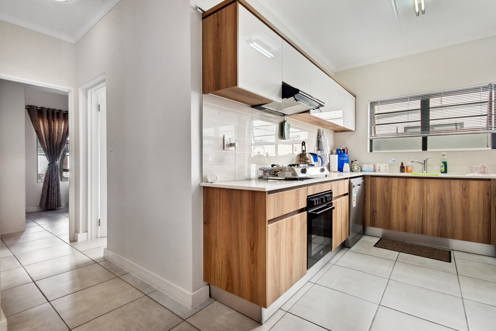 - The kitchen is modern with plenty of cabinet space, and engineered stone counter tops