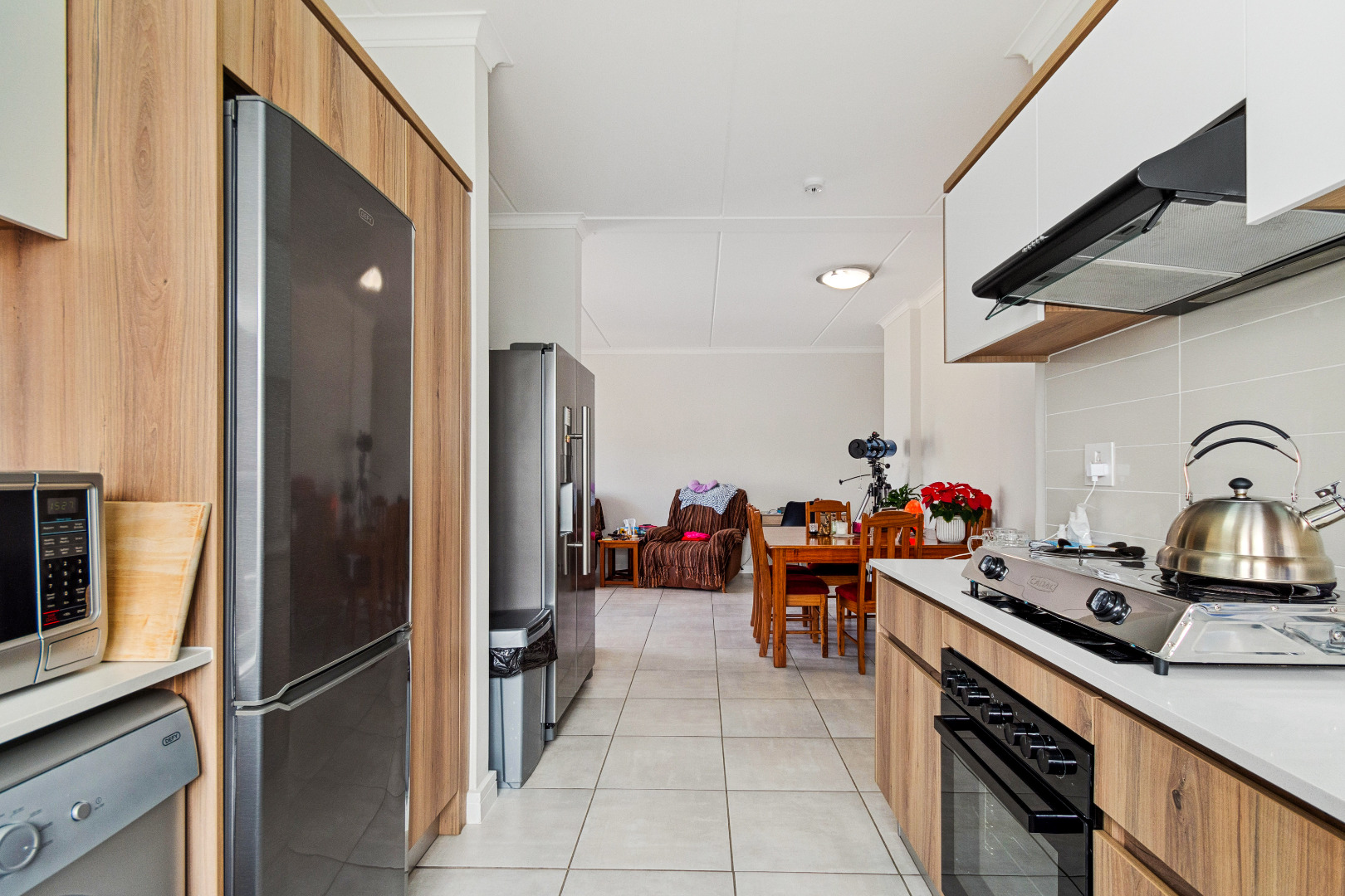 - The kitchen is modern with plenty of cabinet space, and engineered stone counter tops