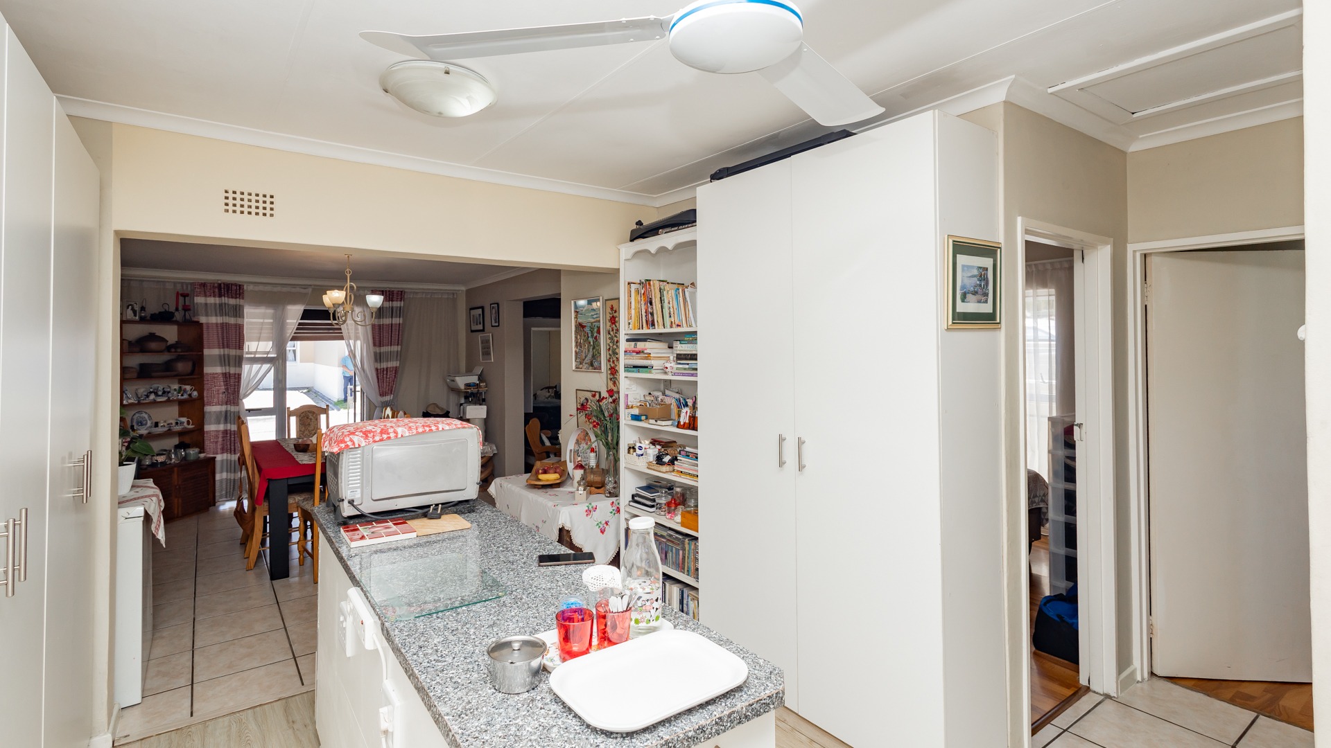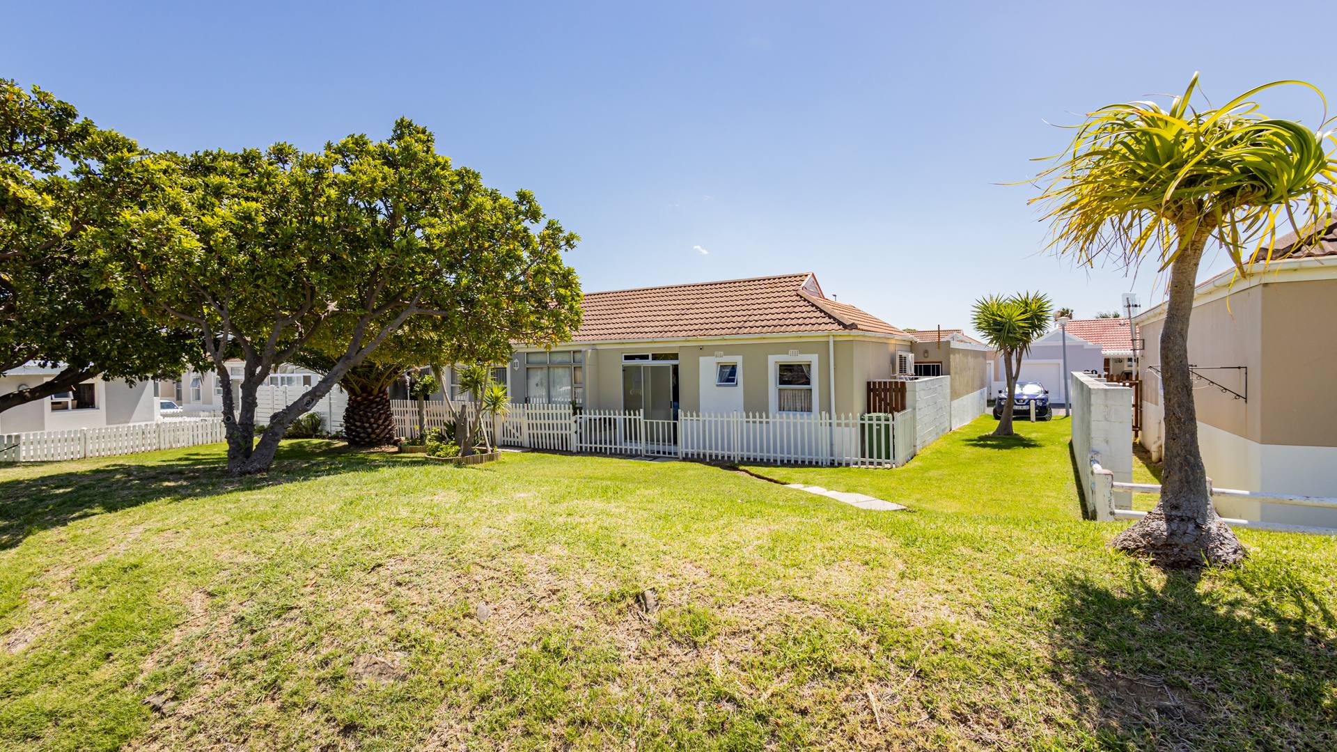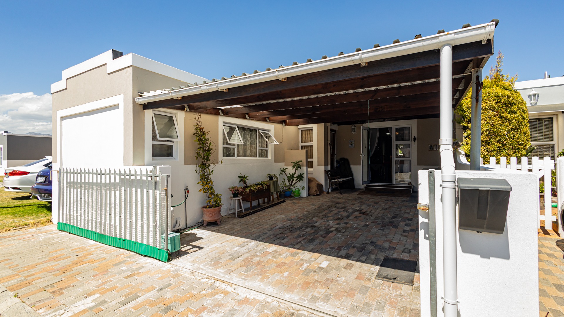 Discover secure family living in this inviting 3-bedroom, 2-bathroom residence within a gated community in Gordons Bay Central, South Africa. The property features a welcoming facade, neatly paved. Inside, an open-plan layout seamlessly connects the dining room and kitchen, with a concealed laundry area, complemented by a spacious lounge. Glass doors enhance natural light, and flow throughout the living spaces.