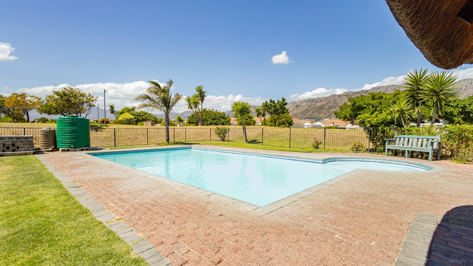 Residents benefit from access to communal amenities, including a swimming pool with a thatched lapa and a children's playground set against a scenic mountain backdrop. Security is paramount in this gated community. The property has been fitted with fibre, ensuring high-speed internet, and is pet-friendly.