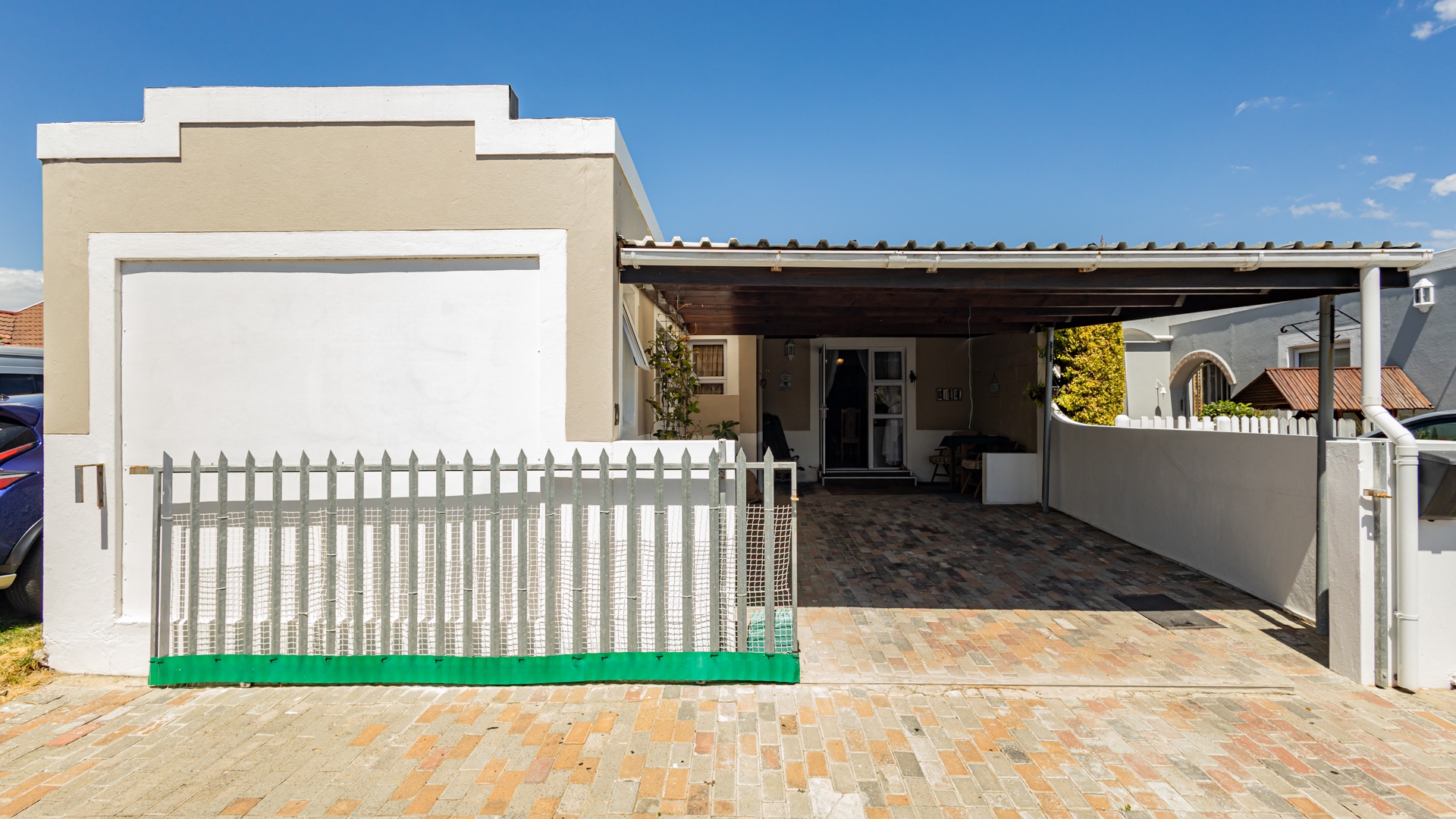 The covered patio in front of the home is spacious enough for parking, and for enjoying the outdoors, and is completely enclosed with a morotorised gate.