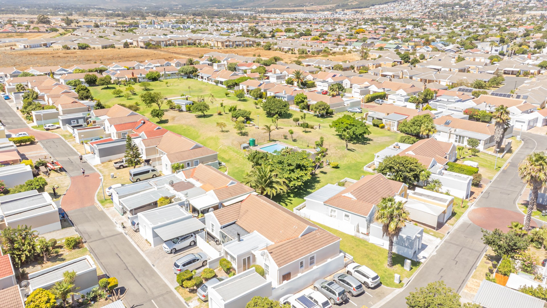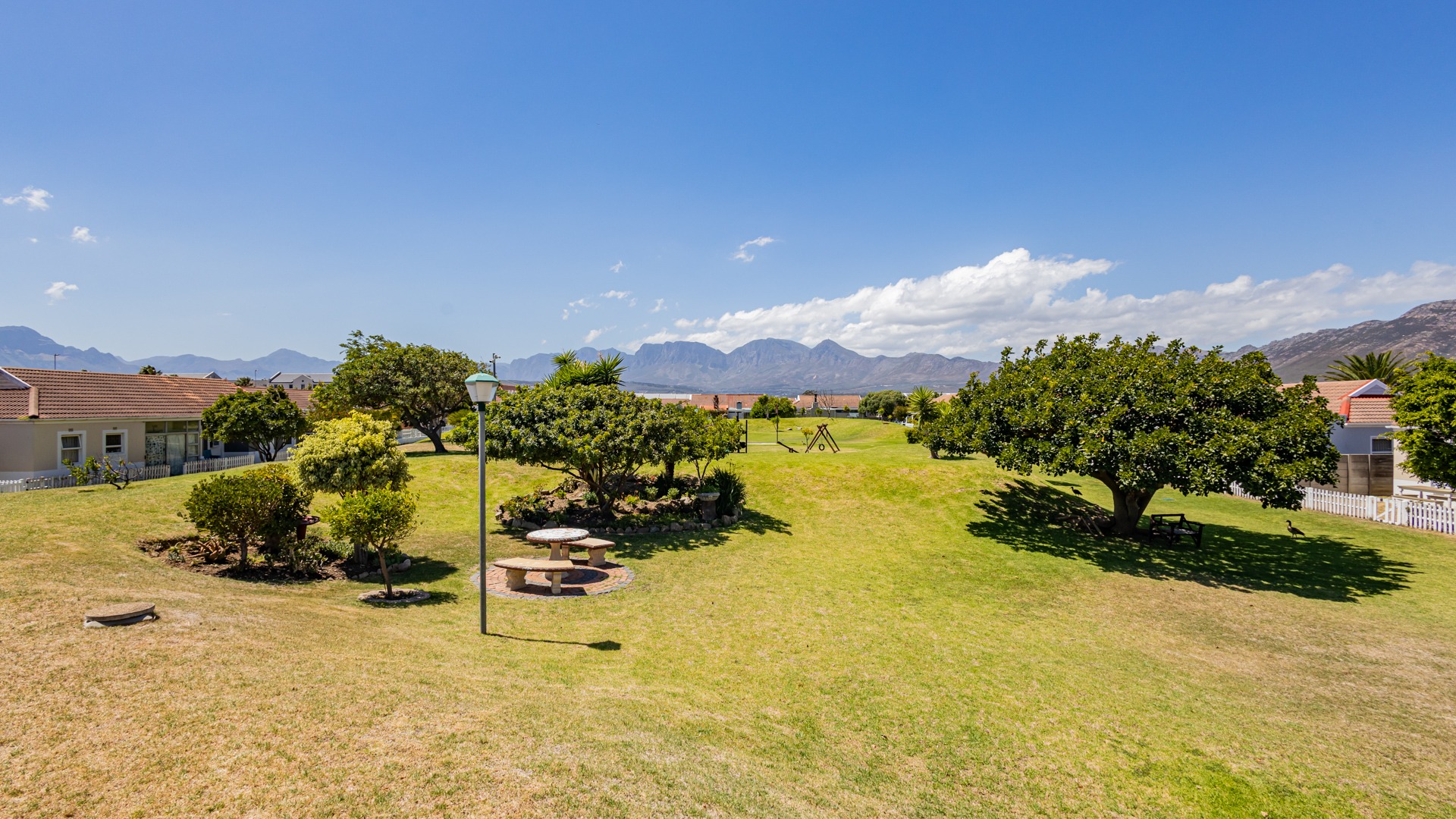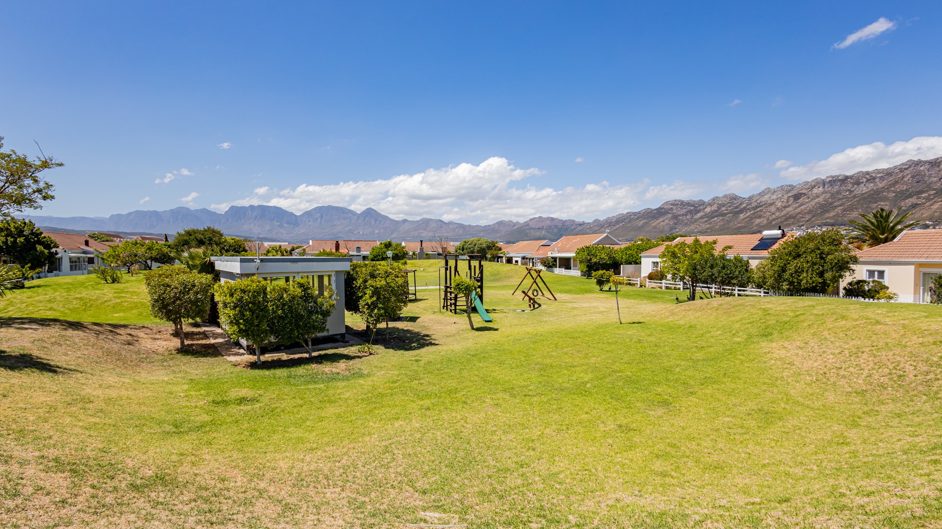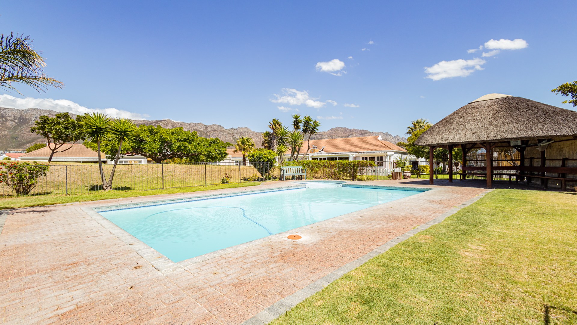 Residents benefit from access to communal amenities, including a swimming pool with a thatched lapa and a children's playground set against a scenic mountain backdrop. Security is paramount in this gated community. The property has been fitted with fibre, ensuring high-speed internet, and is pet-friendly.