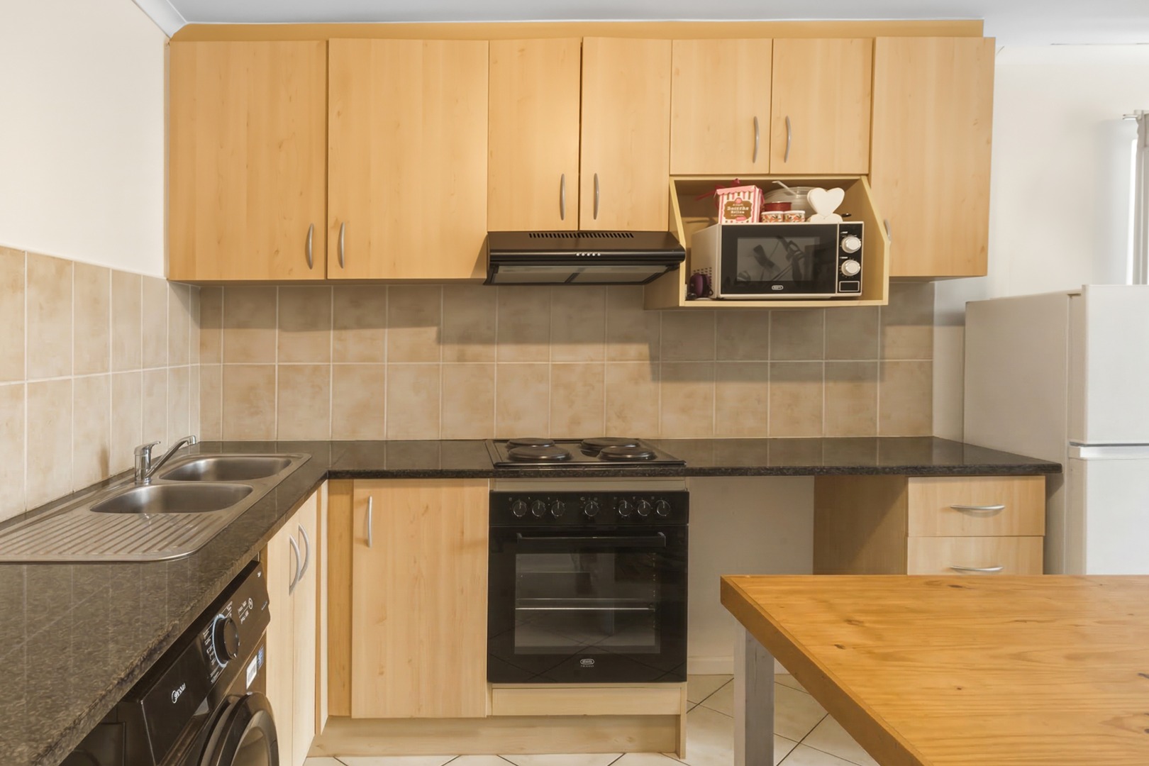 The kitchen is well-designed with ample cupboard space, built-in oven and hob, and space for as dishwasher and washing machine. The open-plan layout makes it ideal for both everyday living and entertaining.