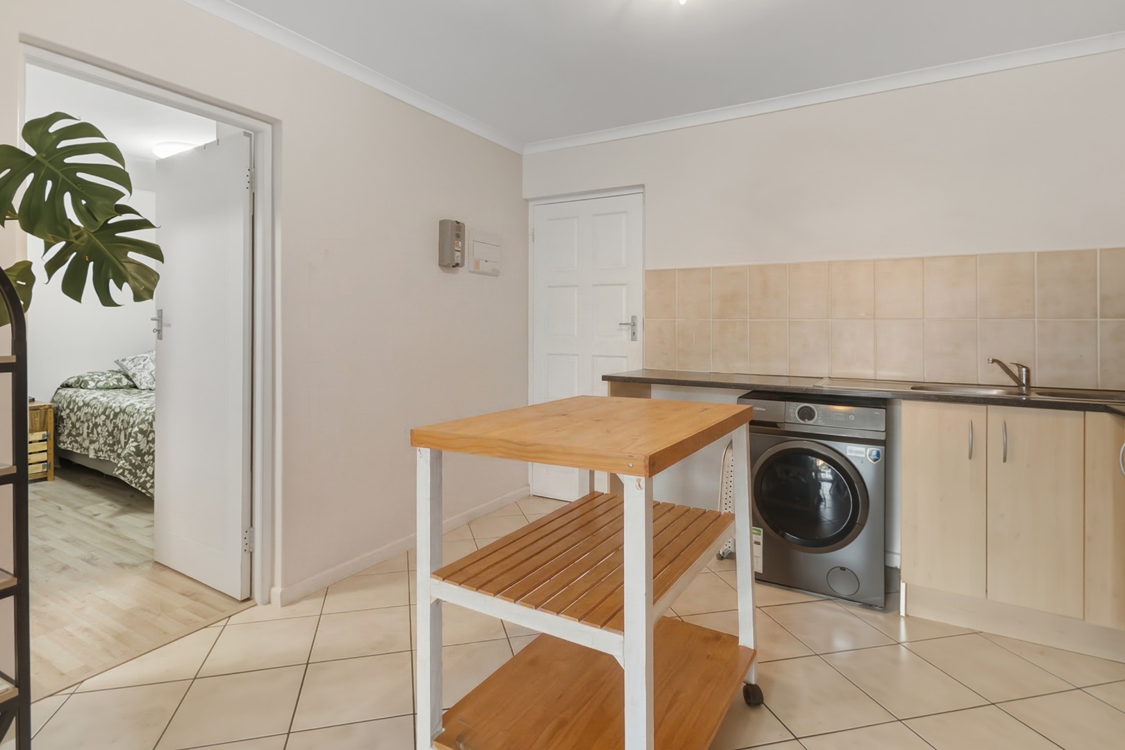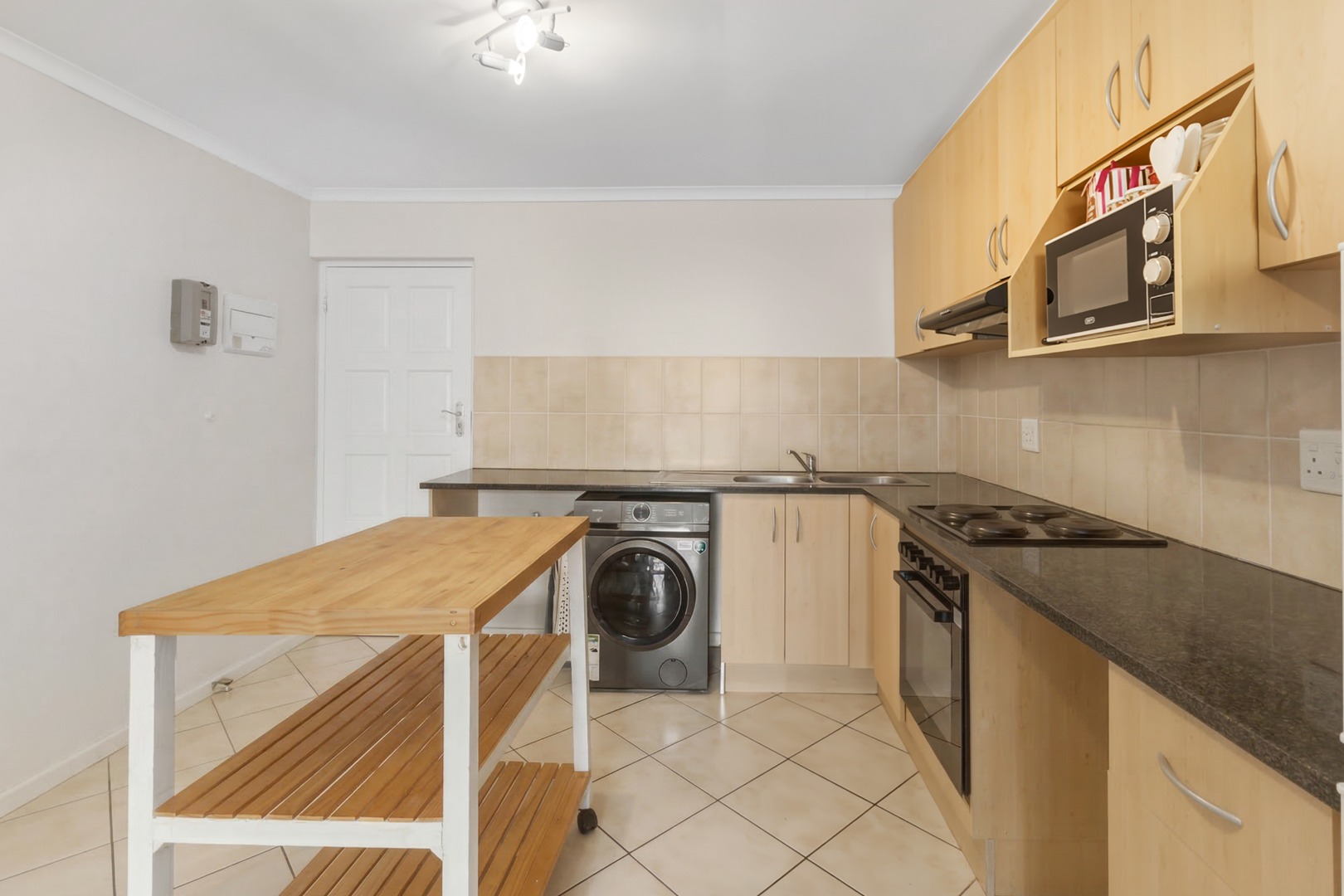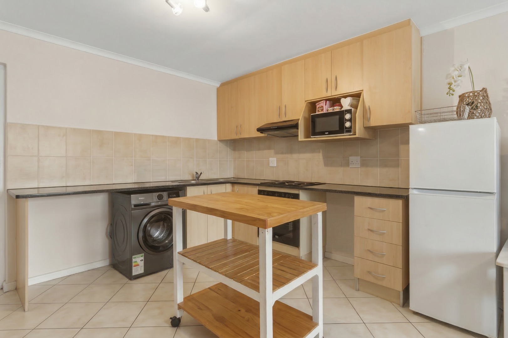 The kitchen is well-designed with ample cupboard space, built-in oven and hob, and space for as dishwasher and washing machine. The open-plan layout makes it ideal for both everyday living and entertaining.