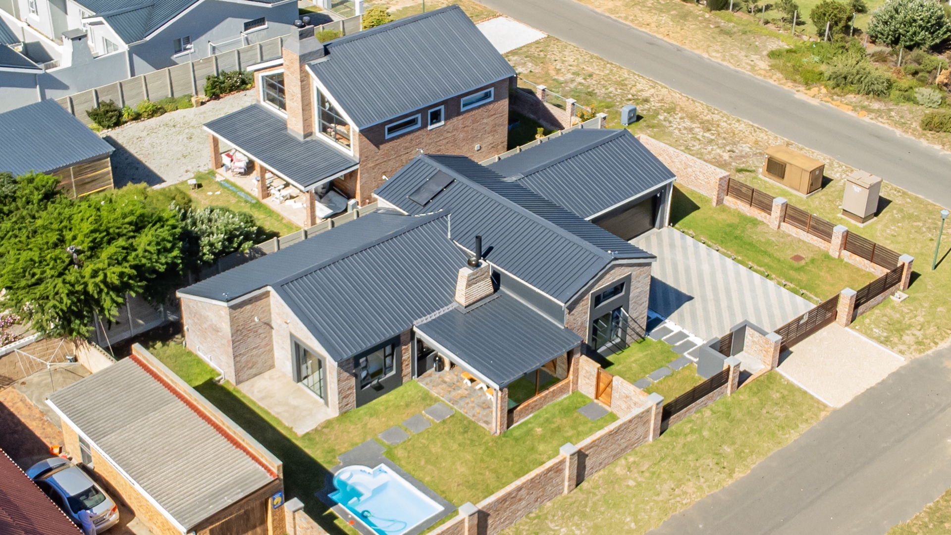 The sustainable features further enhances this home's appeal, including a solar geyser for energy efficiency and a borehole. Security is well-addressed with a fully walled property, an automated gate and an alarm system equipped with outdoor beams. A paved driveway offers ample parking, completing this sophisticated coastal residence.