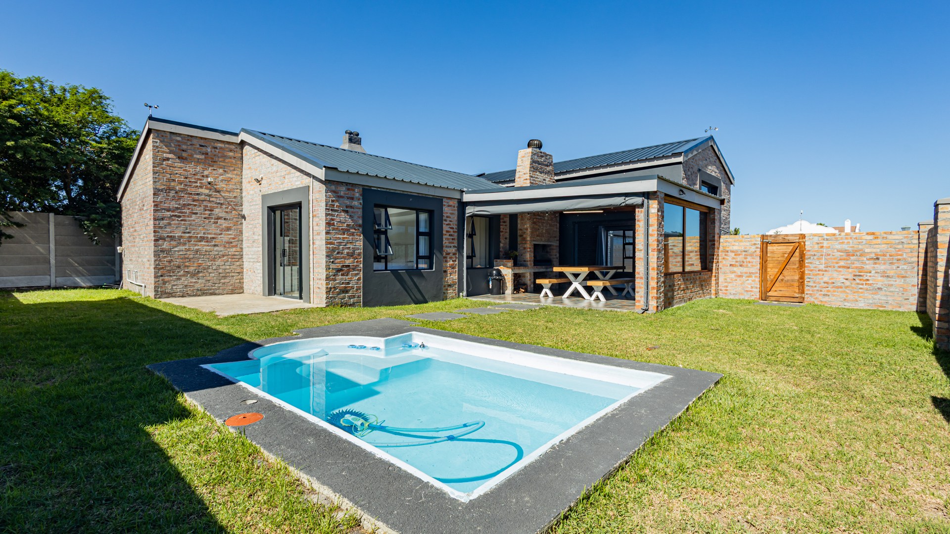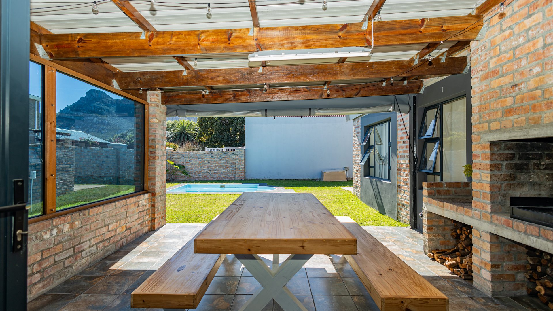 Entertaining: Enclosed patio with built in braai opening to the pool.