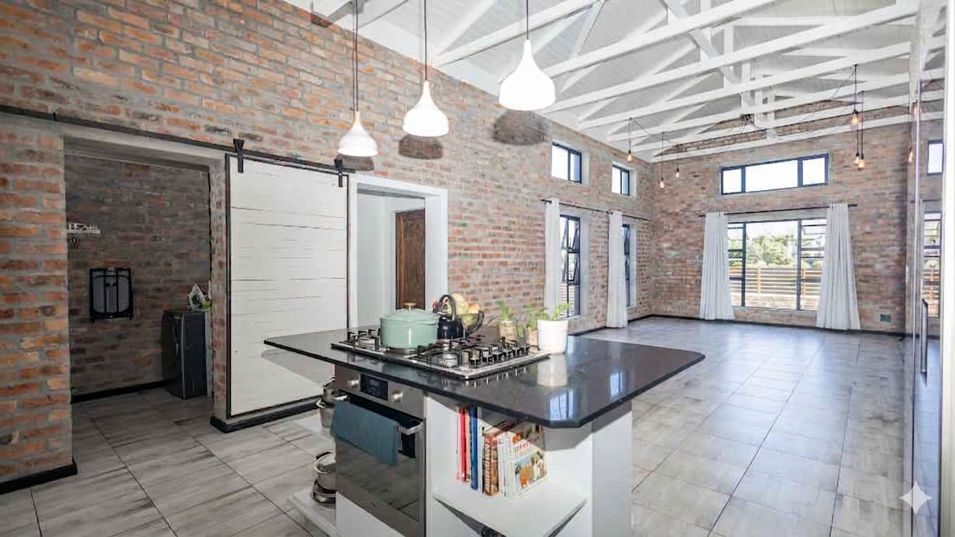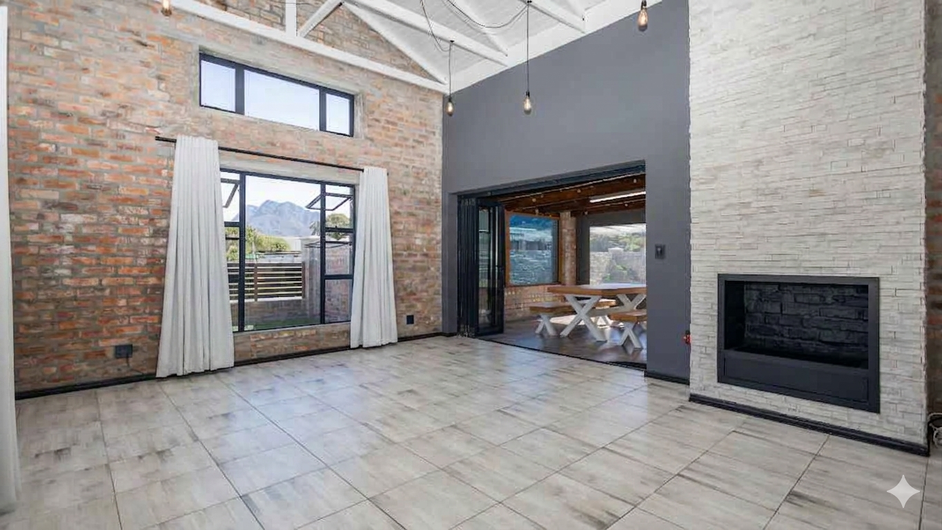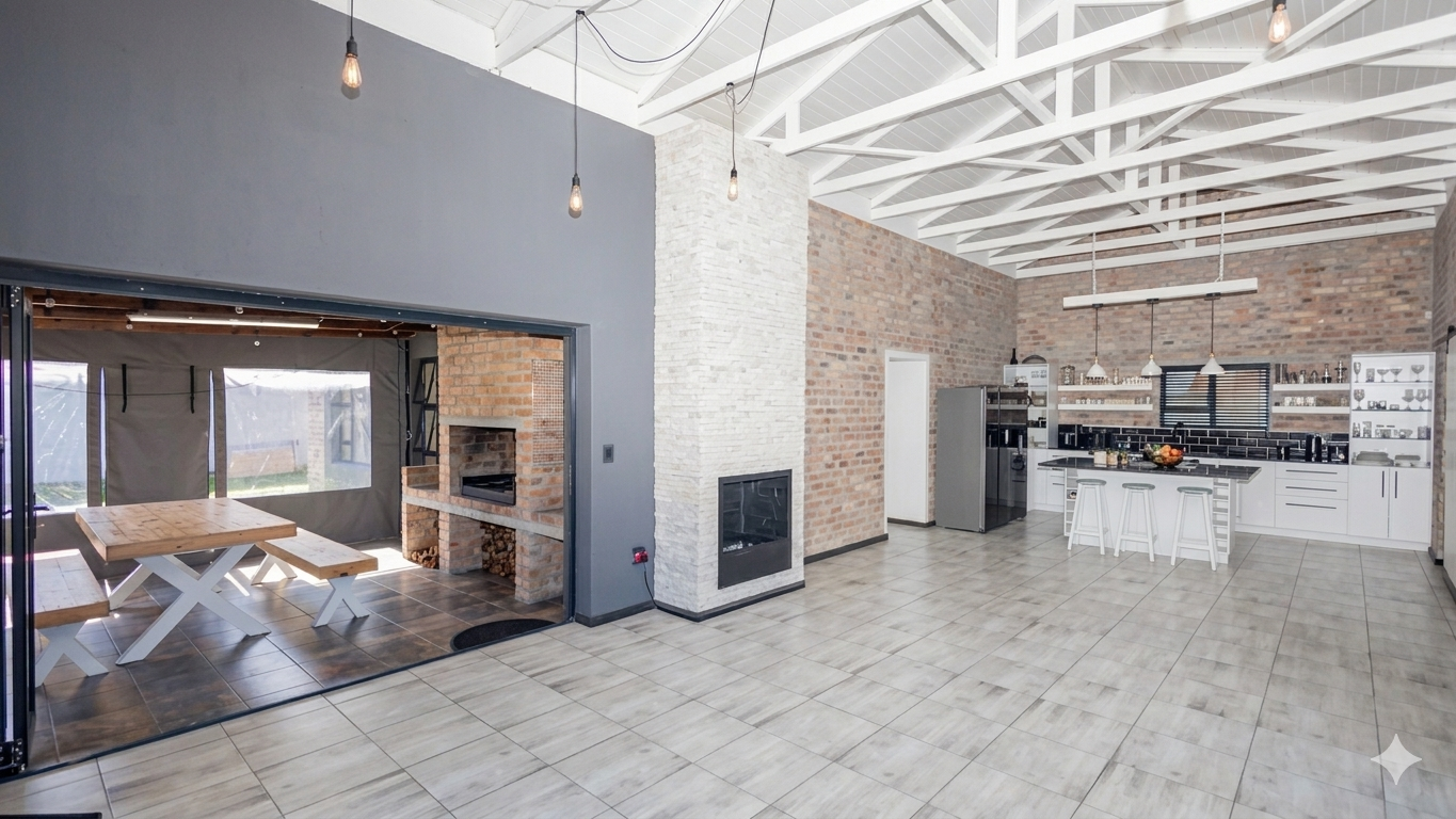 The heart of the home is an expansive, sun-drenched open plan living area where where double-volume ceilings and an abundance of windows throughout invites the sunlight and beauty of the Overberg indoors. In winter, the cozy fireplace becomes the focal point for intimate evenings, while the summer months are defined by the stack doors that disappear to create flow from the lounge to the enclosed braai patio that includes the stylish table and benches. The braai area opens directly to the pool area, creating a relaxing and refreshing atmosphere.