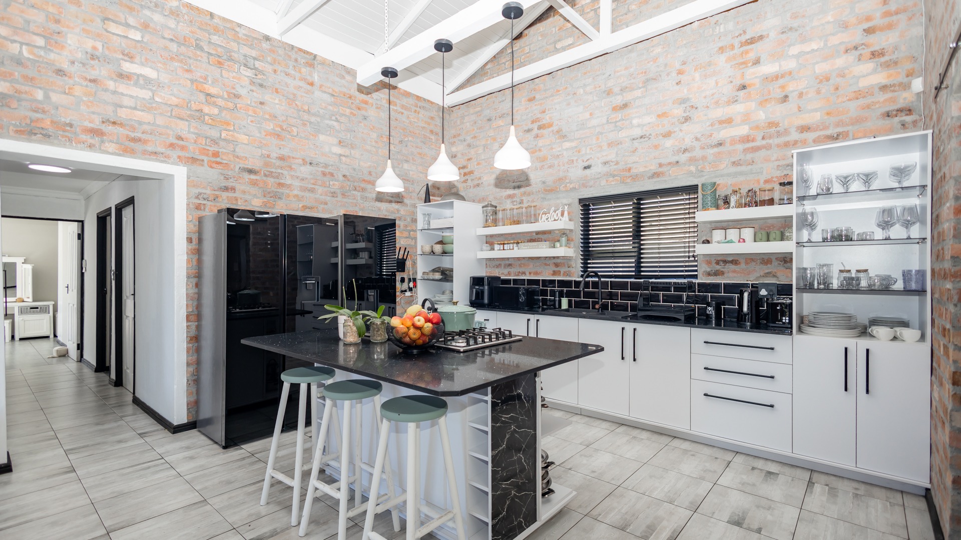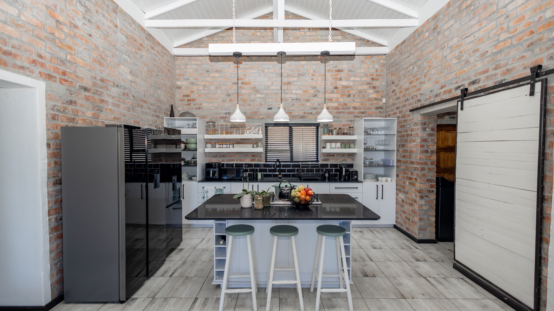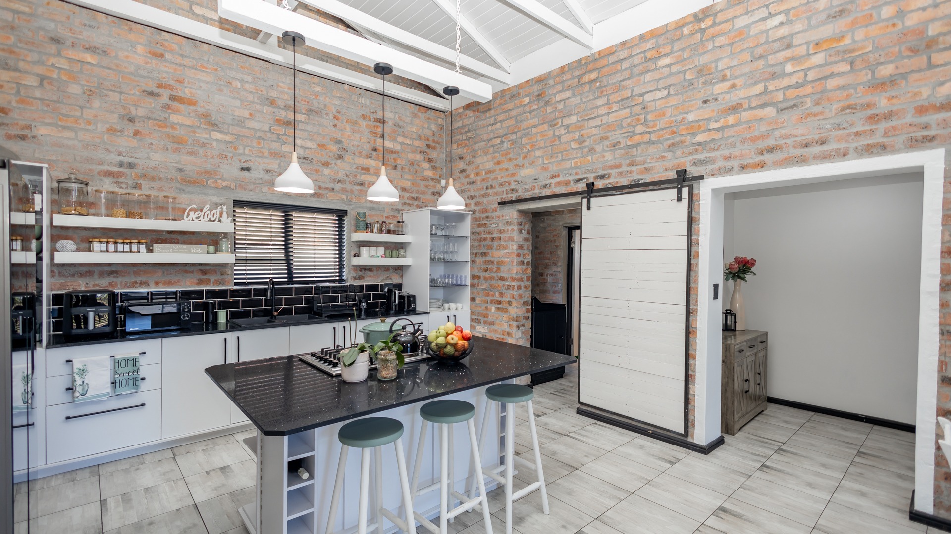 The heart of the home is an expansive, sun-drenched open plan living area where where double-volume ceilings and an abundance of windows throughout invites the sunlight and beauty of the Overberg indoors. In winter, the cozy fireplace becomes the focal point for intimate evenings, while the summer months are defined by the stack doors that disappear to create flow from the lounge to the enclosed braai patio that includes the stylish table and benches. The braai area opens directly to the pool area, creating a relaxing and refreshing atmosphere.