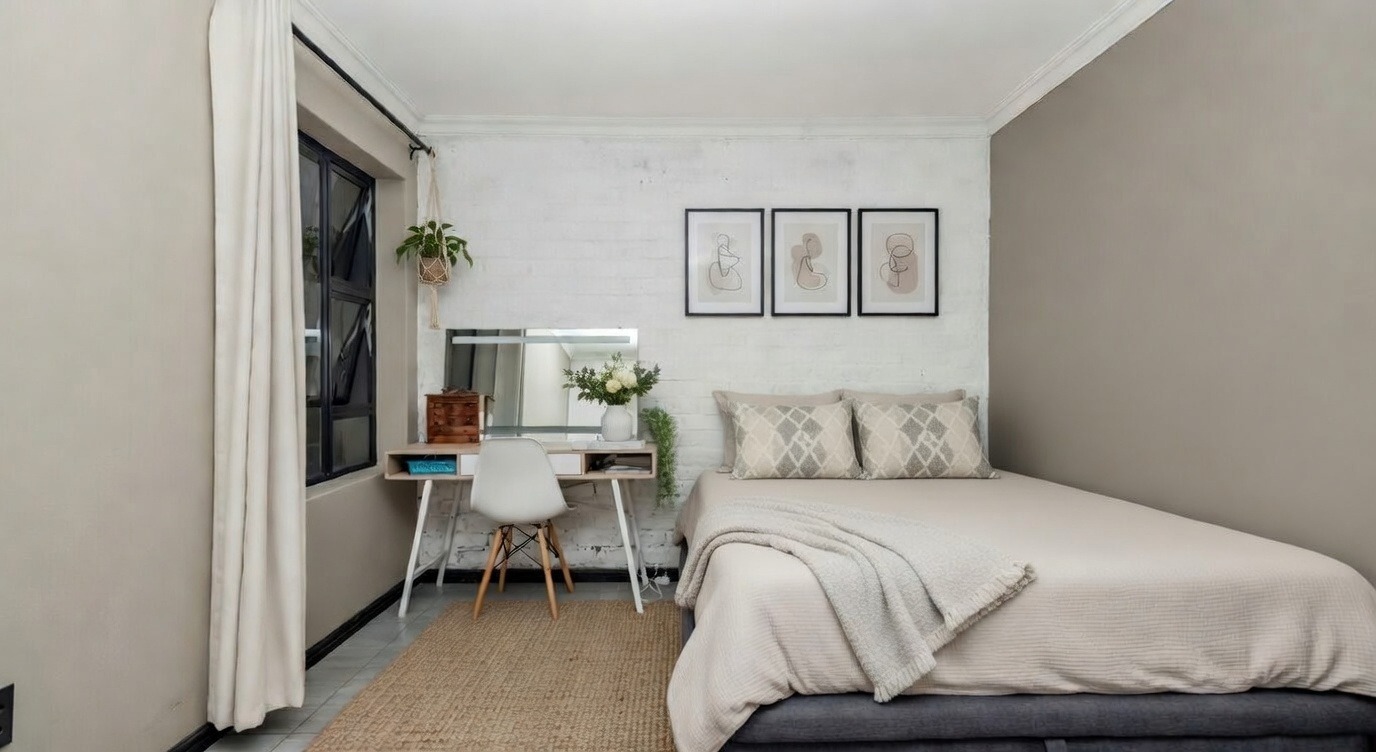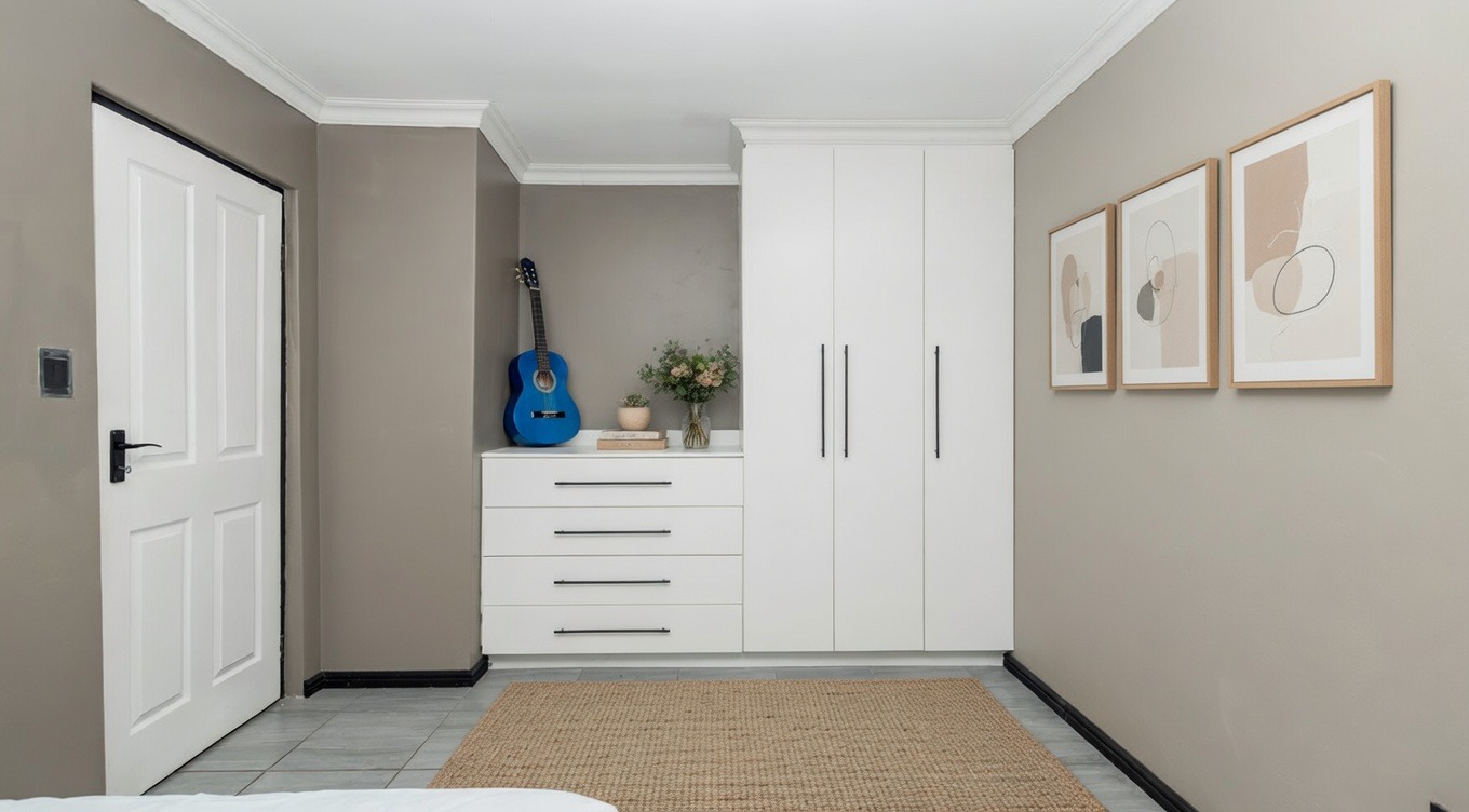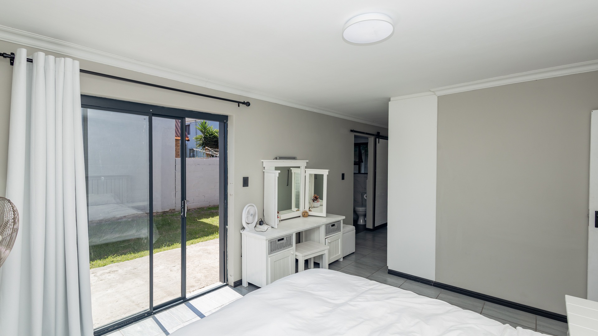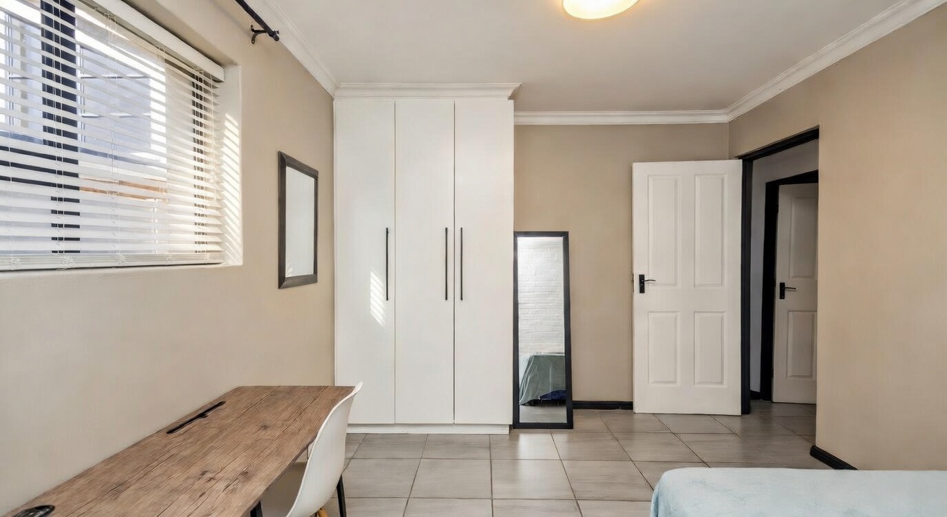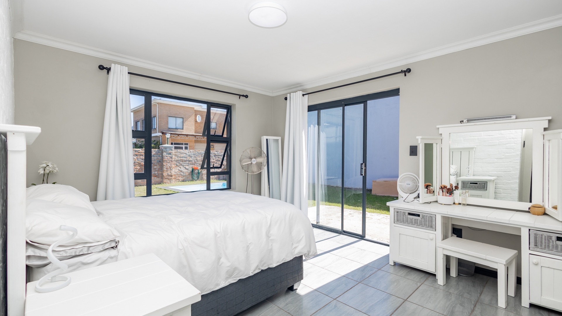 The property boasts three spacious bedrooms, including two guest bedrooms with built-in cupboards and a full family bathroom. The master suite offers a private retreat with an en-suite bathroom and sliding doors opening directly to the back garden, This is a private haven, fully walled and neatly laid to lawn, surrounding the sparkling pool.