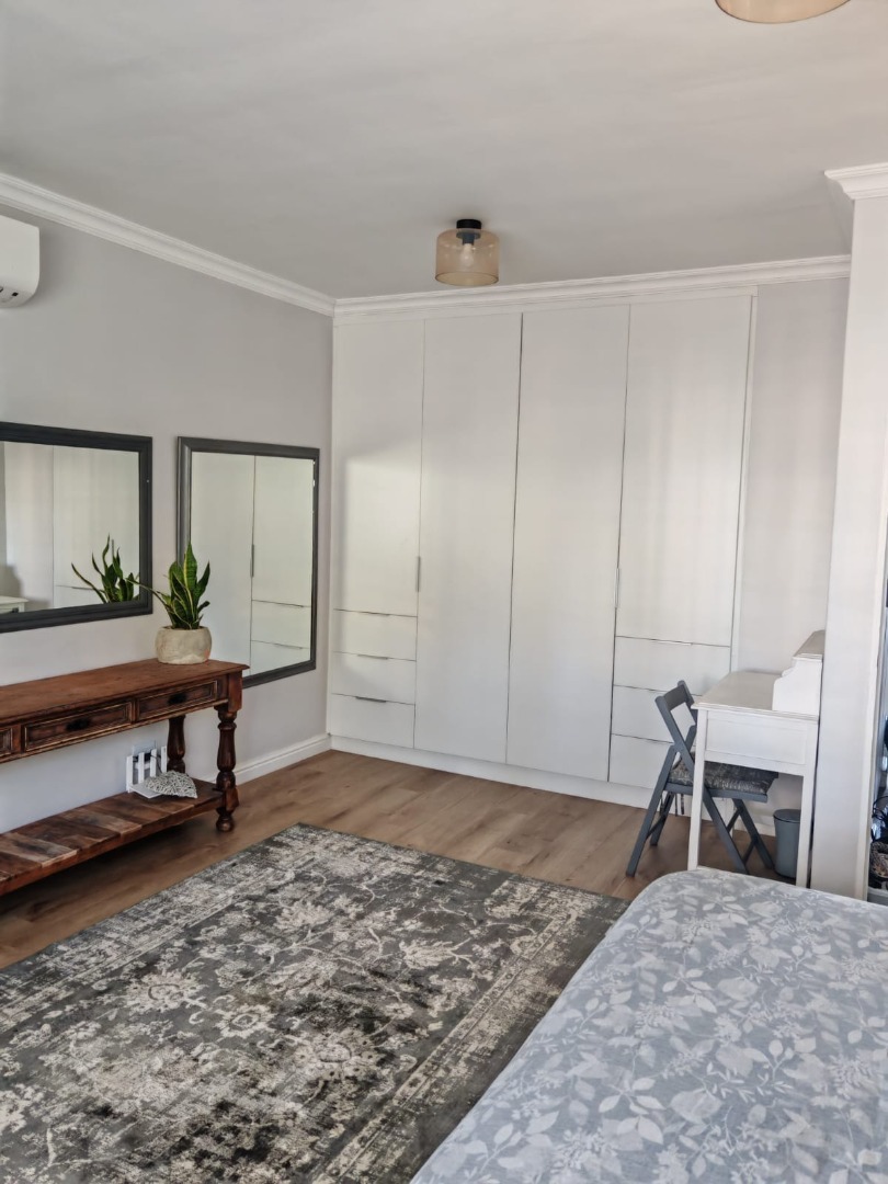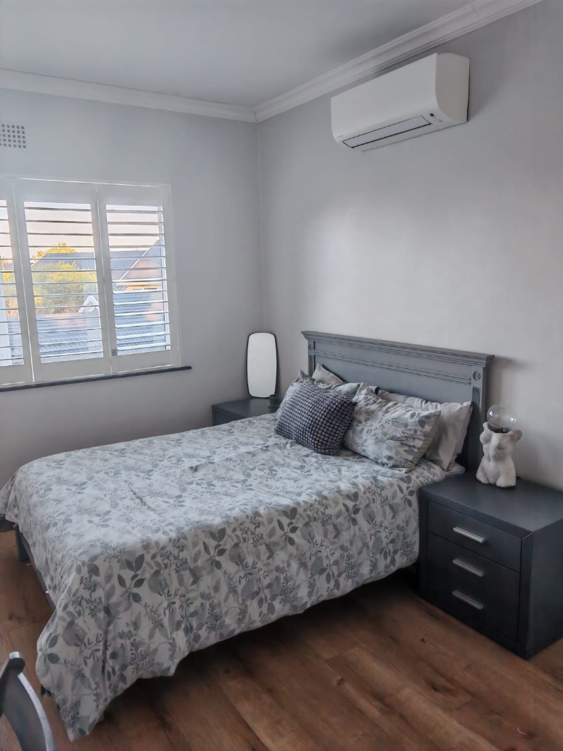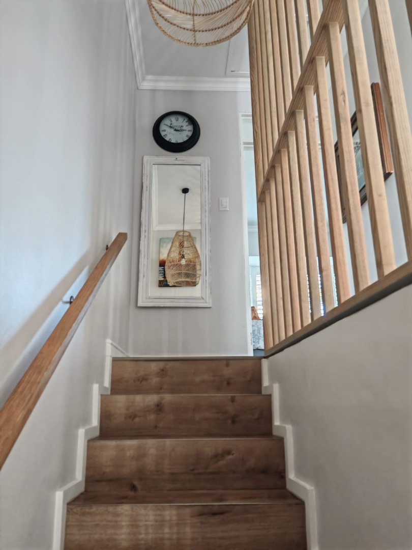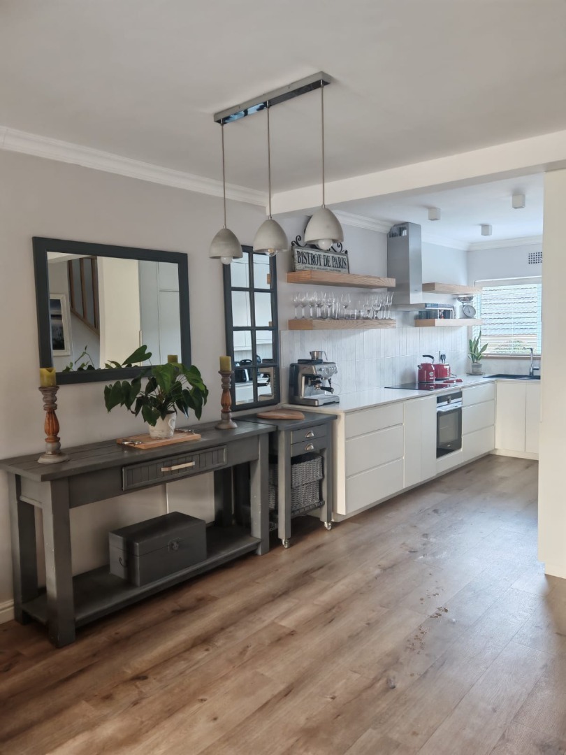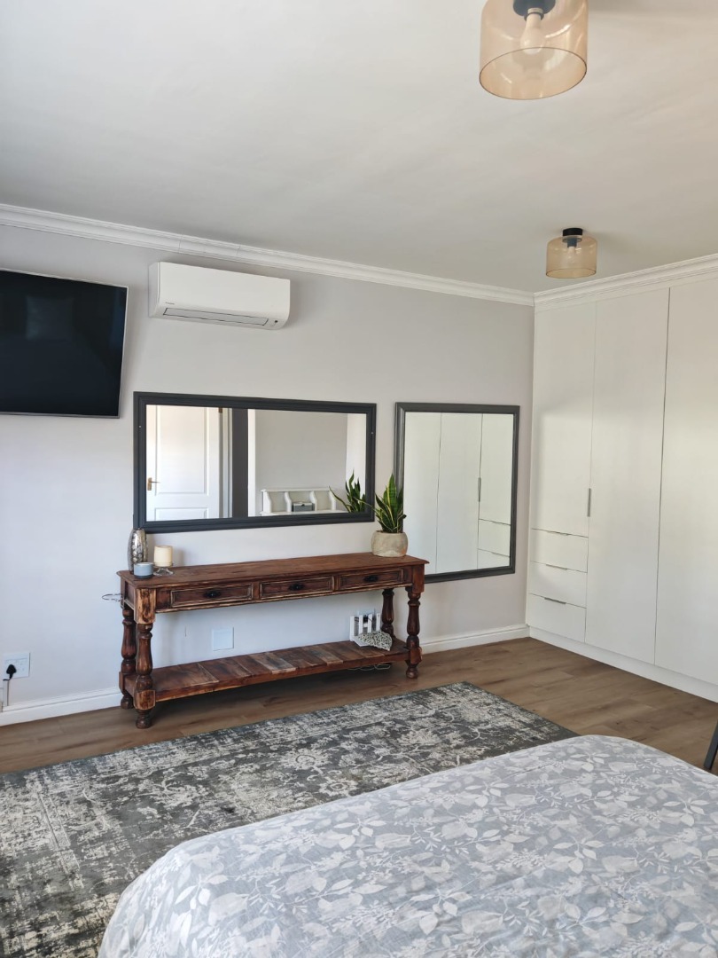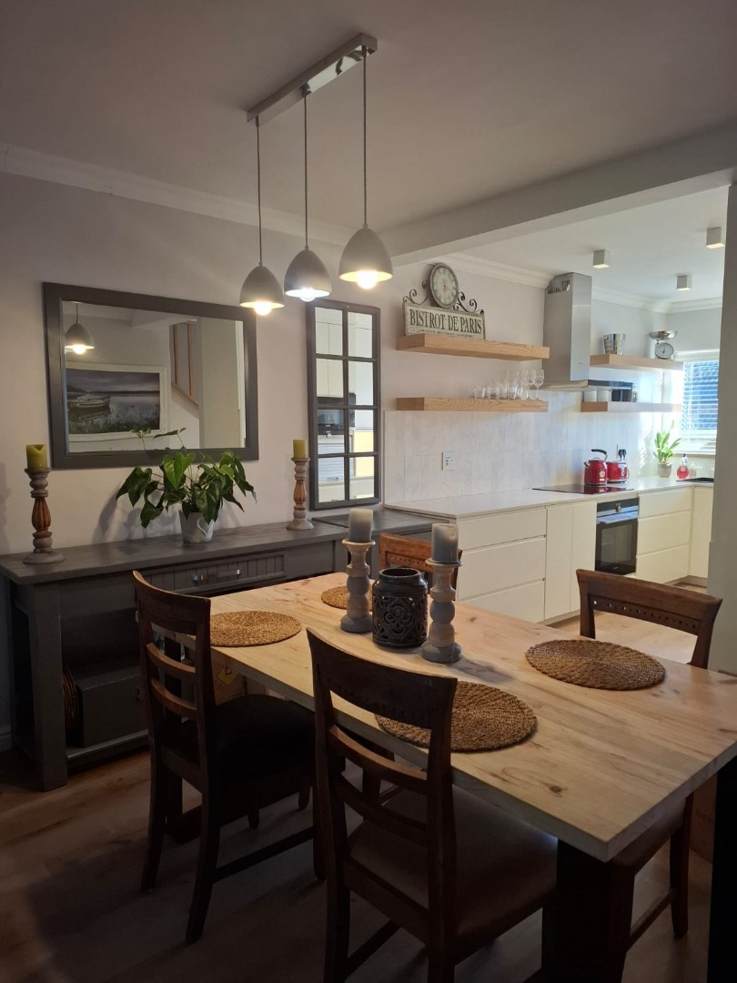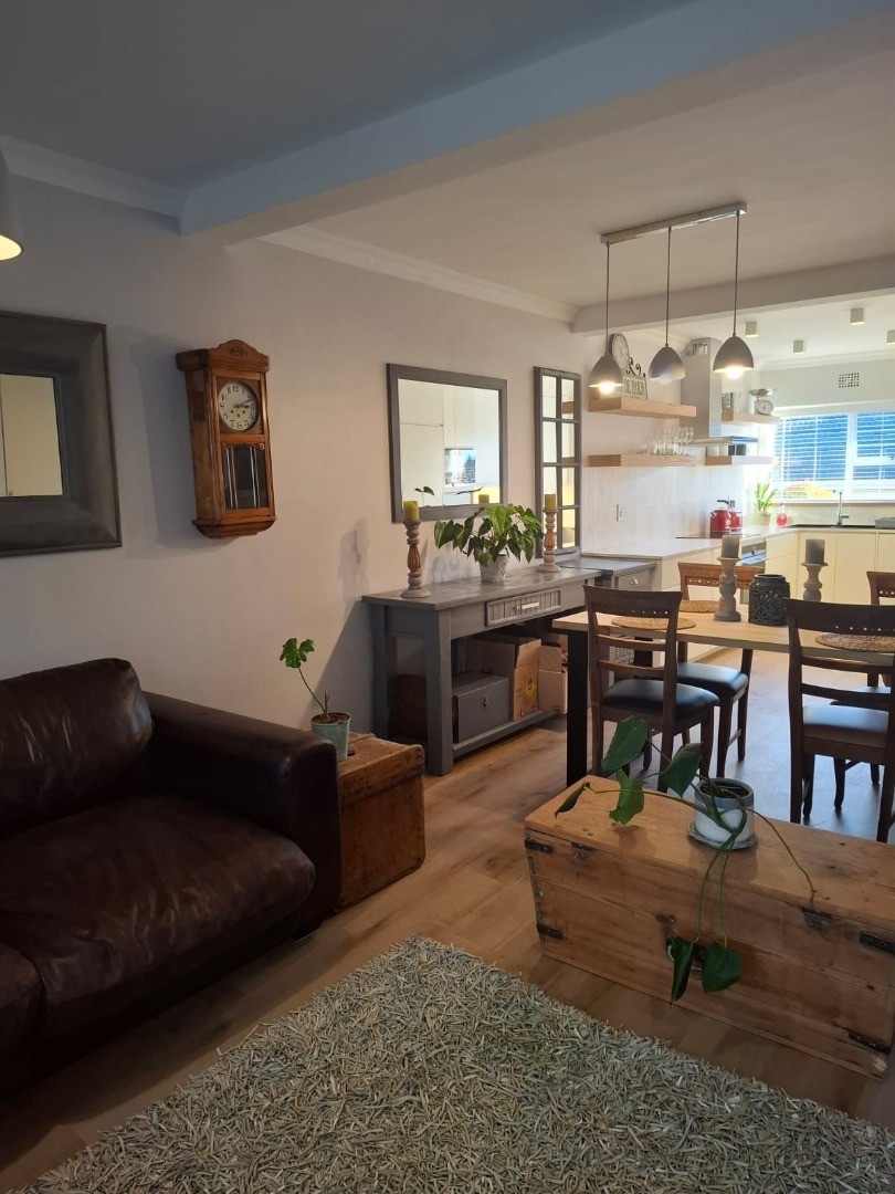 Discover modern living in this North facing,stylish, upgraded and renovated 2-bedroom apartment located within a desirable residential complex in Briza, Somerset West. Spanning 110 square meters, this residence offers a seamless open-plan layout, connecting a spacious lounge, dining area, and a contemporary kitchen with a storage facility underneath the stairs and a guest toilet with basin. The kitchen is a highlight, featuring sleek light cabinetry, elegant countertops, a marble-effect subway tile backsplash, and warm wooden floating shelves. It comes equipped with integrated appliances as in the oven, hob and extractor, fridge/freezer, microwave and dishwasher. Small study console on the one wall with space for TV as well. American shutters, alarm, trellidoors, CCTV cameras and air conditioners as extras. Hardwood-look flooring and neutral wall tones create a sophisticated and inviting atmosphere throughout.