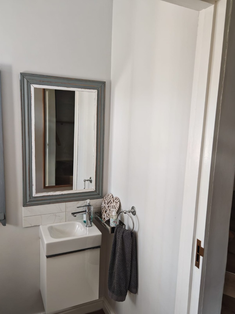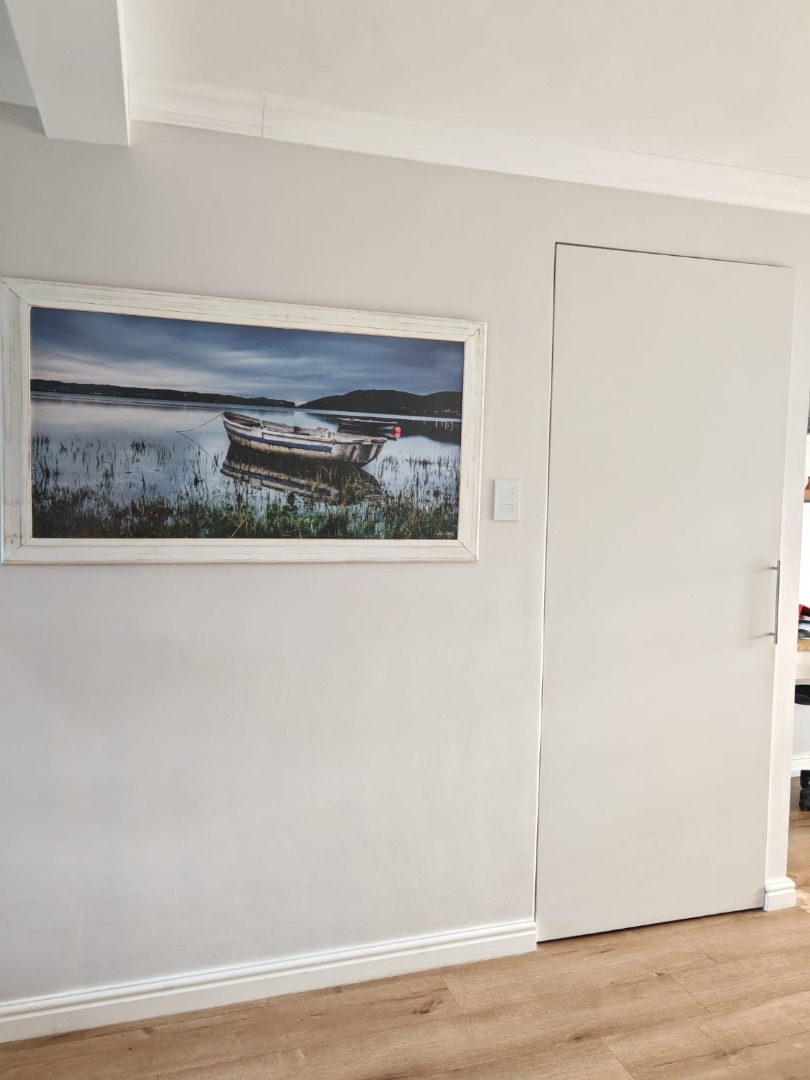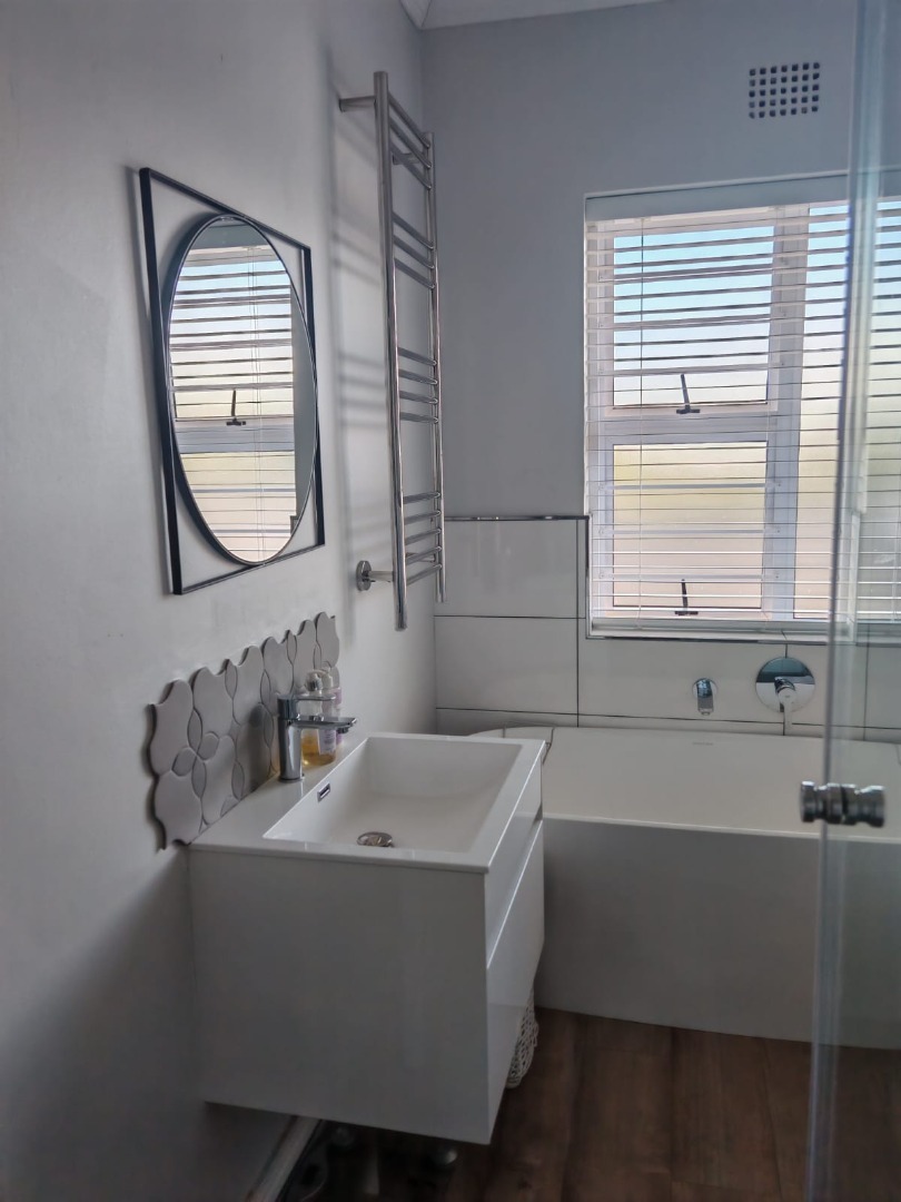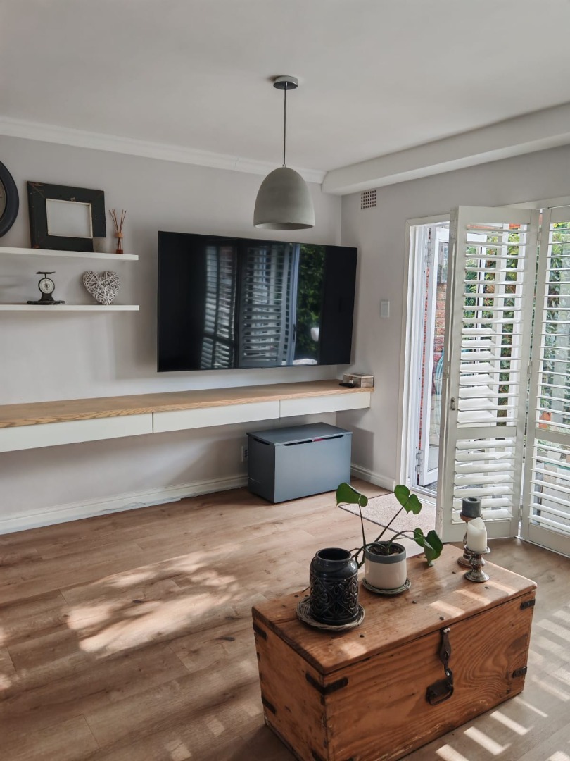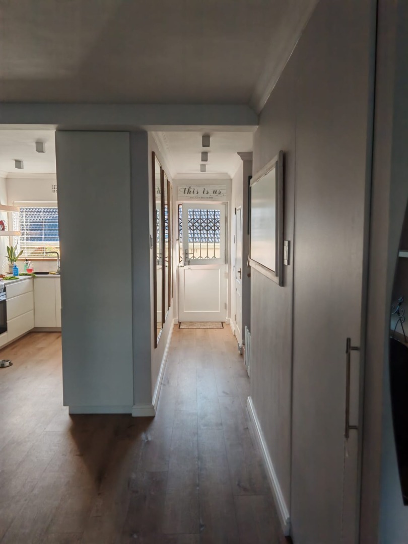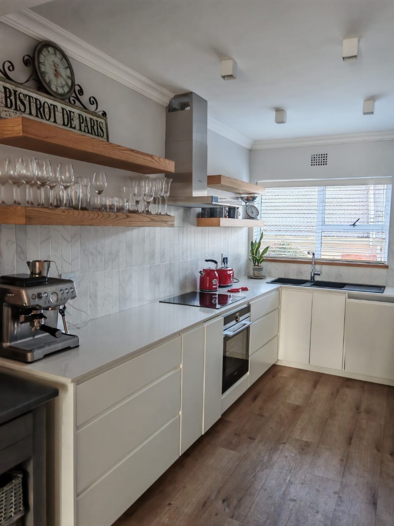 Discover modern living in this North facing,stylish, upgraded and renovated 2-bedroom apartment located within a desirable residential complex in Briza, Somerset West. Spanning 110 square meters, this residence offers a seamless open-plan layout, connecting a spacious lounge, dining area, and a contemporary kitchen with a storage facility underneath the stairs and a guest toilet with basin. The kitchen is a highlight, featuring sleek light cabinetry, elegant countertops, a marble-effect subway tile backsplash, and warm wooden floating shelves. It comes equipped with integrated appliances as in the oven, hob and extractor, fridge/freezer, microwave and dishwasher. Small study console on the one wall with space for TV as well. American shutters, alarm, trellidoors, CCTV cameras and air conditioners as extras. Hardwood-look flooring and neutral wall tones create a sophisticated and inviting atmosphere throughout.