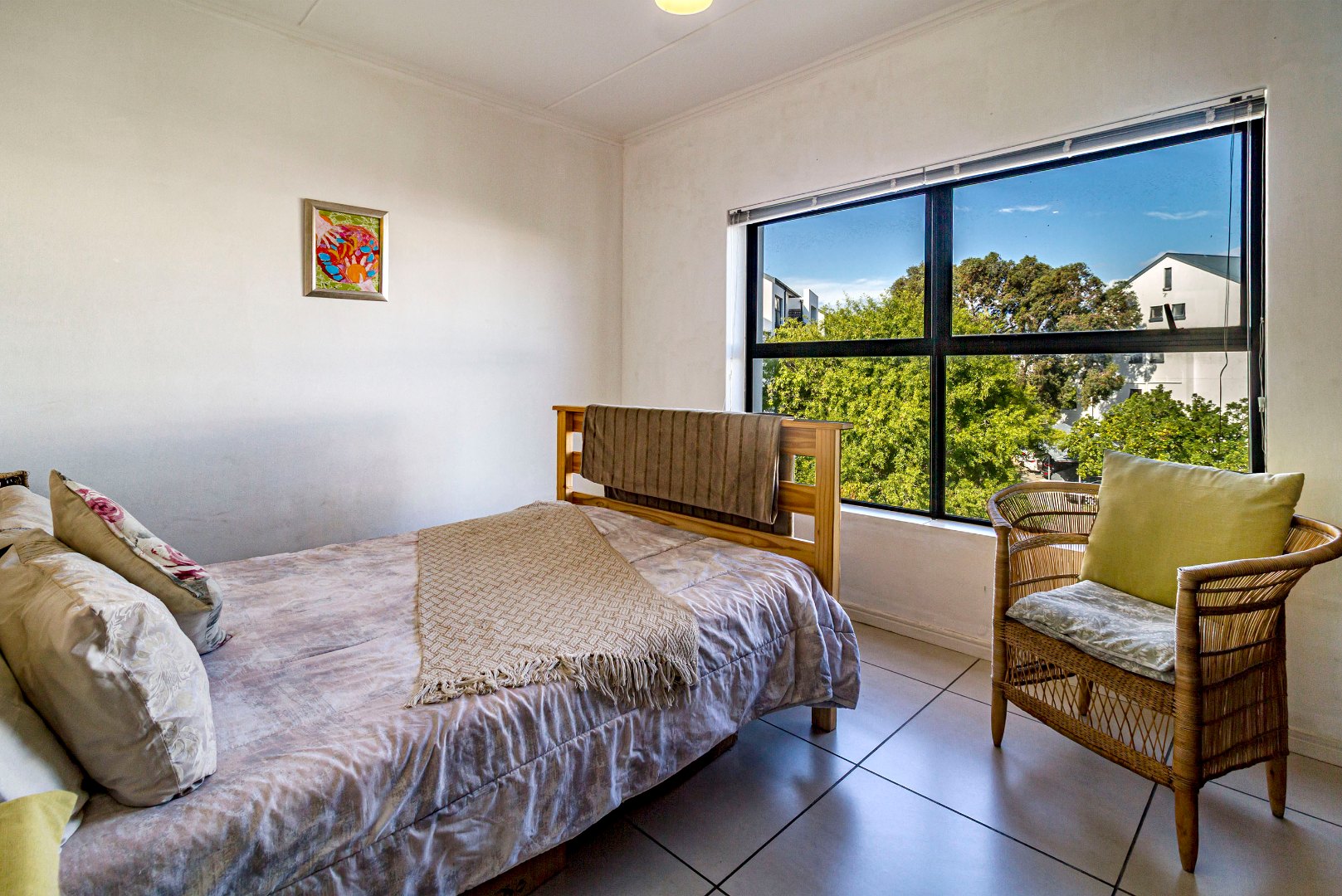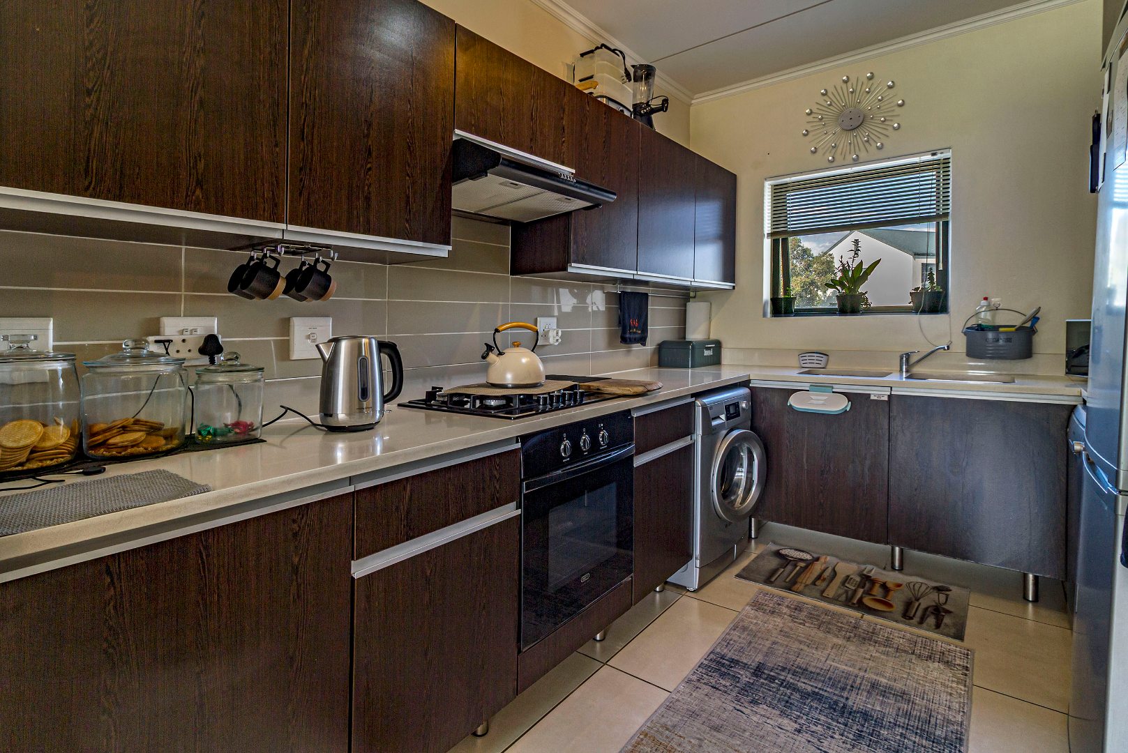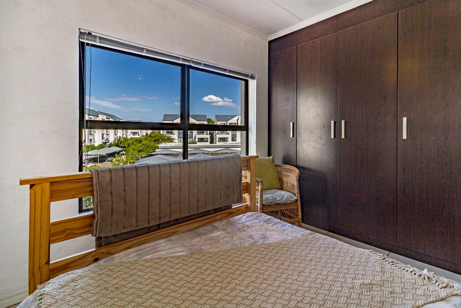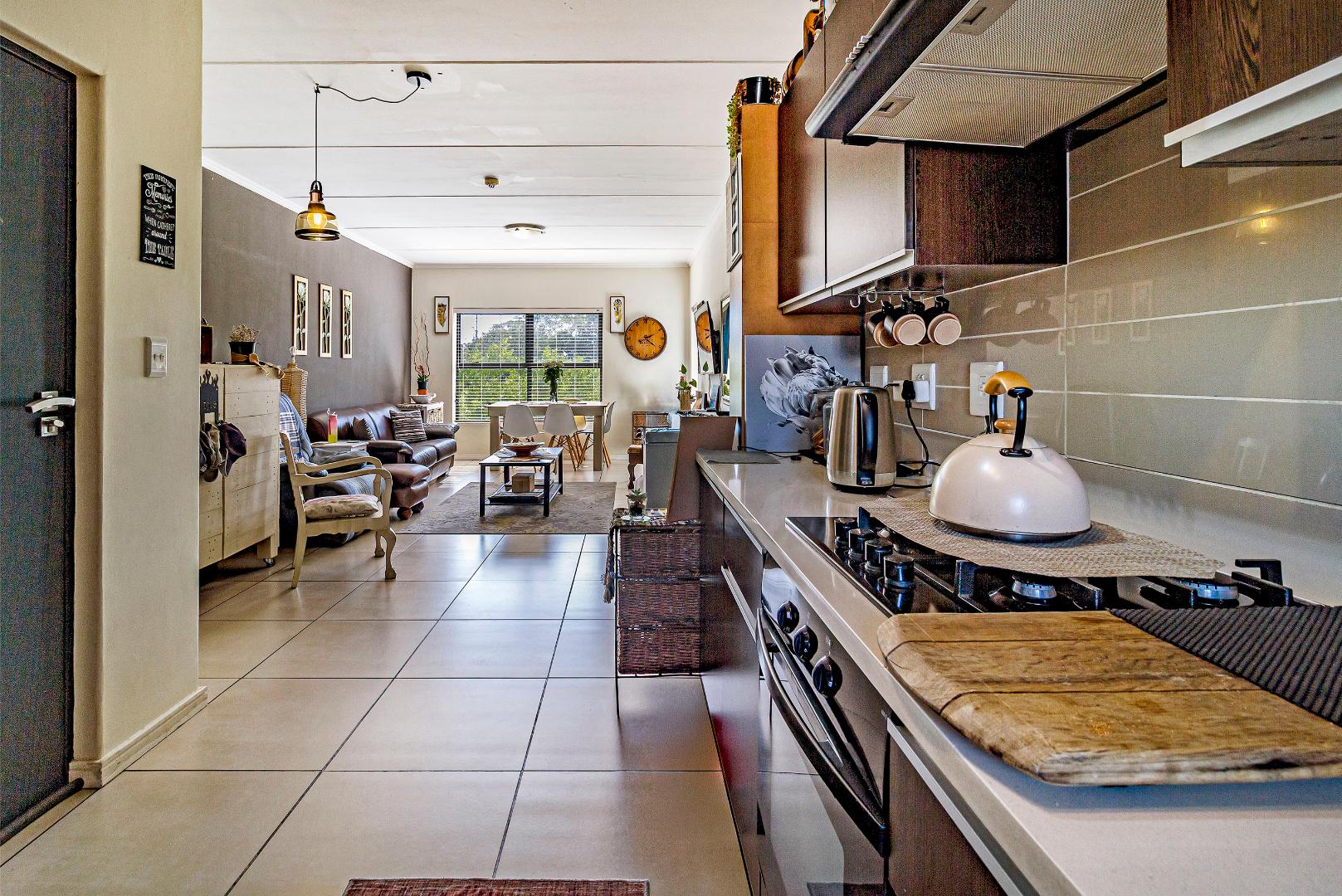 Joint Mandate. This well-maintained 96 m² apartment is situated in the highly sought-after De Velde Lifestyle Estate, offering secure, modern living in one of Somerset West’s most popular residential estates. The open-plan kitchen, dining, and living area creates a comfortable sense of space and flows seamlessly onto a private balcony, ideal for everyday living or relaxed entertaining. The contemporary kitchen is fitted with Caesarstone countertops, ample built-in cupboards, a gas hob, electric oven, and plumbing for both a washing machine and dishwasher.