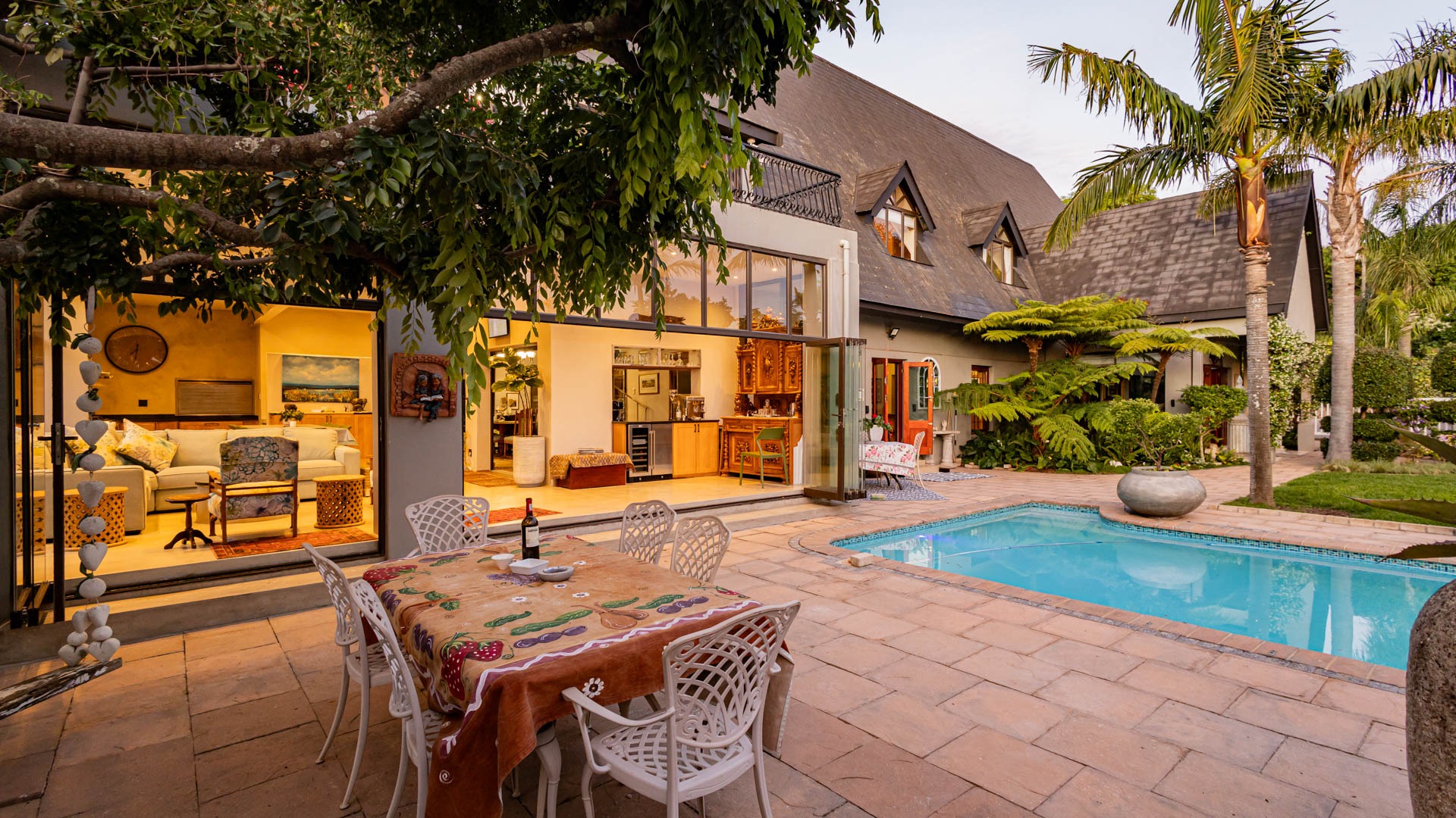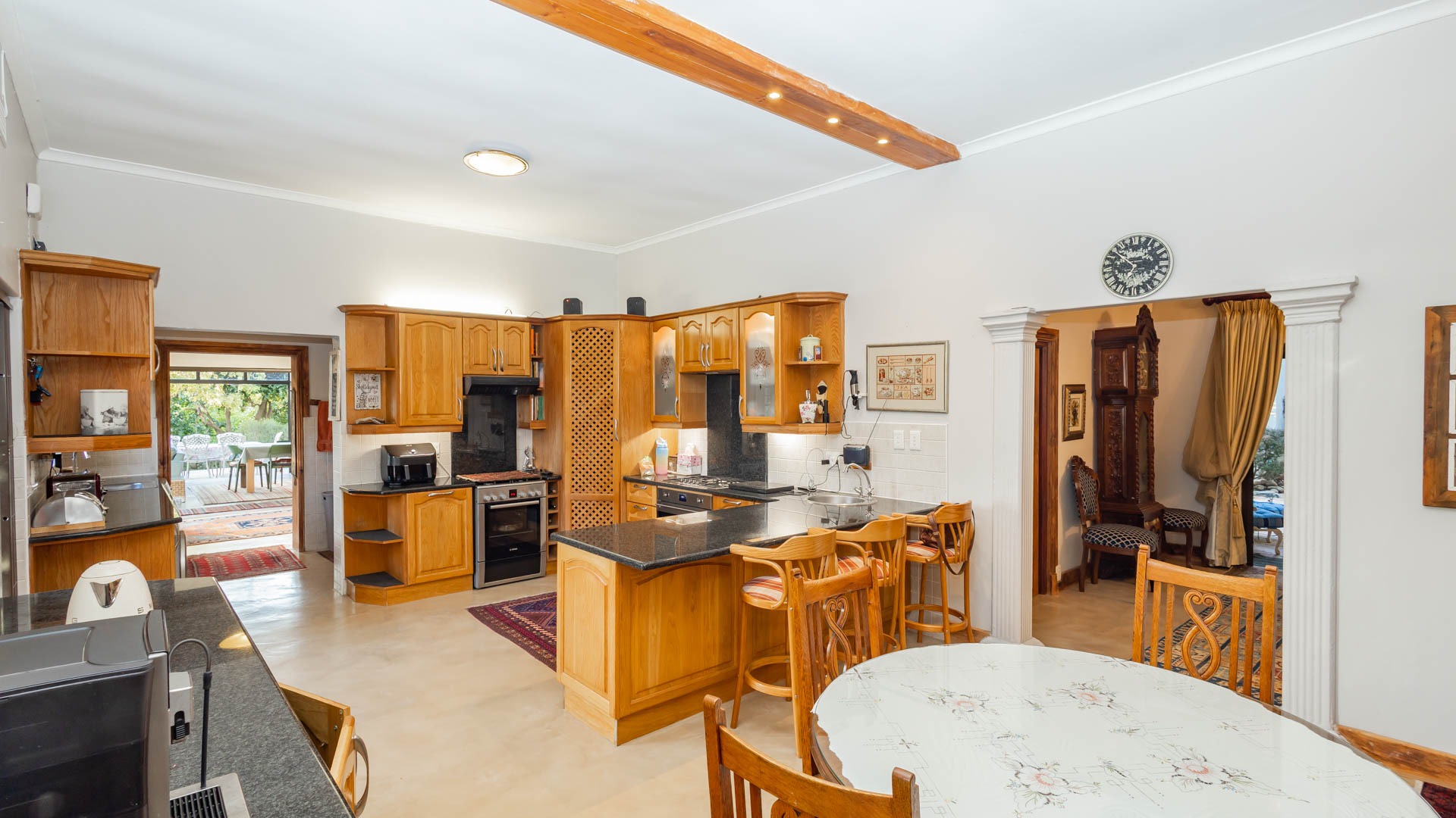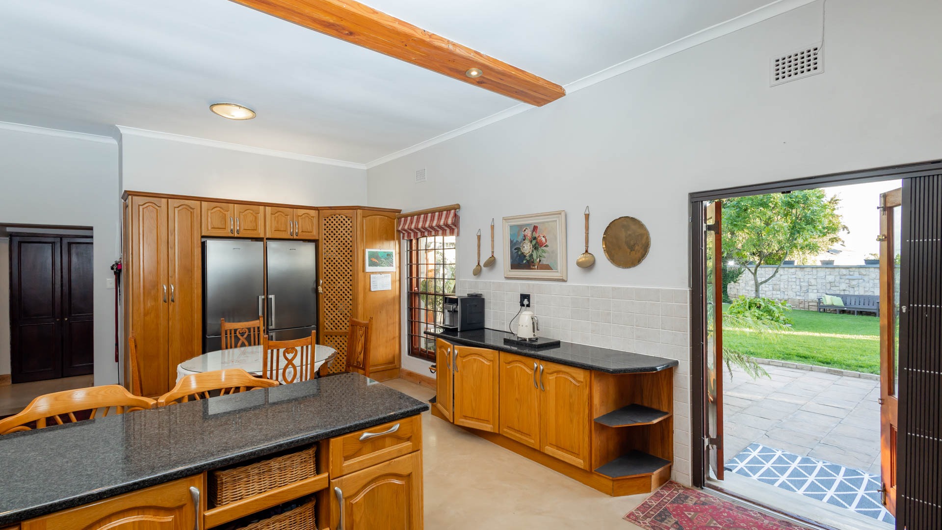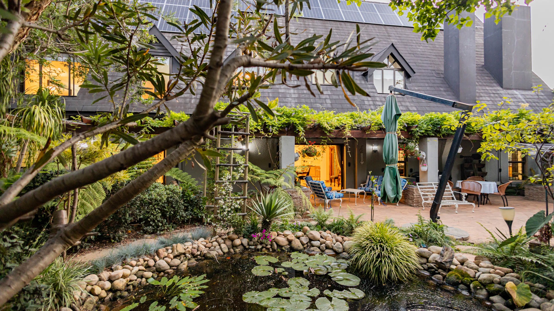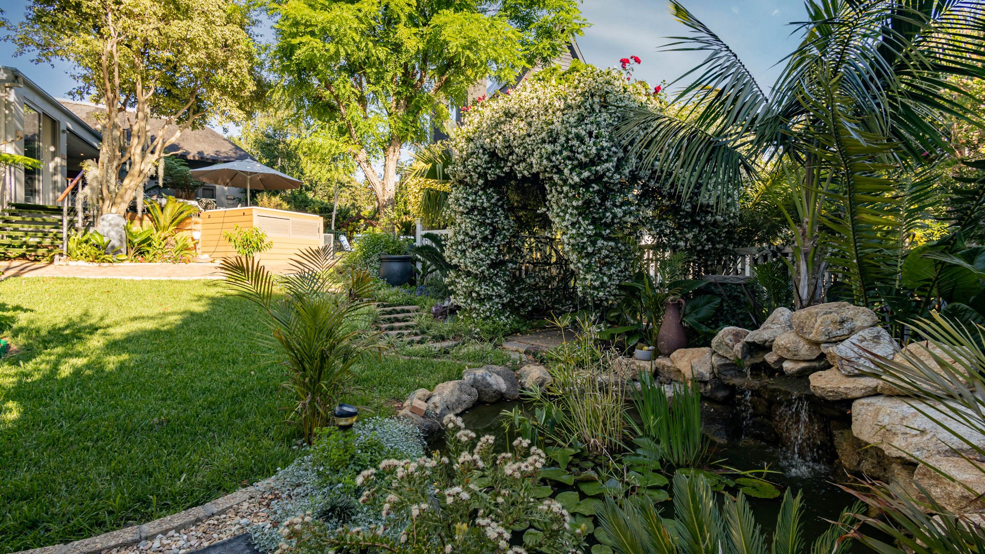 The main residence is spacious, versatile and designed for lifestyle living with extensive indoor and outdoor entertainment areas. It includes six bedrooms, five bathrooms, four garages and a wine cellar that can hold around three thousand bottles. The home is supported by strong infrastructure including a borehole producing approximately 4500 litres per hour, two eleven thousand litre storage tanks, full irrigation, a 34 panel solar system with 2 x 12 KW inverters and 12 x 5 kilowatt batteries. Outdoor features include mature landscaped gardens, koi ponds, water features, two fire pits, wendy houses, a Jacuzzi and both gas and wood fireplaces. The kitchen offers a Smeg gas hob and oven together with a second Bosch oven and a built in wood and gas braai in the braai room overlooking the pool. The garden has been established over more than three decades and includes rare trees and plant species that attract abundant birdlife.