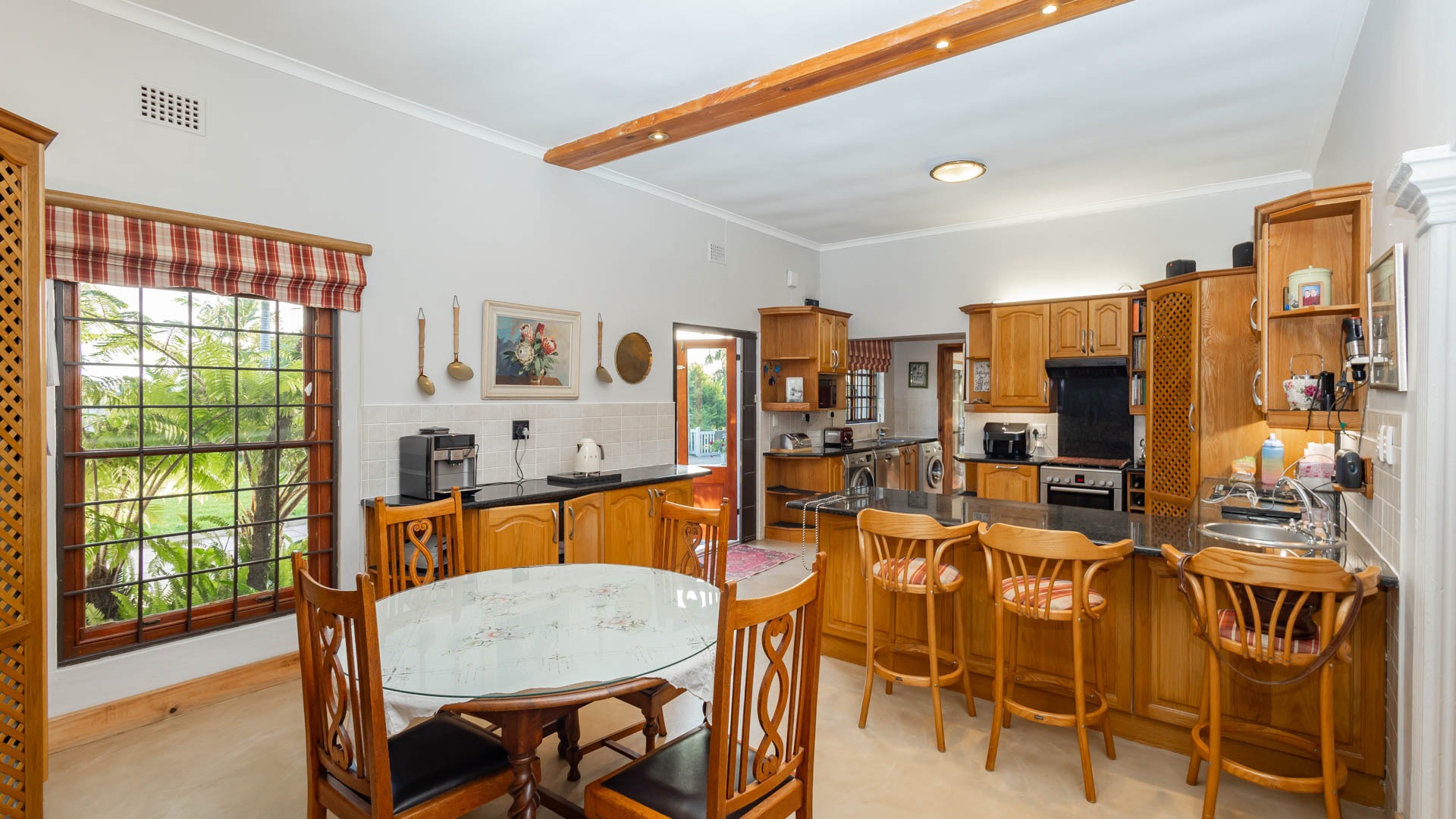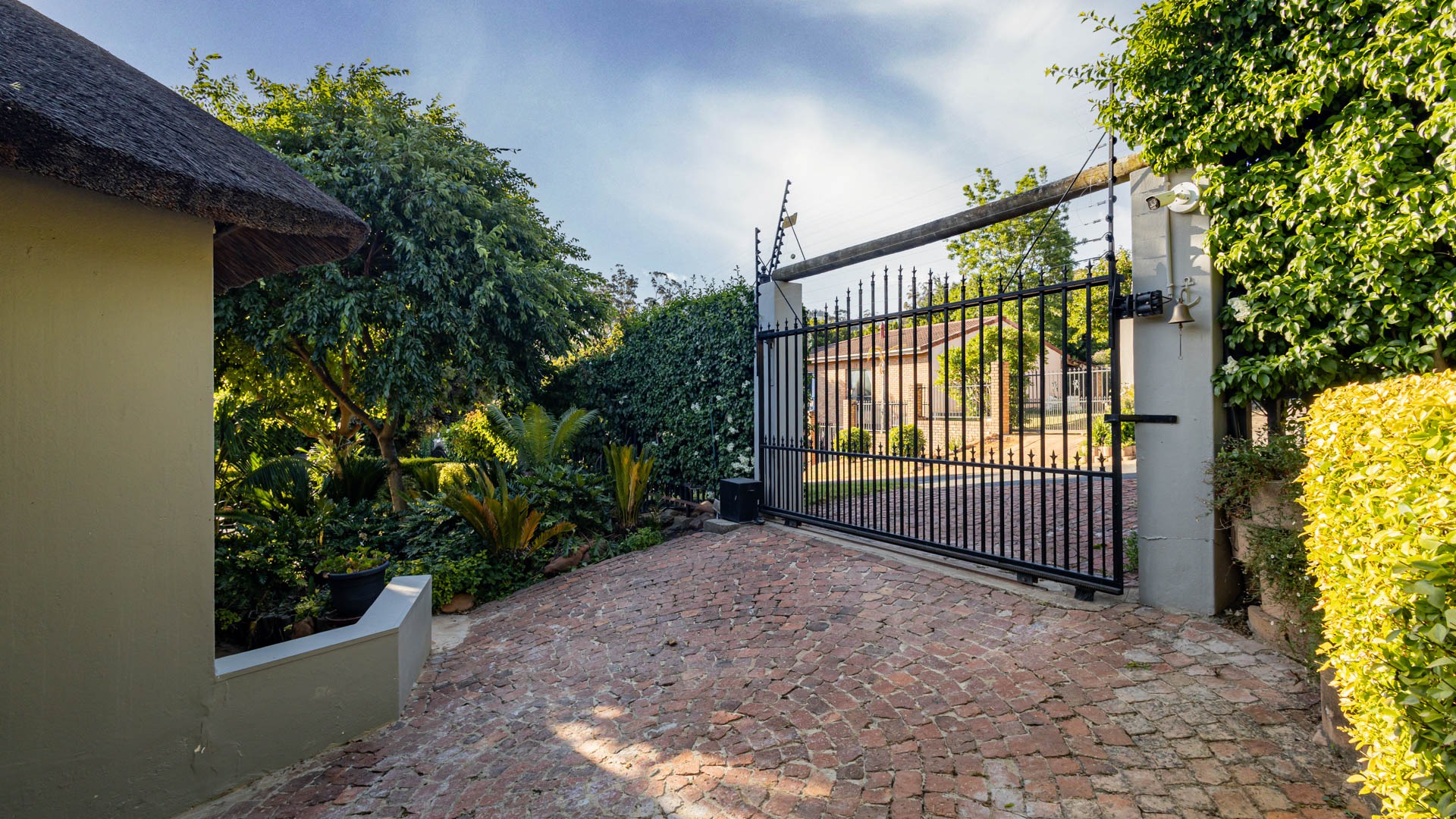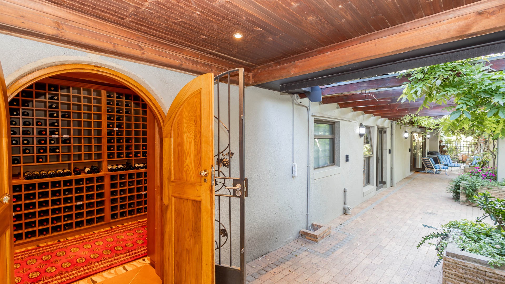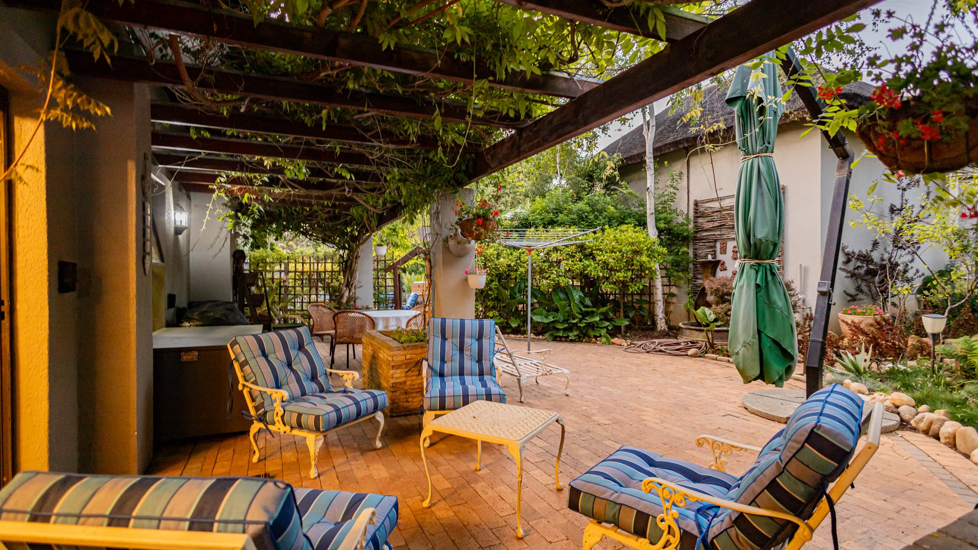 The main residence is spacious, versatile and designed for lifestyle living with extensive indoor and outdoor entertainment areas. It includes six bedrooms, five bathrooms, four garages and a wine cellar that can hold around three thousand bottles. The home is supported by strong infrastructure including a borehole producing approximately 4500 litres per hour, two eleven thousand litre storage tanks, full irrigation, a 34 panel solar system with 2 x 12 KW inverters and 12 x 5 kilowatt batteries. Outdoor features include mature landscaped gardens, koi ponds, water features, two fire pits, wendy houses, a Jacuzzi and both gas and wood fireplaces. The kitchen offers a Smeg gas hob and oven together with a second Bosch oven and a built in wood and gas braai in the braai room overlooking the pool. The garden has been established over more than three decades and includes rare trees and plant species that attract abundant birdlife.