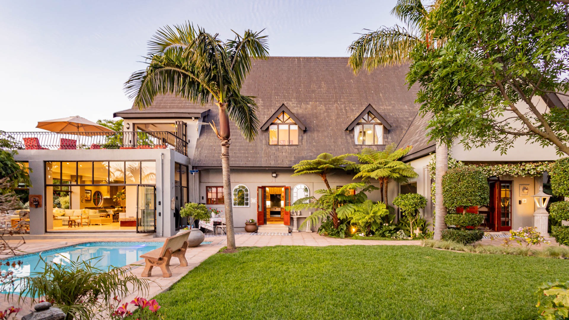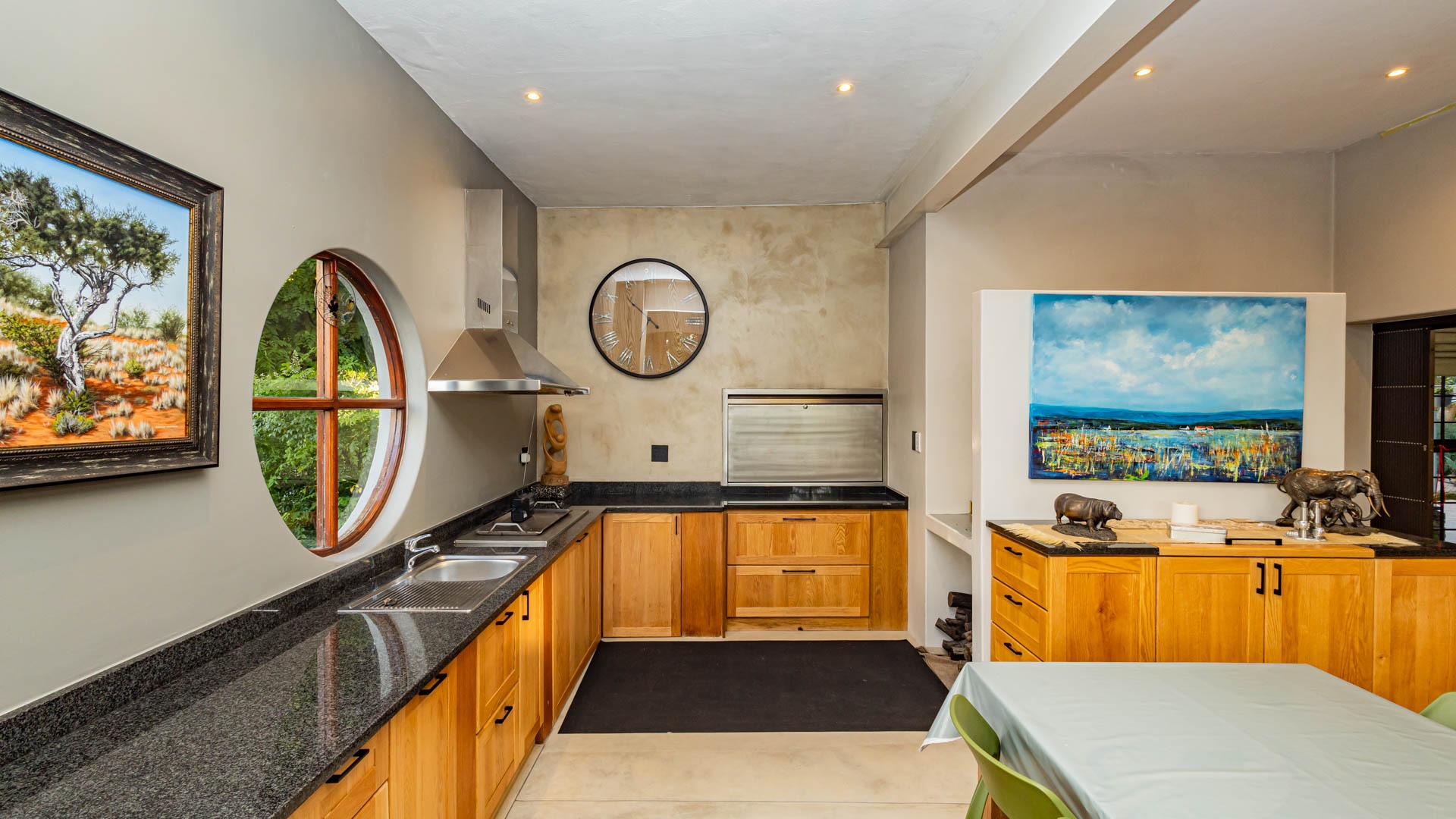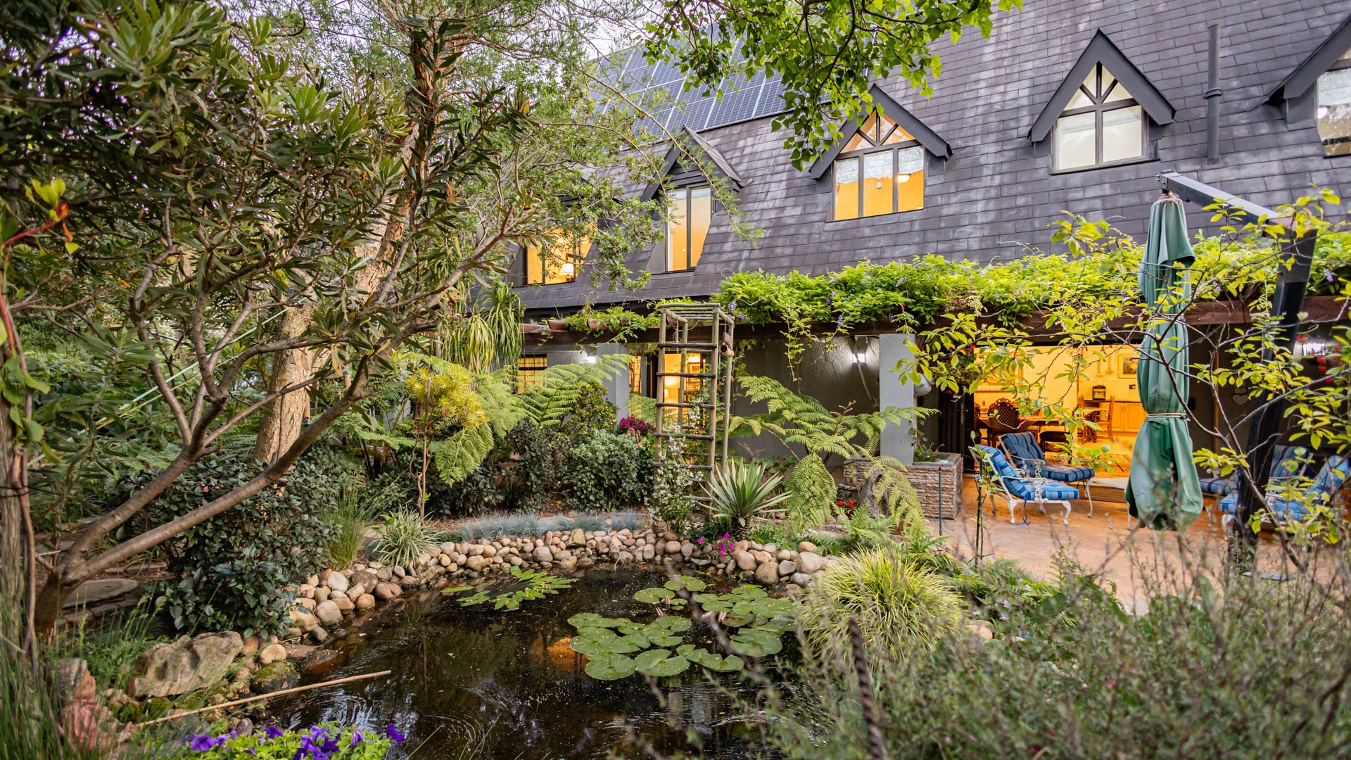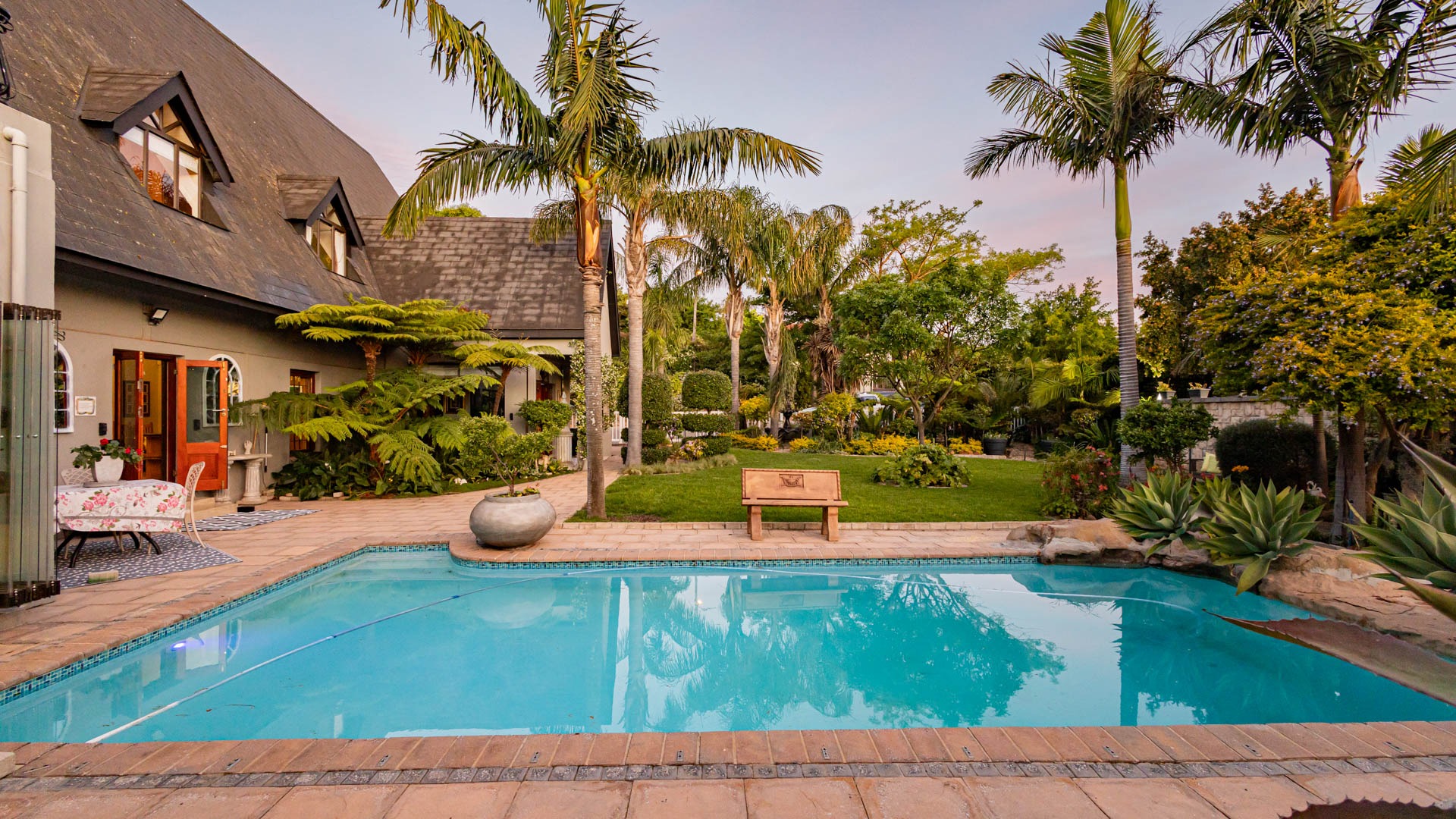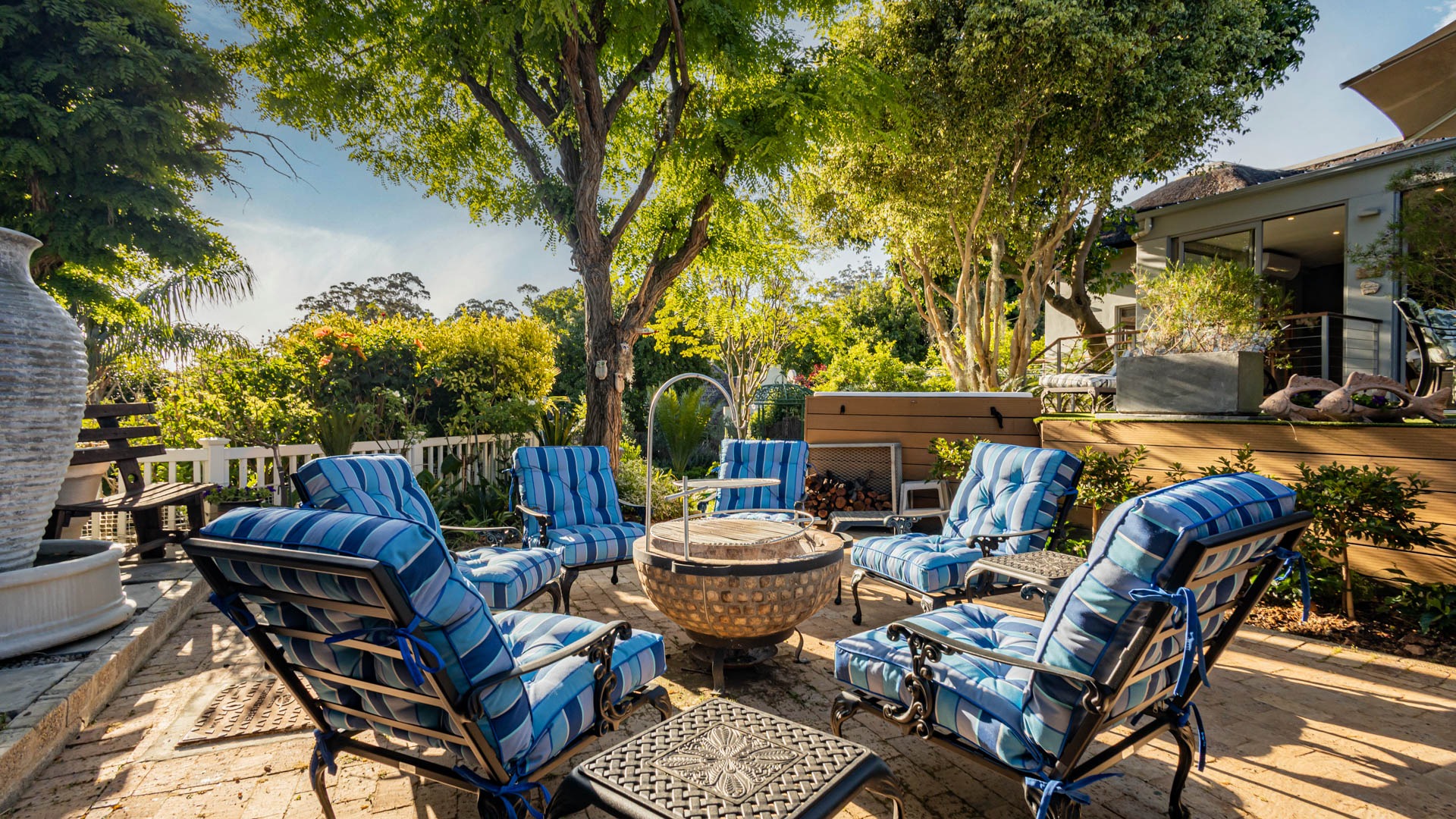The main residence is spacious, versatile and designed for lifestyle living with extensive indoor and outdoor entertainment areas. It includes six bedrooms, five bathrooms, four garages and a wine cellar that can hold around three thousand bottles. The home is supported by strong infrastructure including a borehole producing approximately 4500 litres per hour, two eleven thousand litre storage tanks, full irrigation, a 34 panel solar system with 2 x 12 KW inverters and 12 x 5 kilowatt batteries. Outdoor features include mature landscaped gardens, koi ponds, water features, two fire pits, wendy houses, a Jacuzzi and both gas and wood fireplaces. The kitchen offers a Smeg gas hob and oven together with a second Bosch oven and a built in wood and gas braai in the braai room overlooking the pool. The garden has been established over more than three decades and includes rare trees and plant species that attract abundant birdlife.