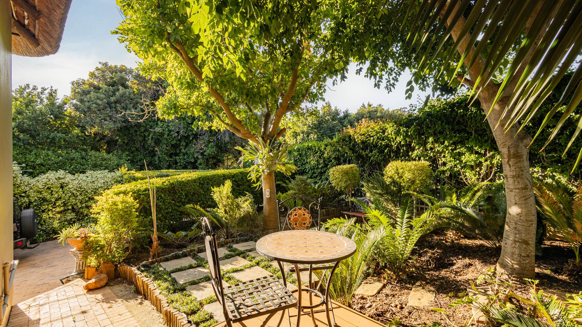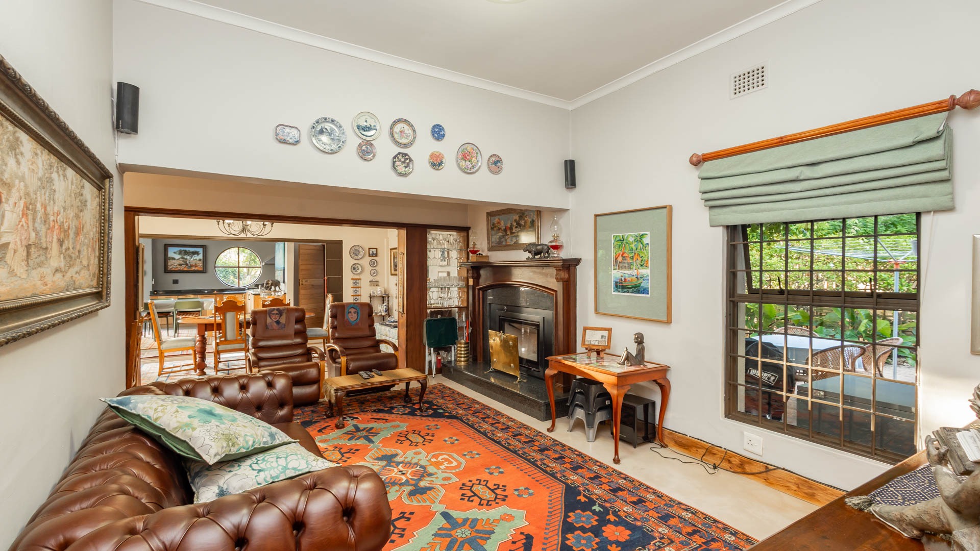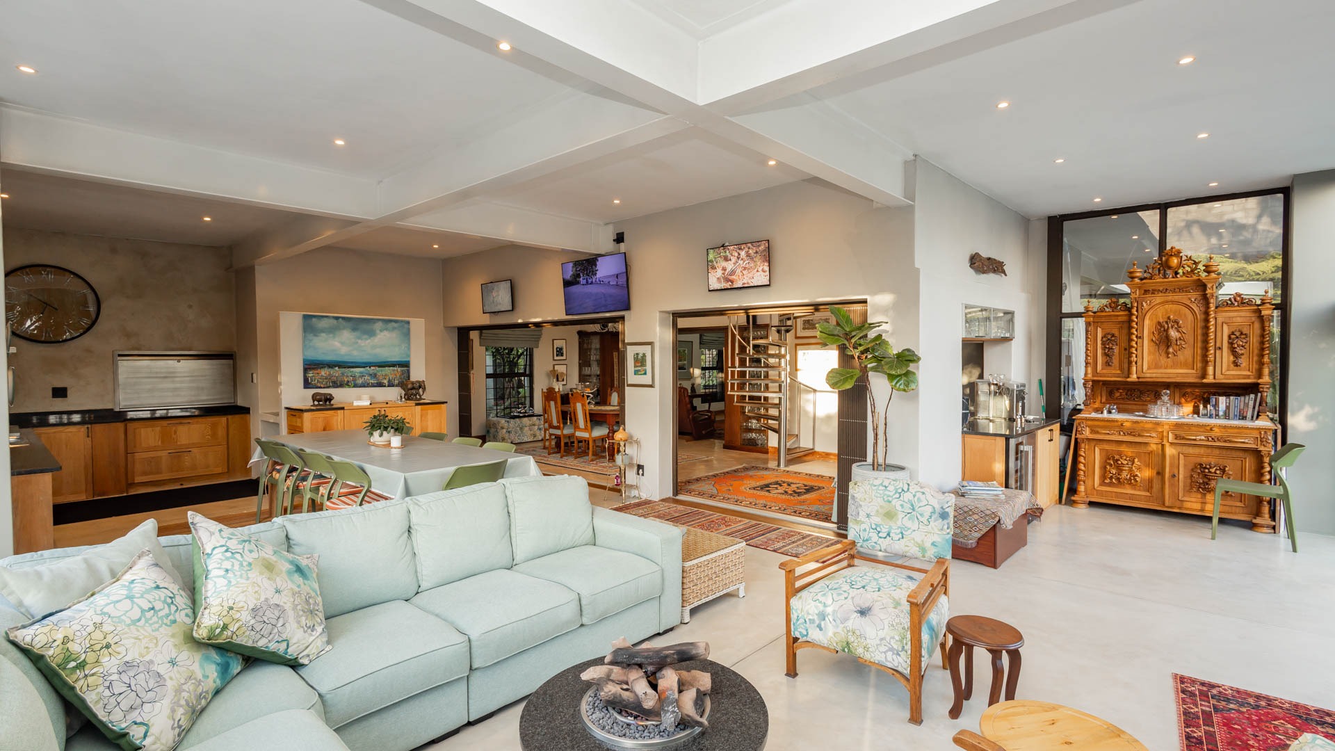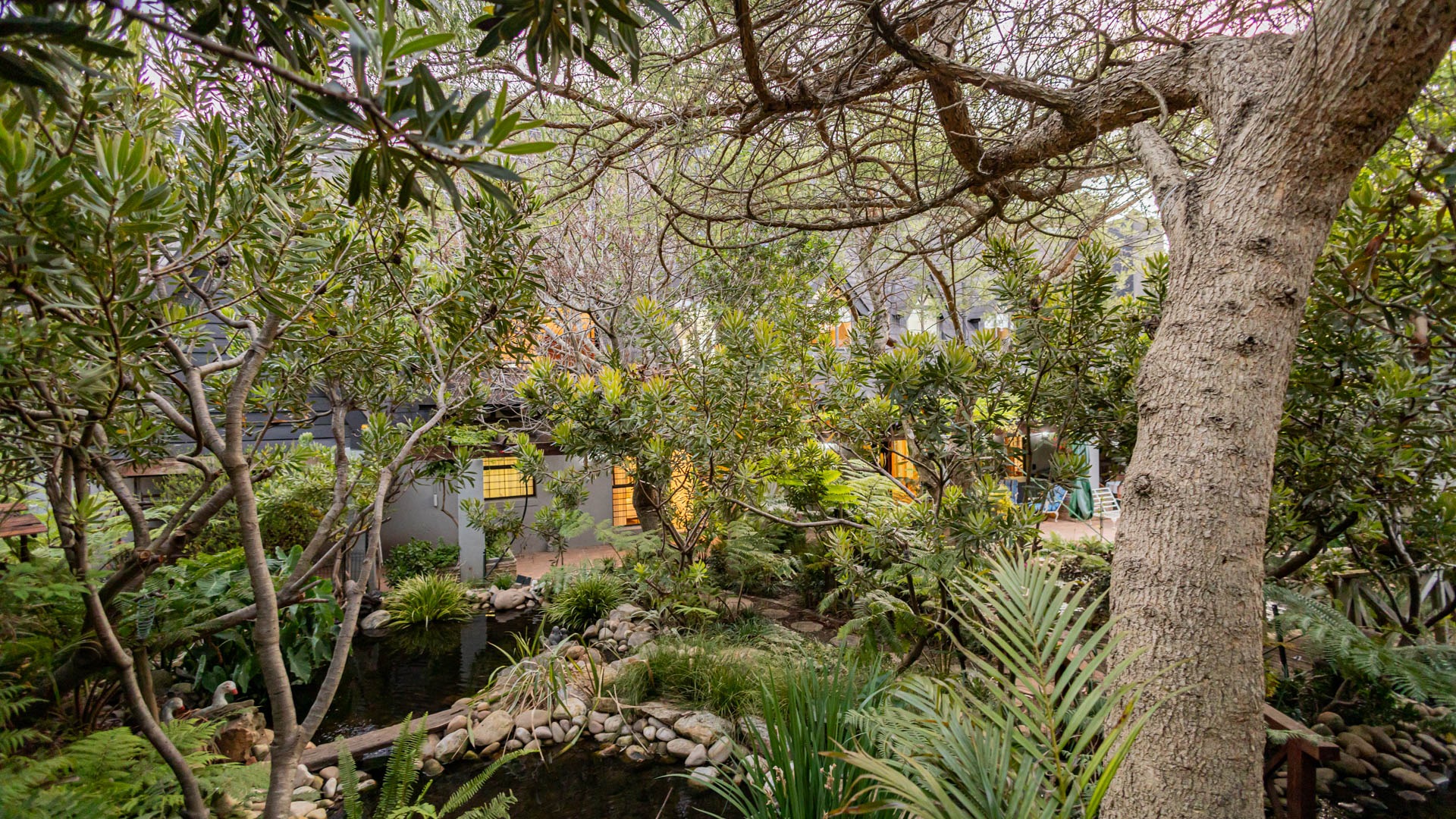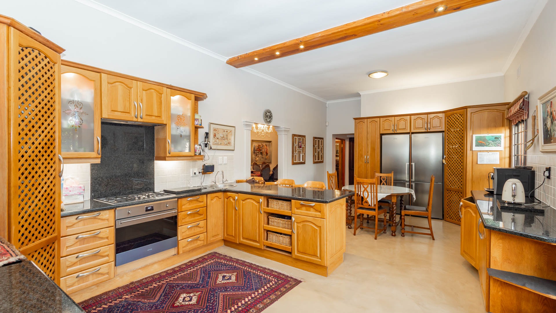 The main residence is spacious, versatile and designed for lifestyle living with extensive indoor and outdoor entertainment areas. It includes six bedrooms, five bathrooms, four garages and a wine cellar that can hold around three thousand bottles. The home is supported by strong infrastructure including a borehole producing approximately 4500 litres per hour, two eleven thousand litre storage tanks, full irrigation, a 34 panel solar system with 2 x 12 KW inverters and 12 x 5 kilowatt batteries. Outdoor features include mature landscaped gardens, koi ponds, water features, two fire pits, wendy houses, a Jacuzzi and both gas and wood fireplaces. The kitchen offers a Smeg gas hob and oven together with a second Bosch oven and a built in wood and gas braai in the braai room overlooking the pool. The garden has been established over more than three decades and includes rare trees and plant species that attract abundant birdlife.