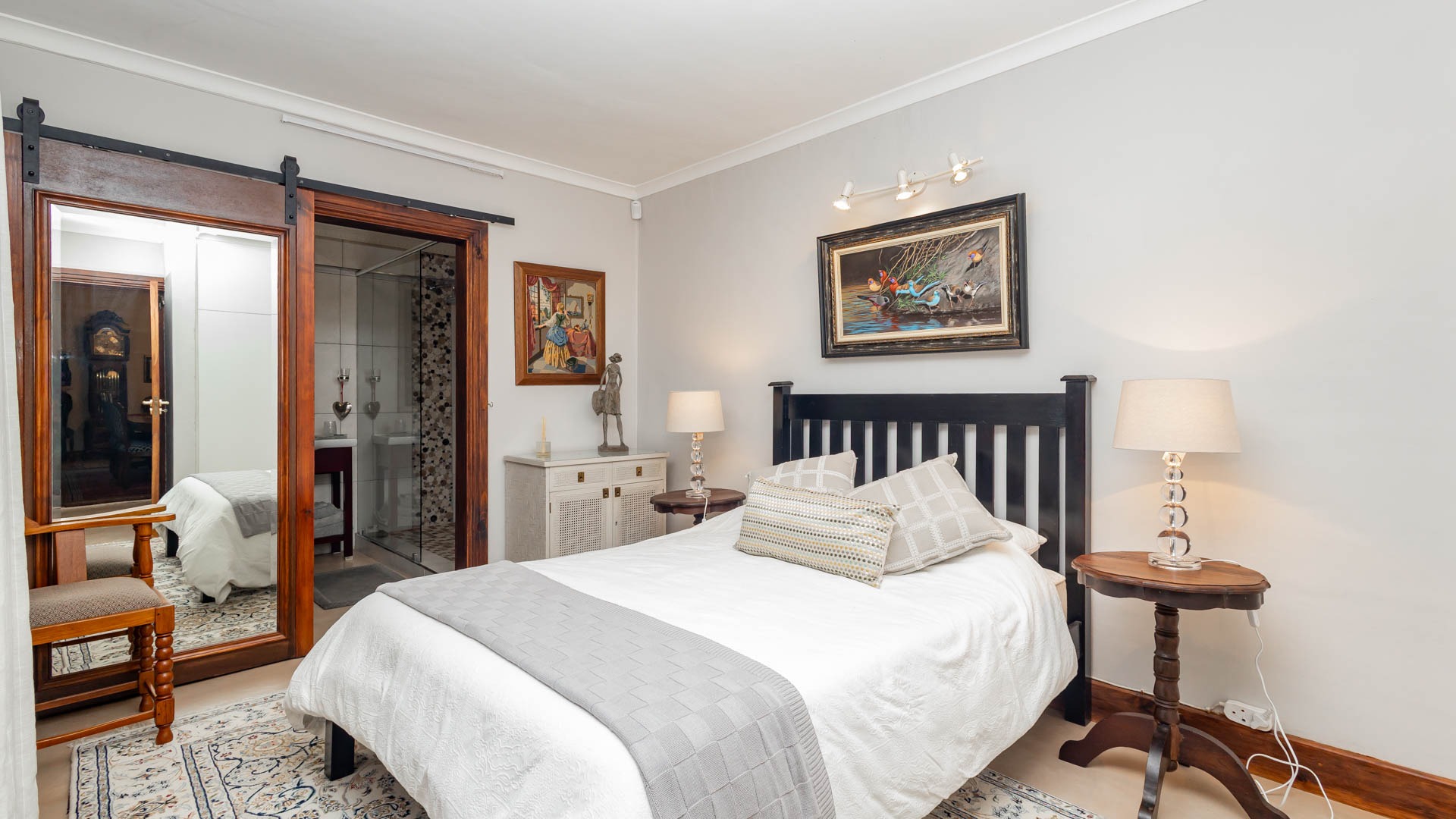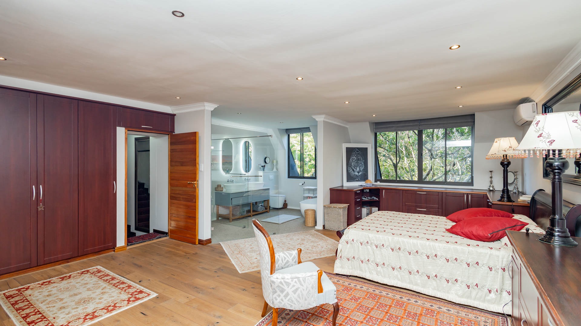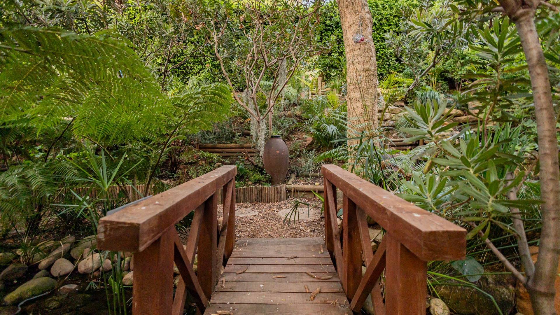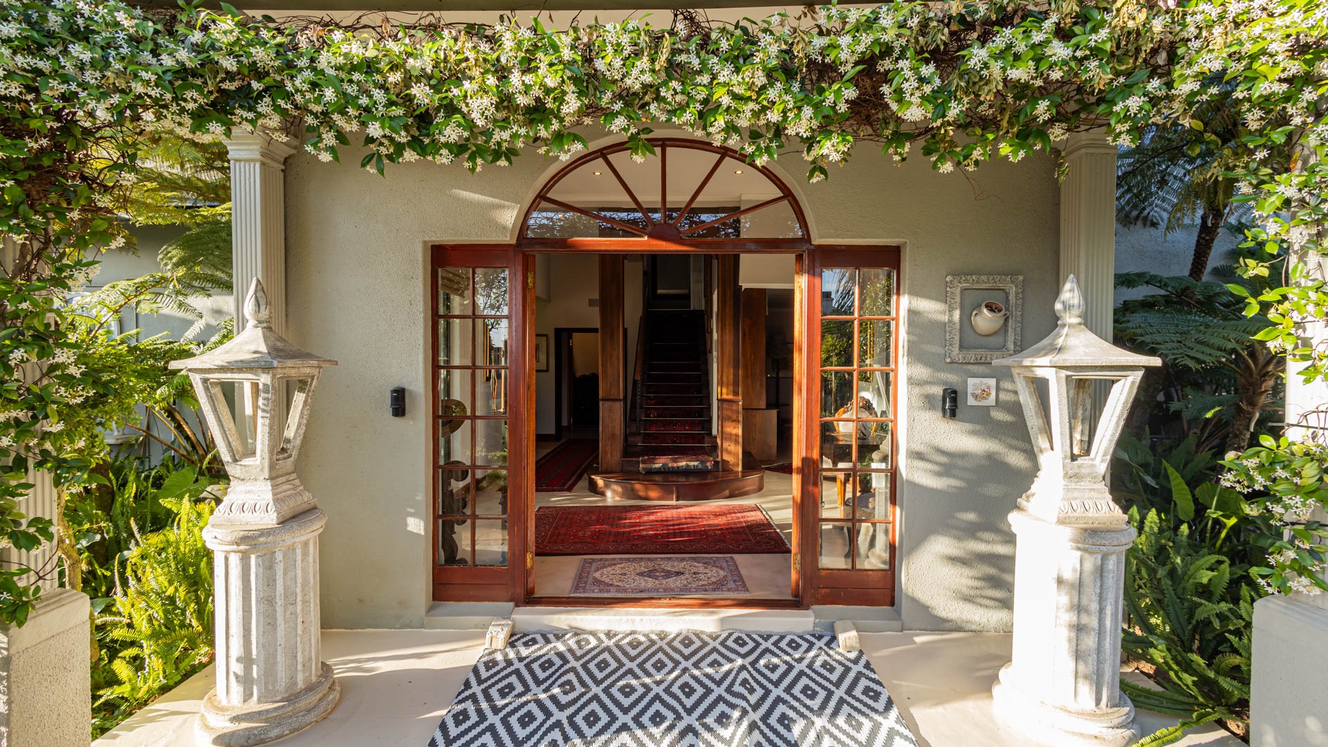 The main residence is spacious, versatile and designed for lifestyle living with extensive indoor and outdoor entertainment areas. It includes six bedrooms, five bathrooms, four garages and a wine cellar that can hold around three thousand bottles. The home is supported by strong infrastructure including a borehole producing approximately 4500 litres per hour, two eleven thousand litre storage tanks, full irrigation, a 34 panel solar system with 2 x 12 KW inverters and 12 x 5 kilowatt batteries. Outdoor features include mature landscaped gardens, koi ponds, water features, two fire pits, wendy houses, a Jacuzzi and both gas and wood fireplaces. The kitchen offers a Smeg gas hob and oven together with a second Bosch oven and a built in wood and gas braai in the braai room overlooking the pool. The garden has been established over more than three decades and includes rare trees and plant species that attract abundant birdlife.