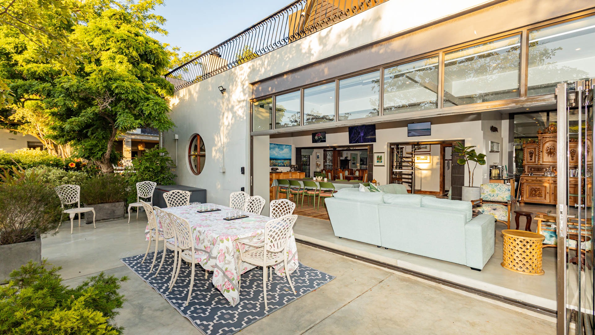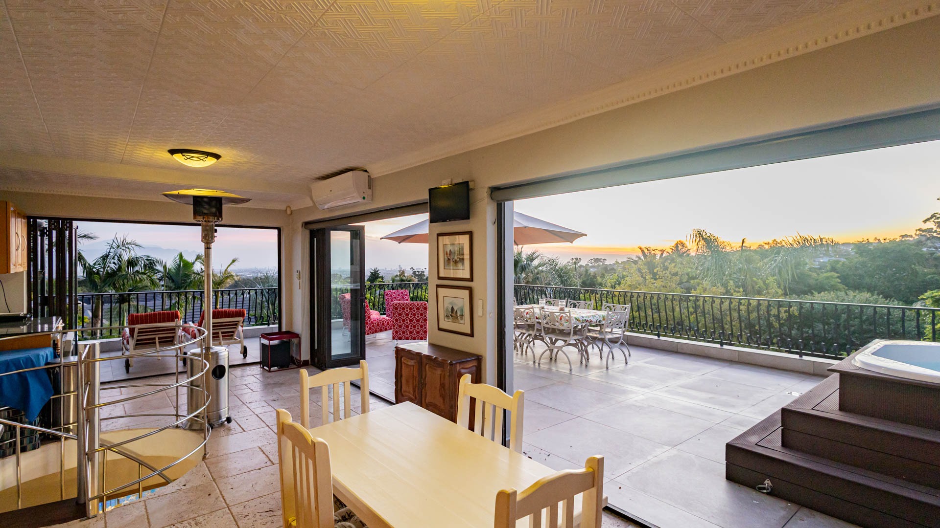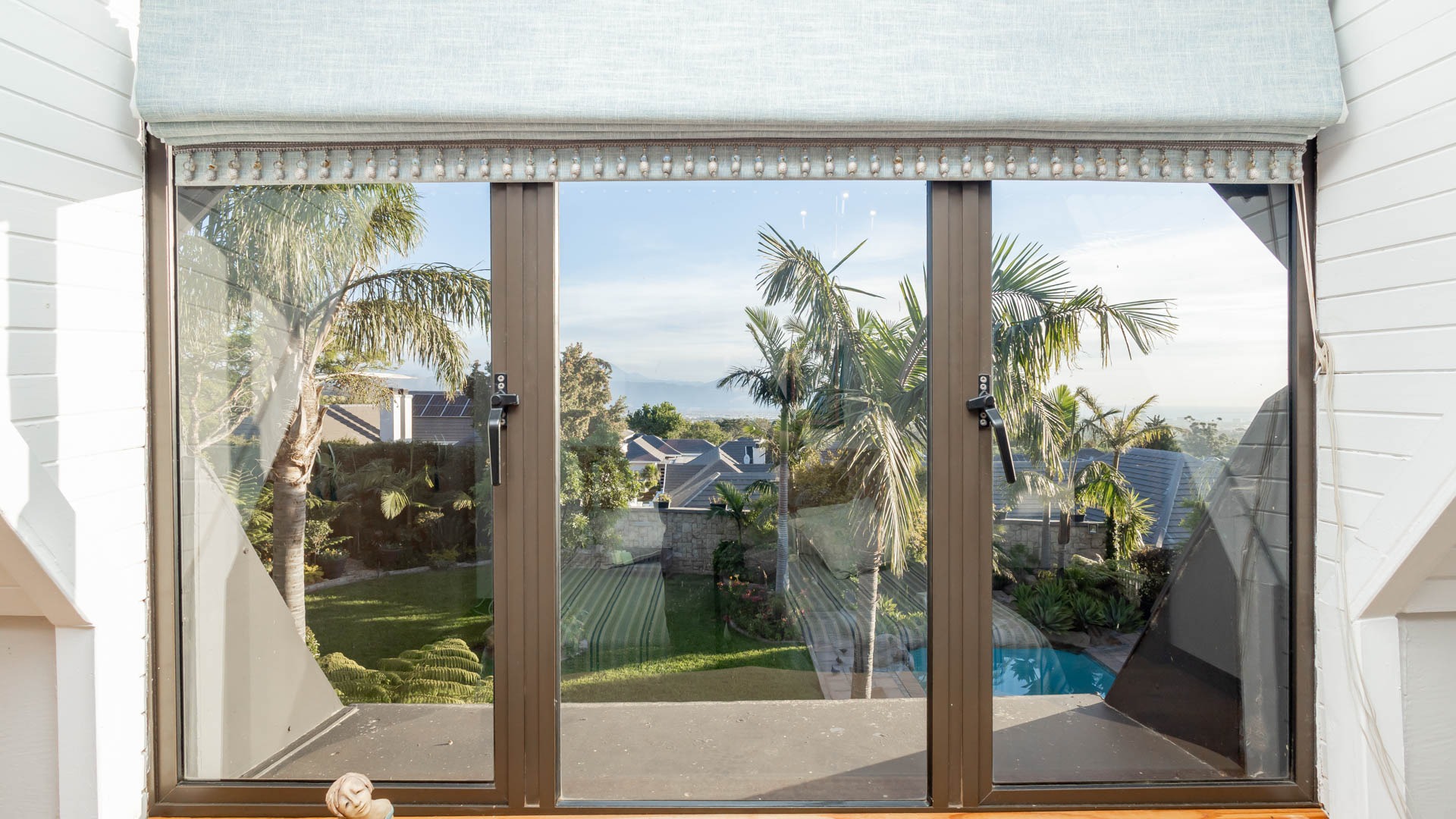 Automated blinds on frameless glass stacking doors in the braai room upstairs and downstairs