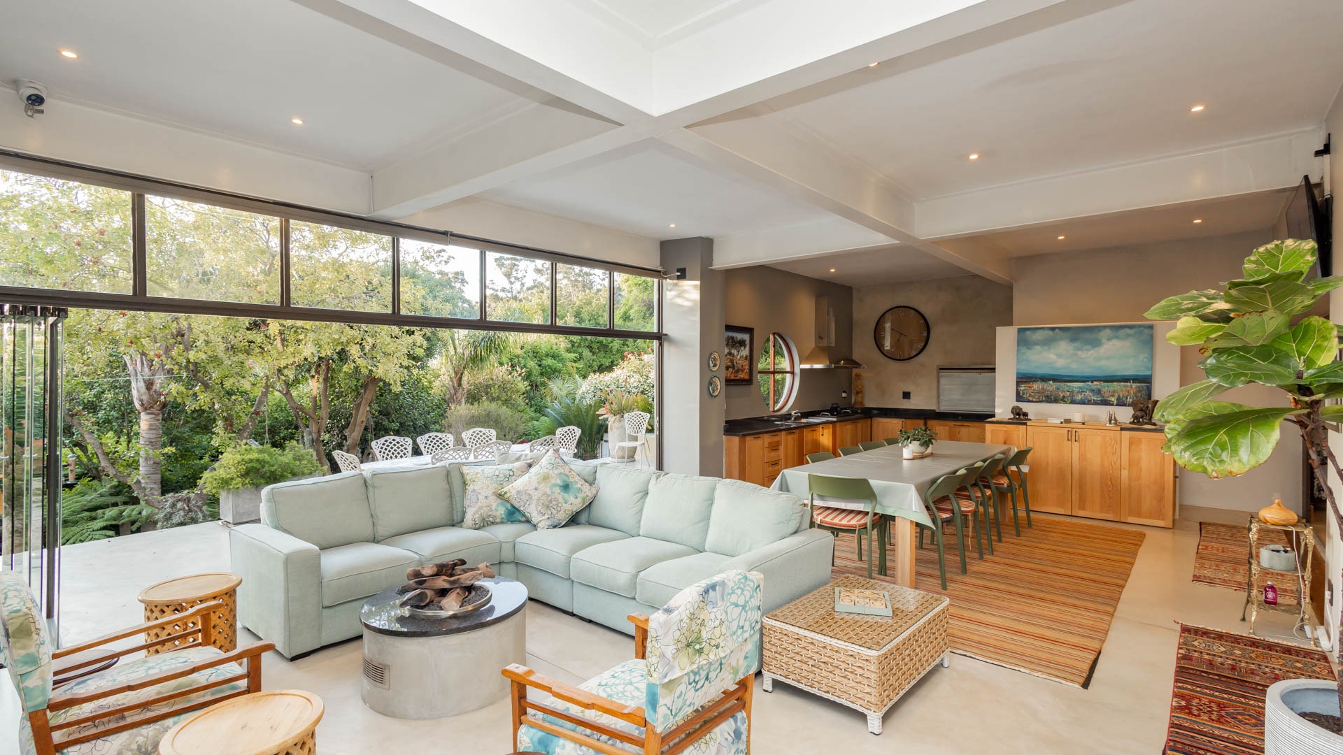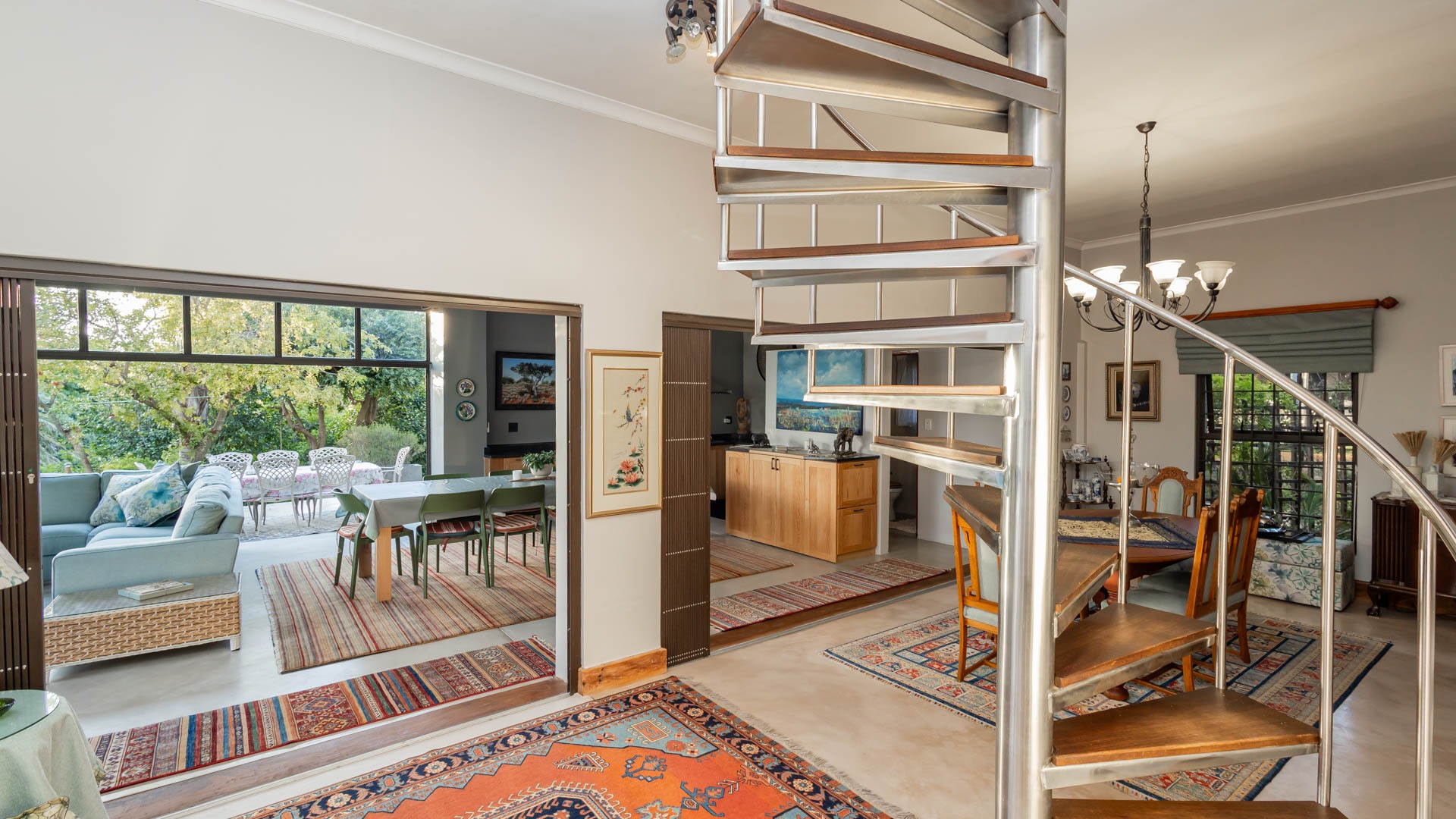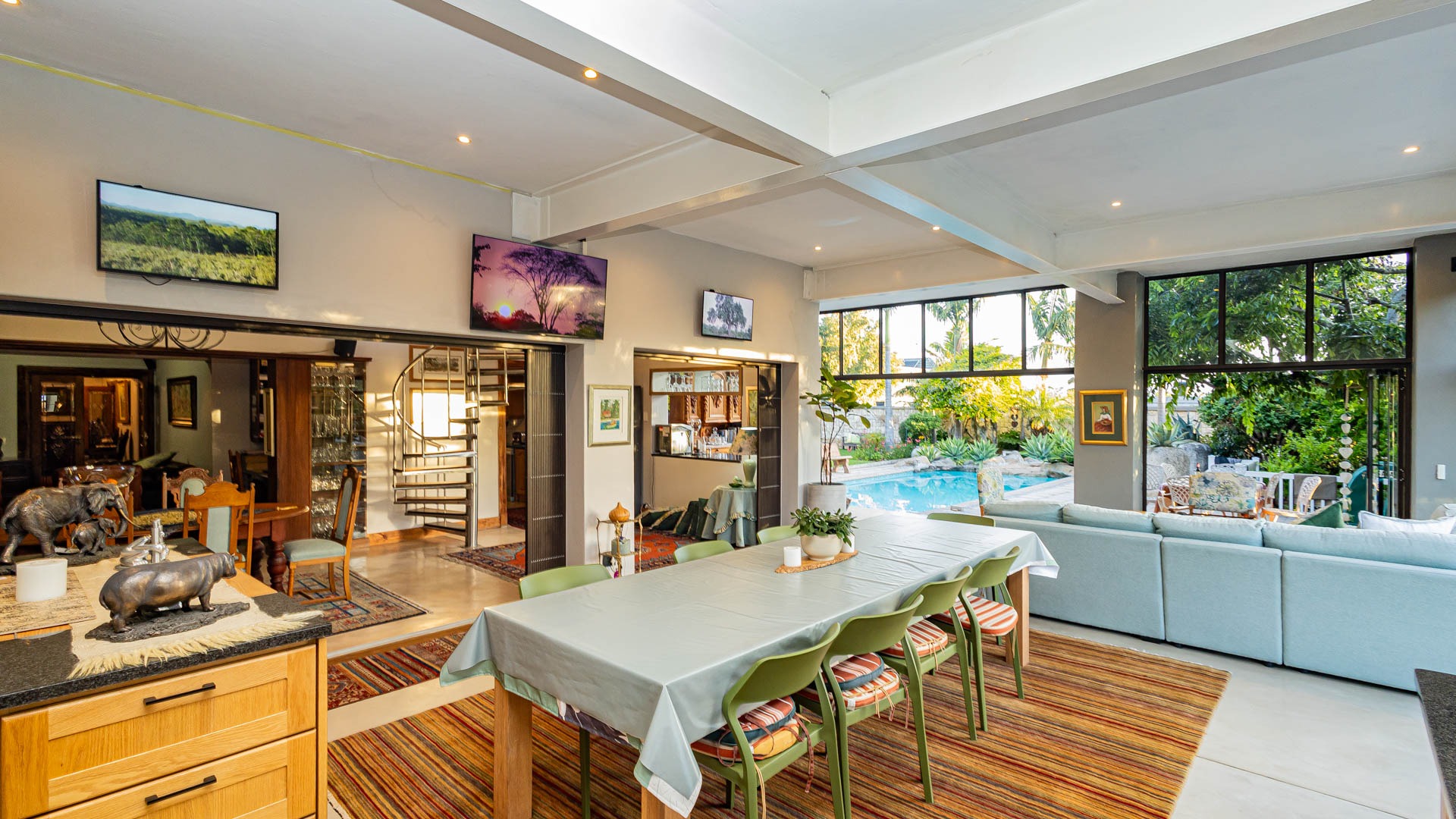 Automated blinds on frameless glass stacking doors in the braai room upstairs and downstairs