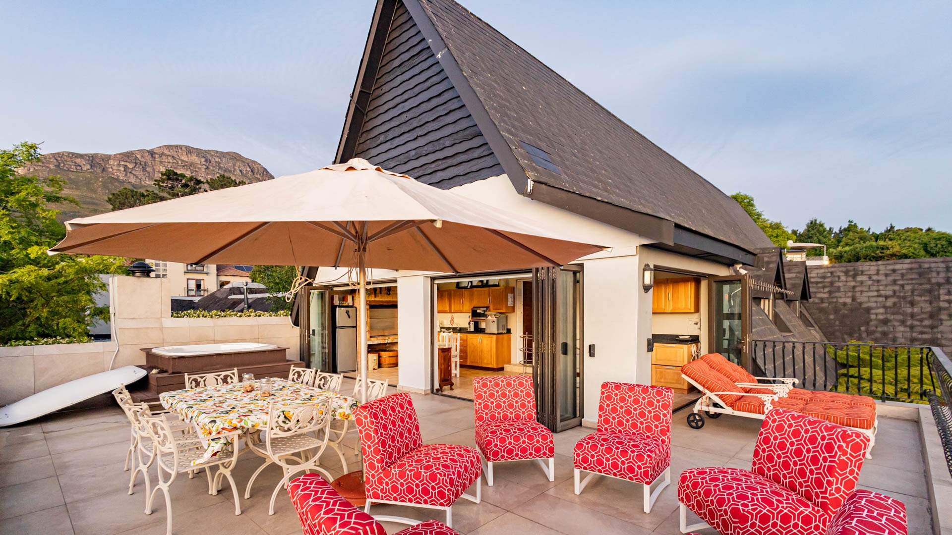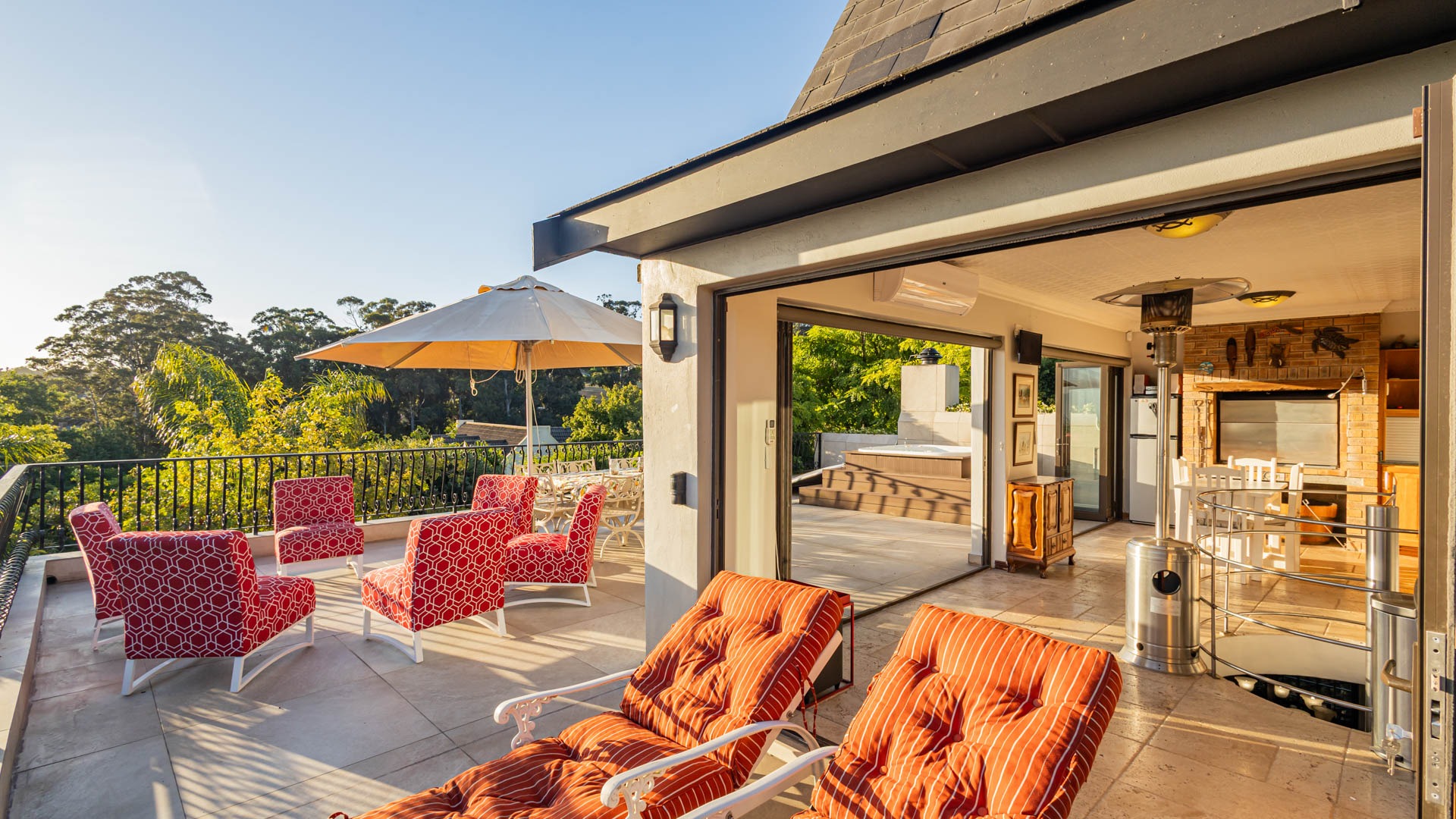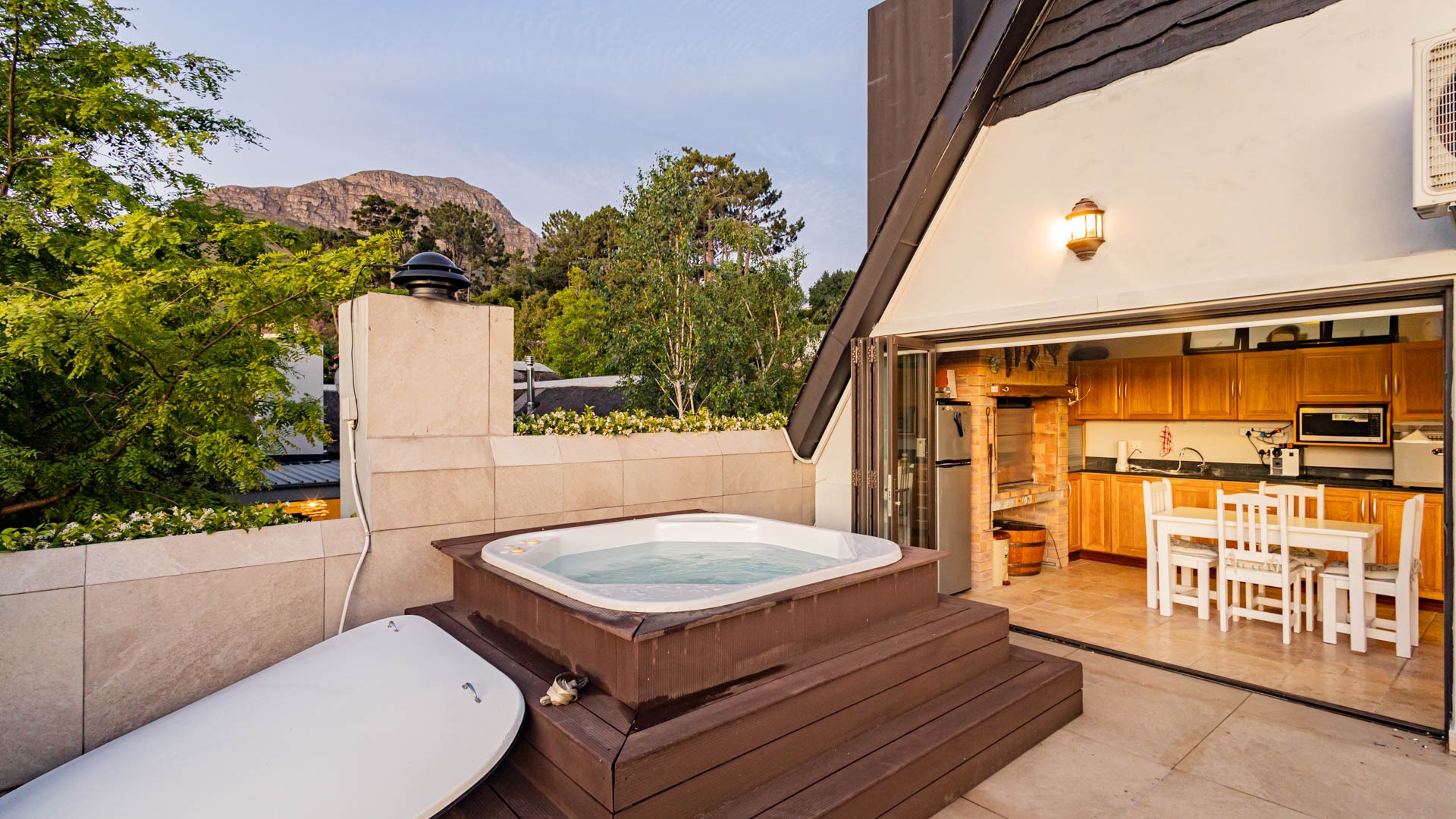 Jacuzzi upstairs on the lookout deck with a second braai room and kitchen