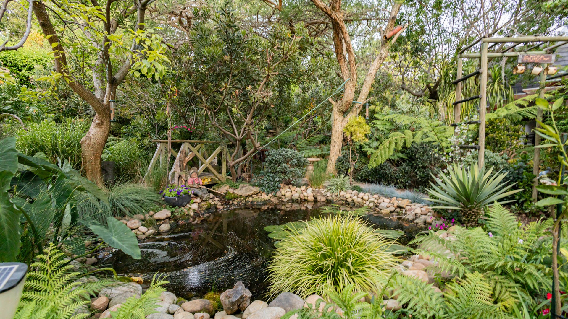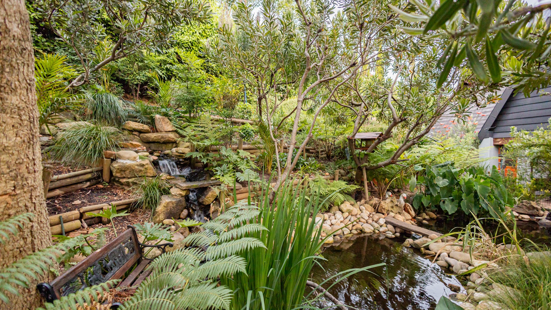 Multiple water features including two large ponds, a waterfall and a koi dam
