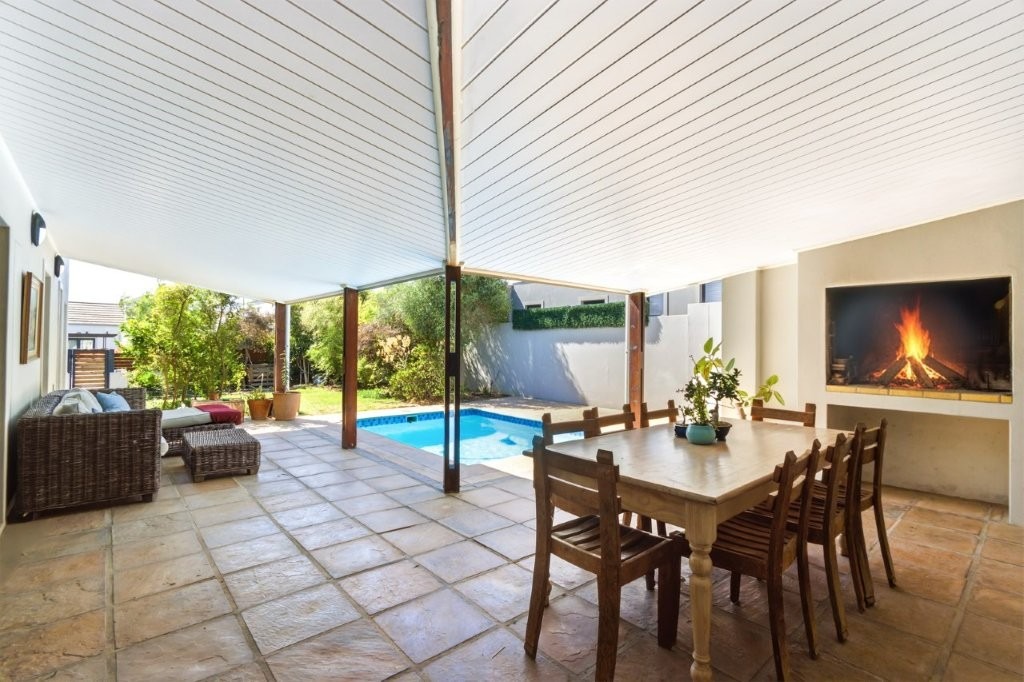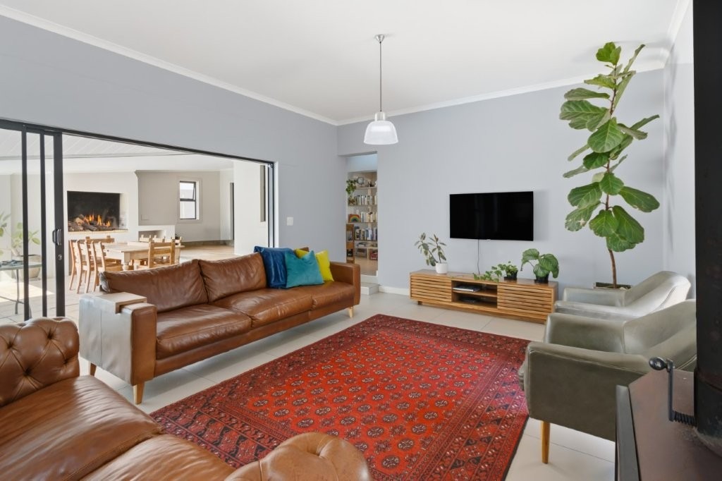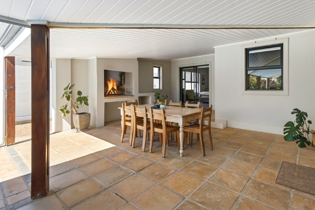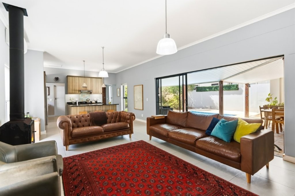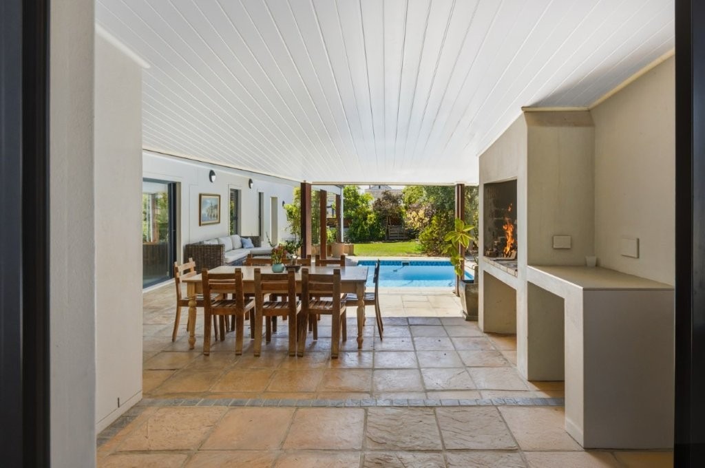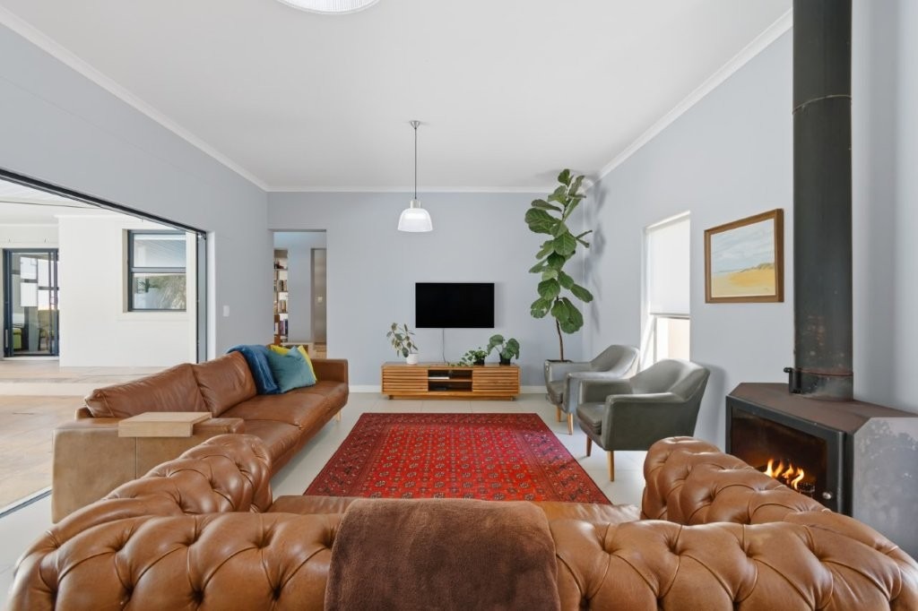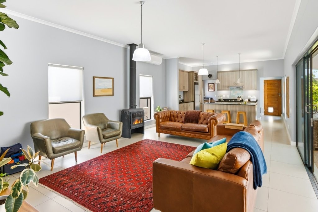 • Spacious dining and living area featuring a wood burning fireplace, with sliding glass doors opening onto a wraparound undercover stoep and undercover braai area